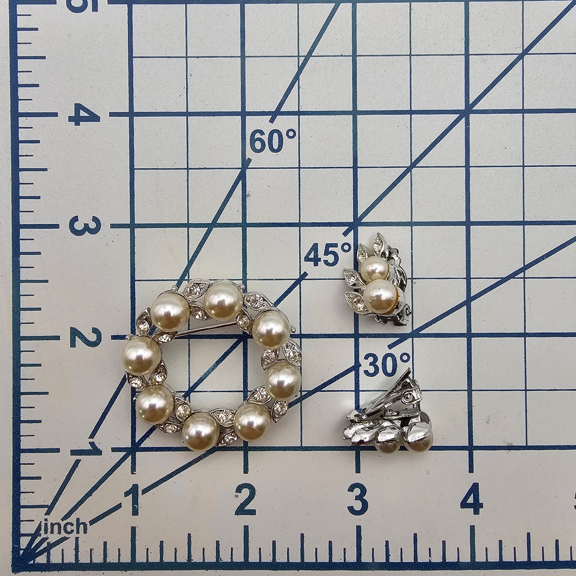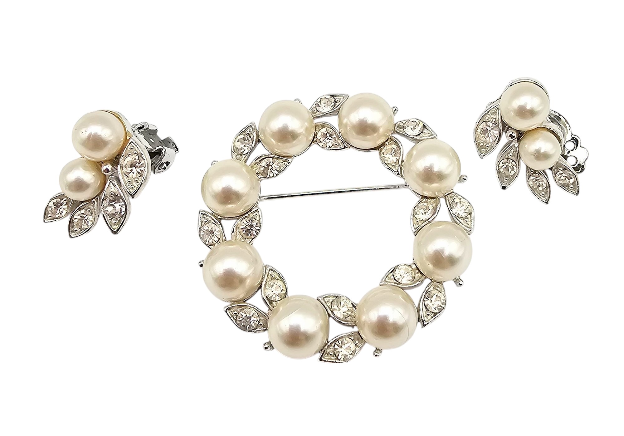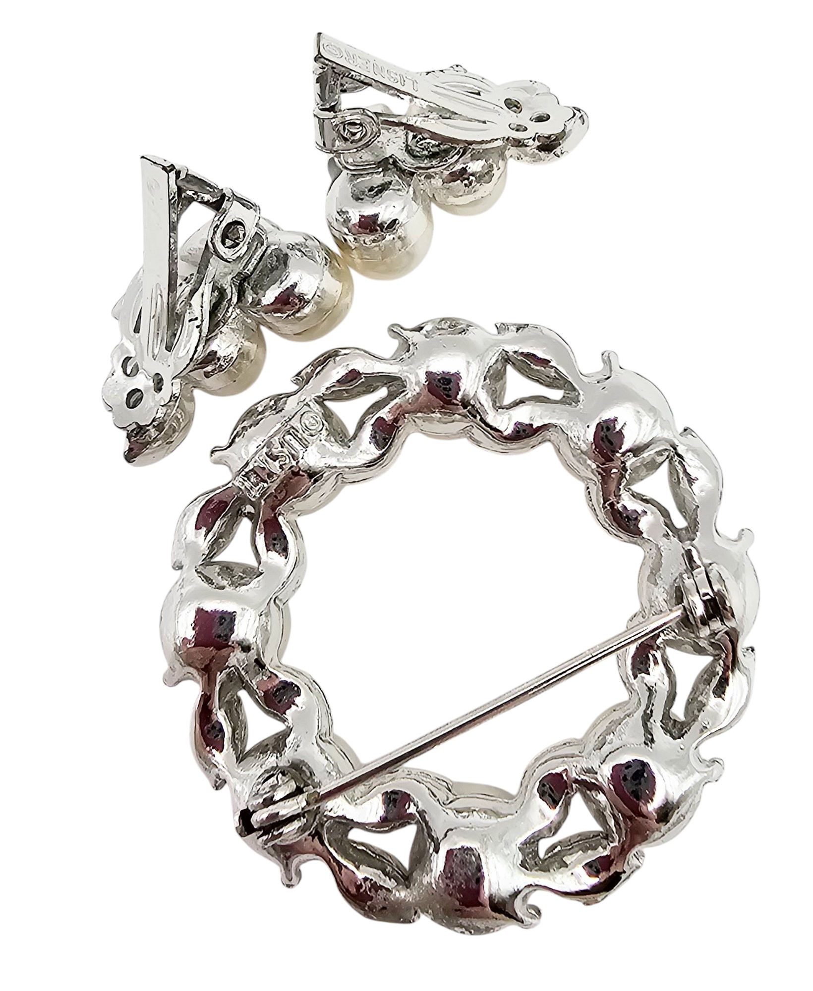 Lisner Vintage Faux Pearl Rhinestone Silver Tone Wreath Brooch Earrings Set