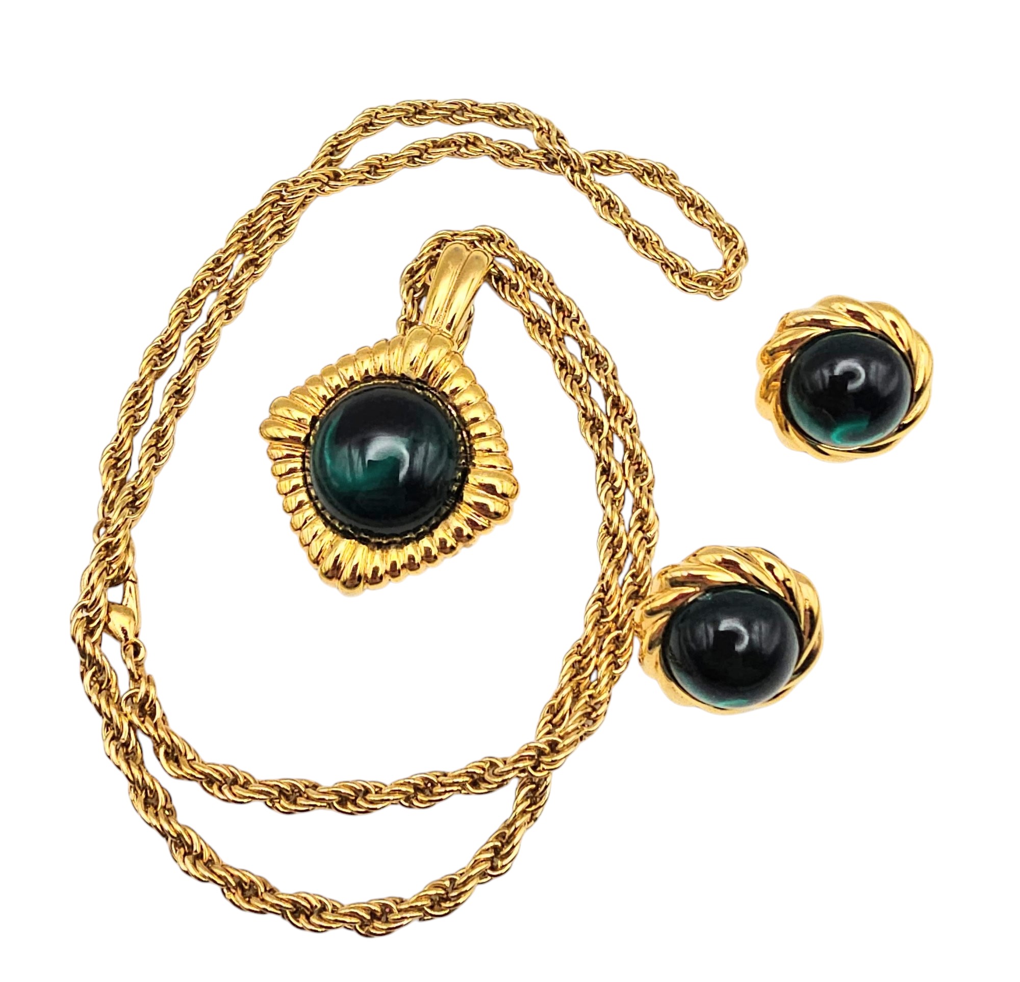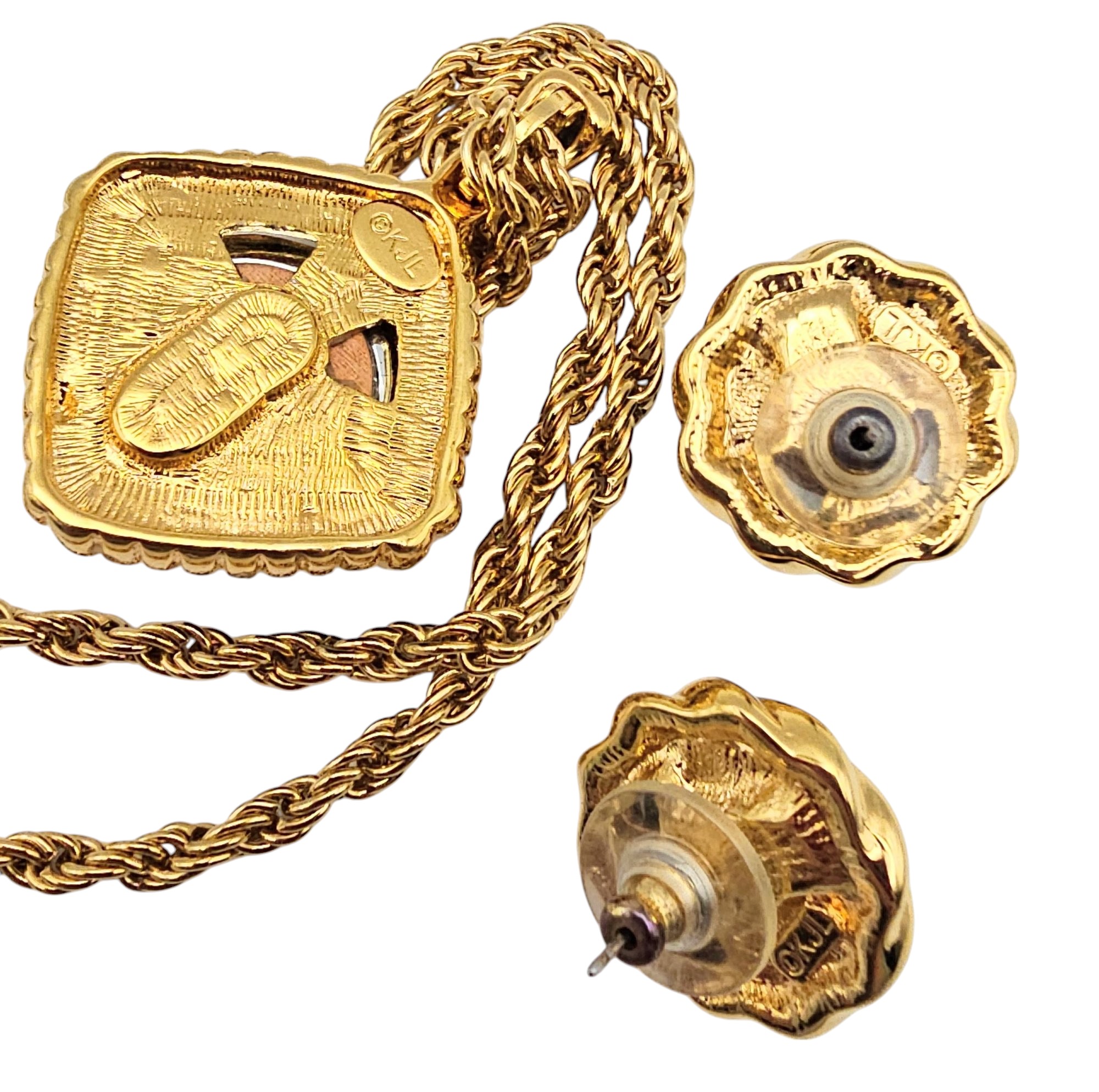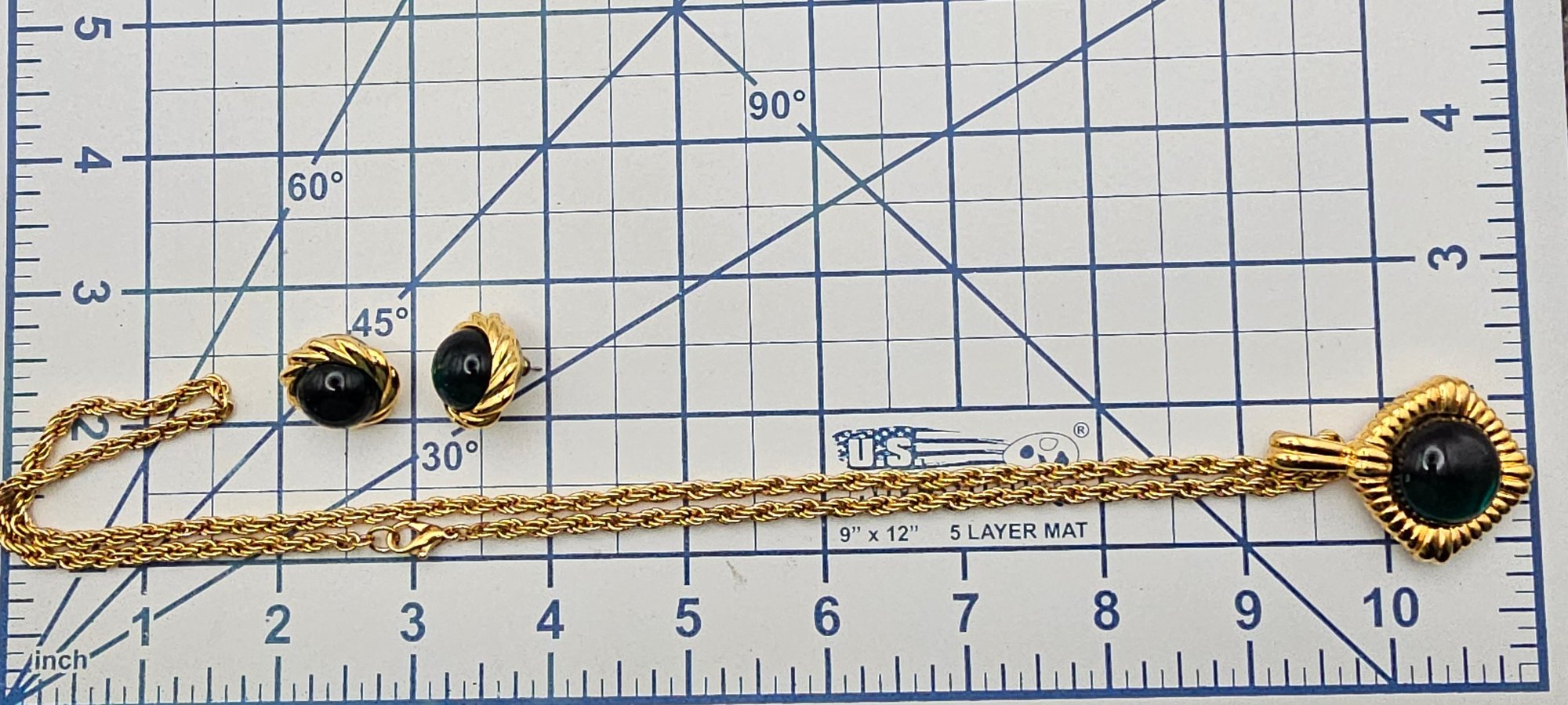 Kennith J Lane Green Center Gold Tone Necklace Earrings Set