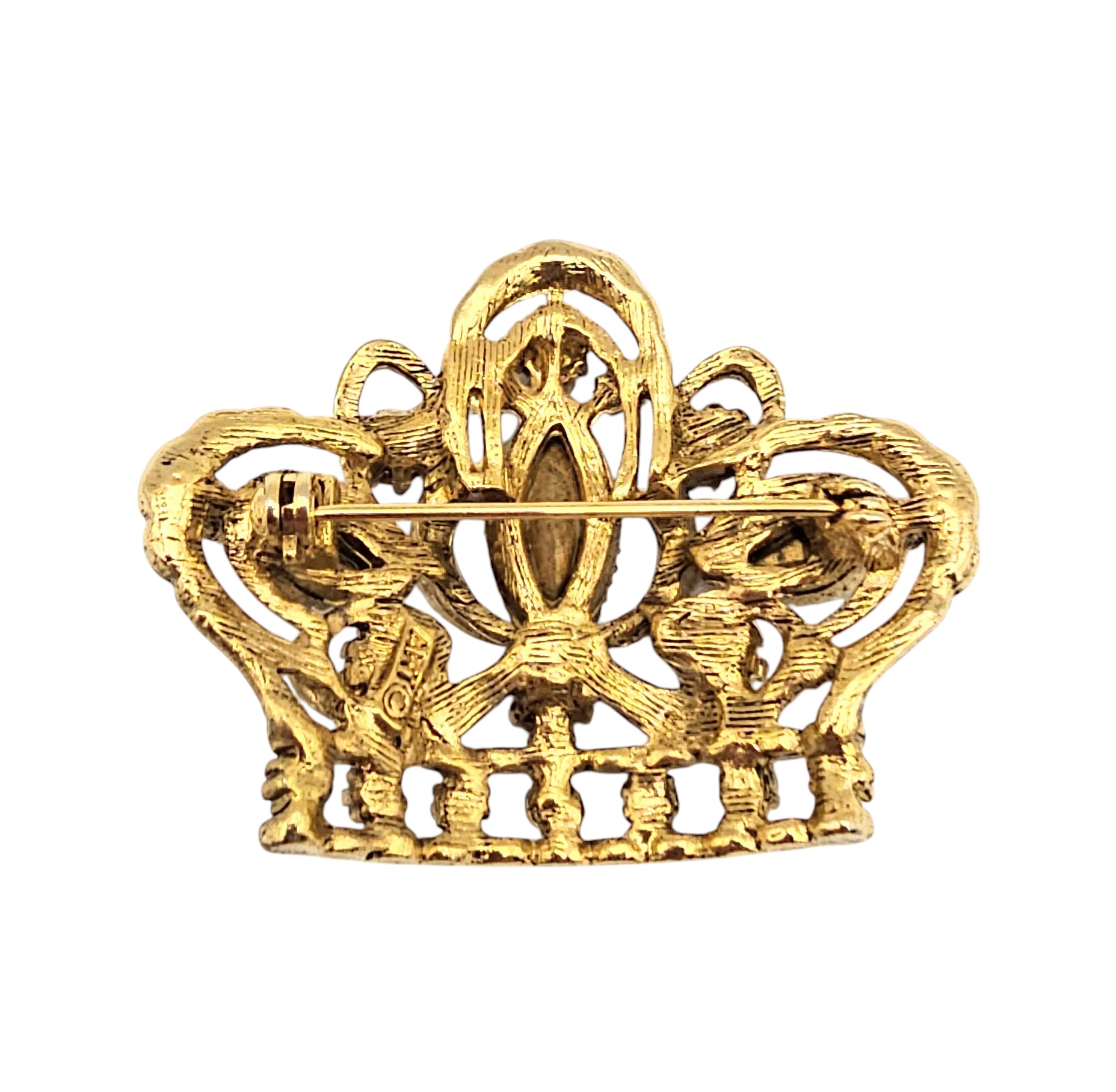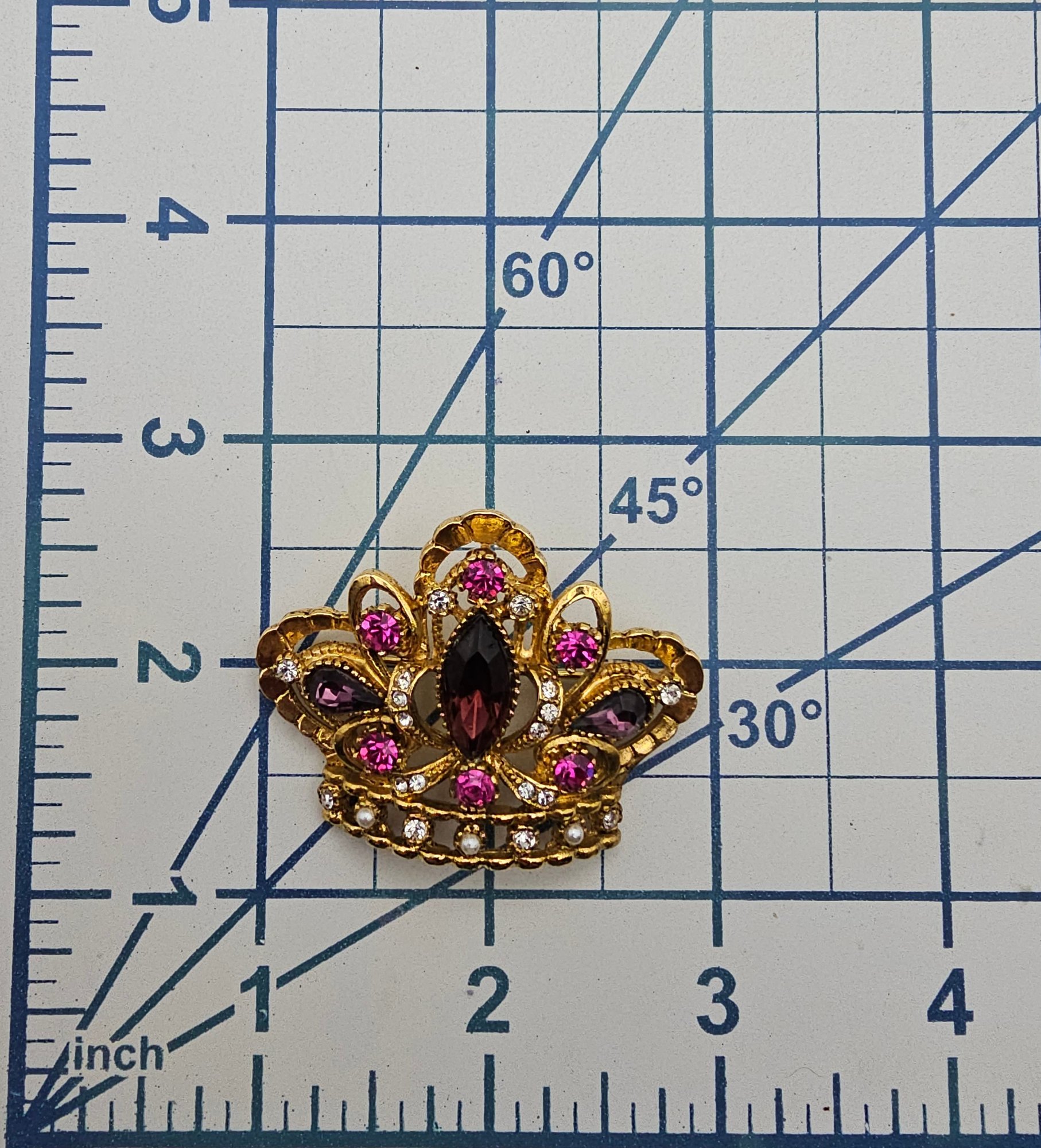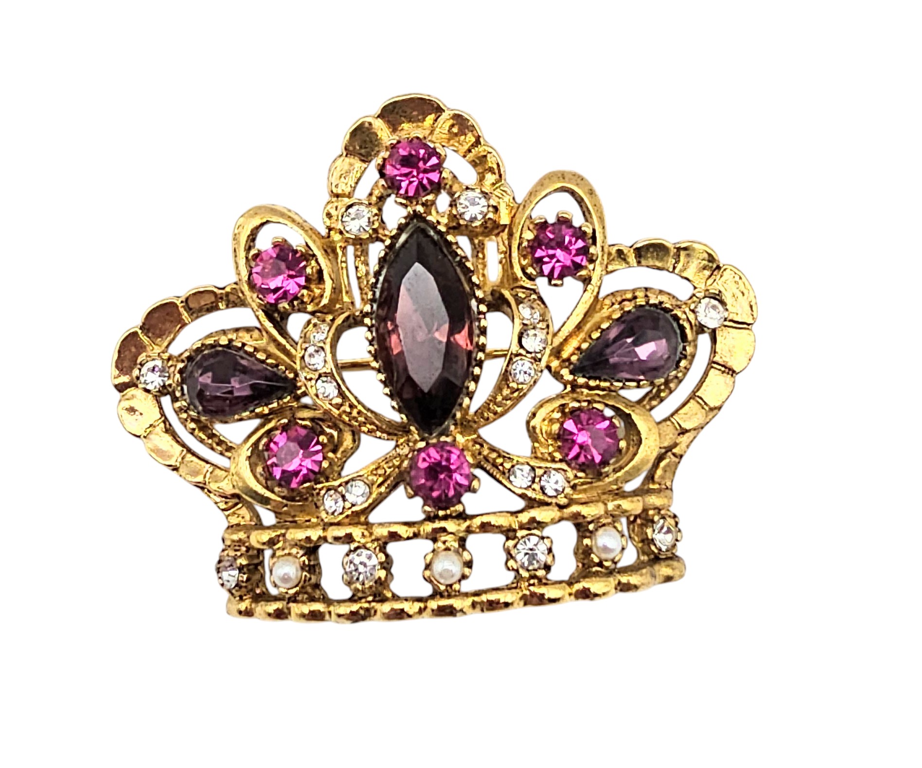 ART Purple Pink Rhinestone Faux Pearl Gold Tone Crown Brooch