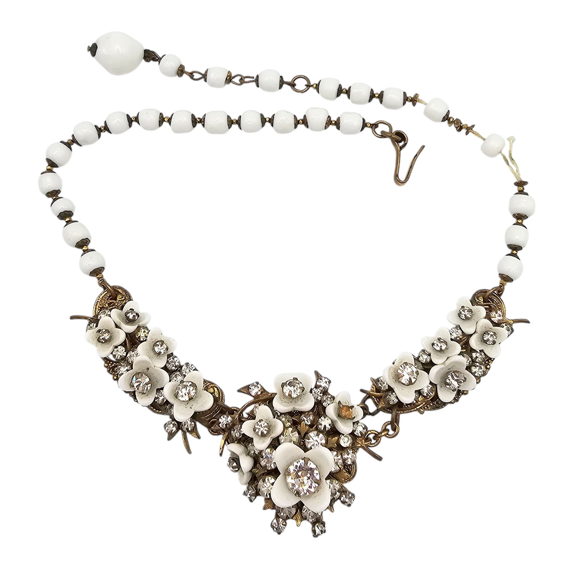 Miriam Haskell White Rhinestone Gold Tone Floral Necklace As is