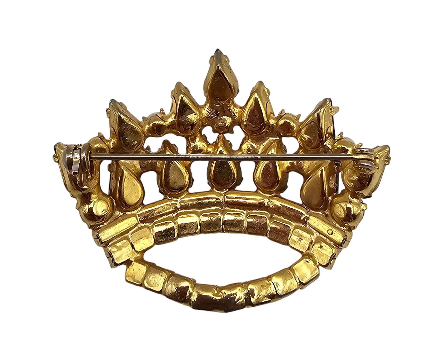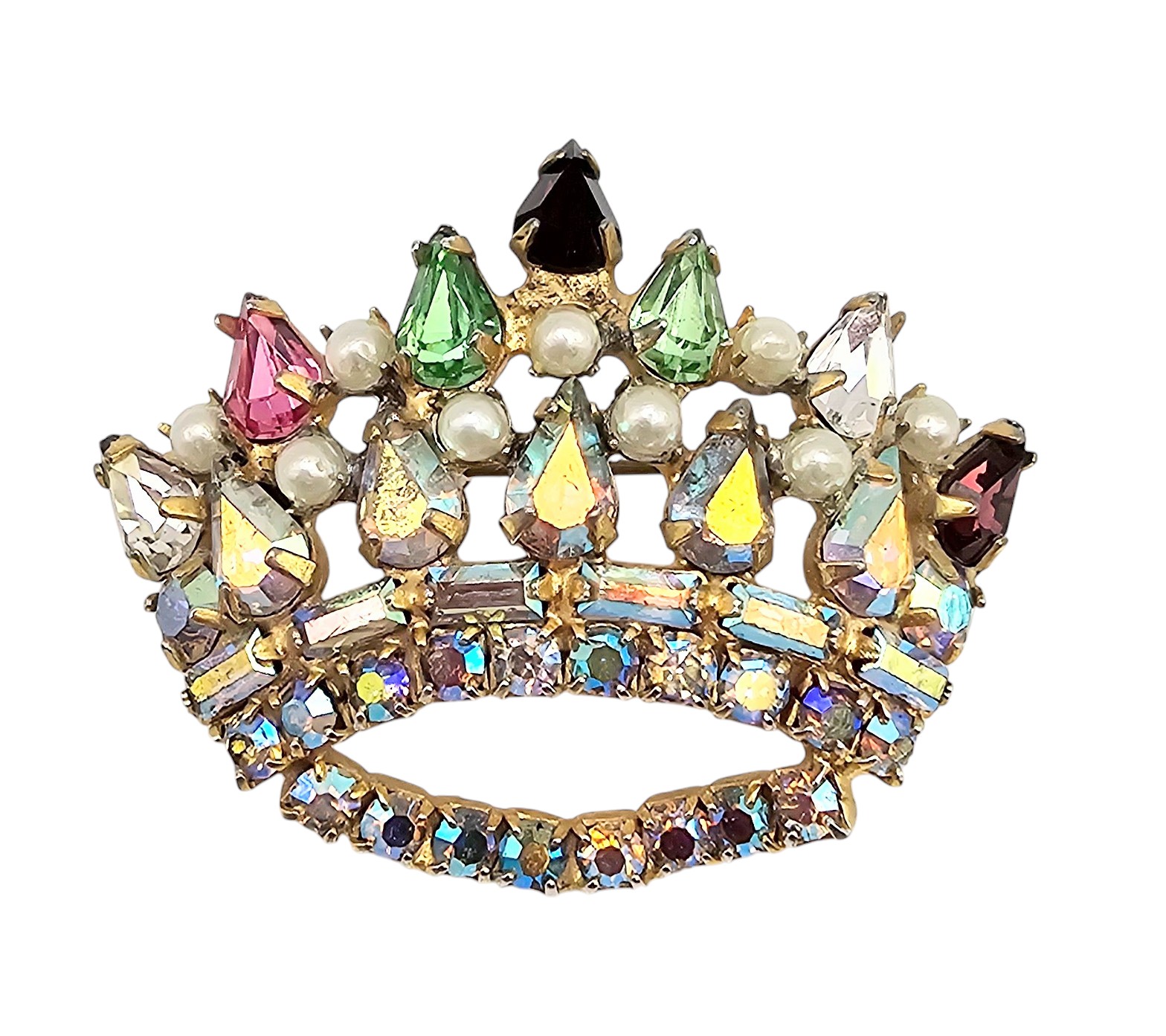 Vintage Iridescent Rhinestone Faux Pearl Silver Tone Crown Brooch