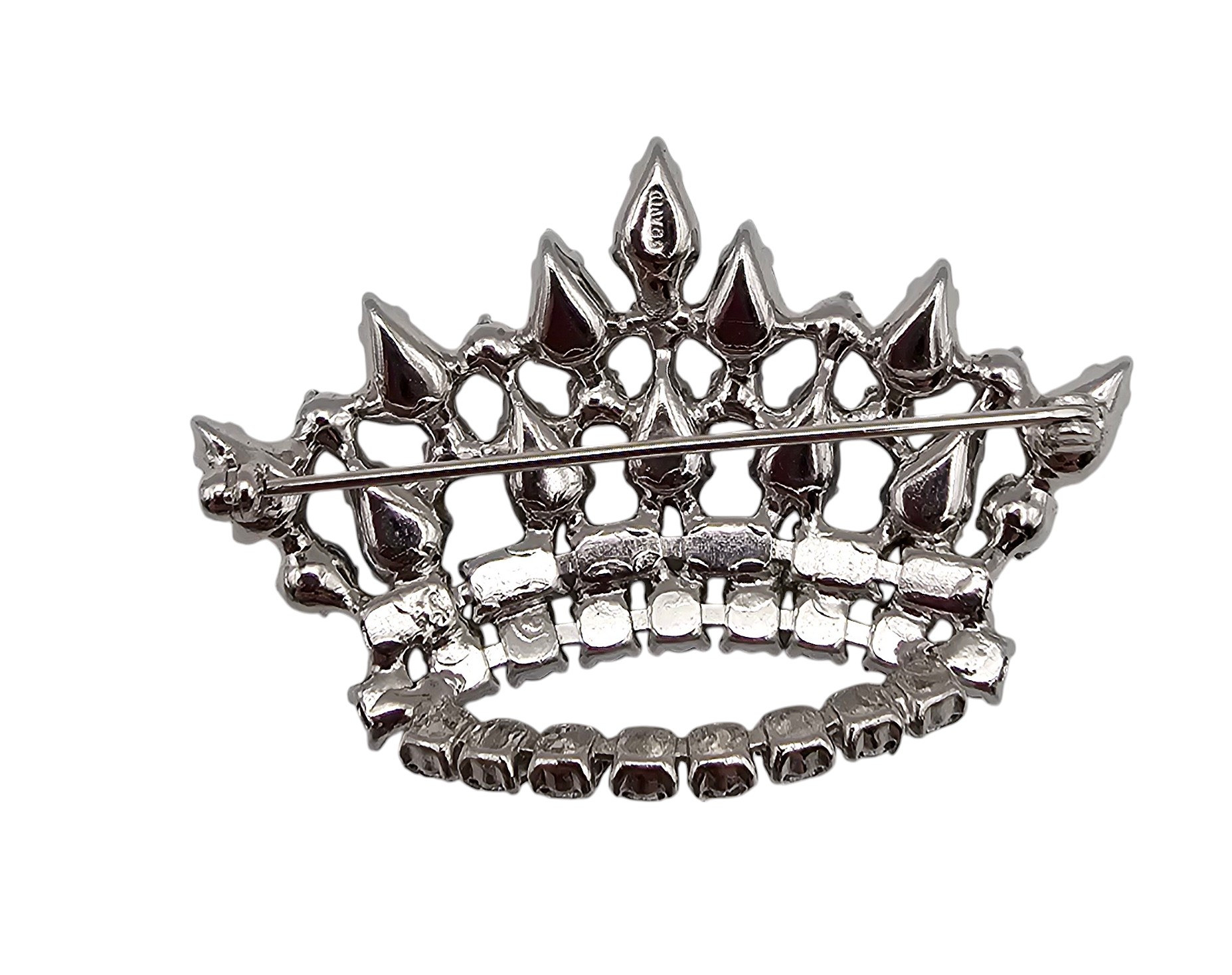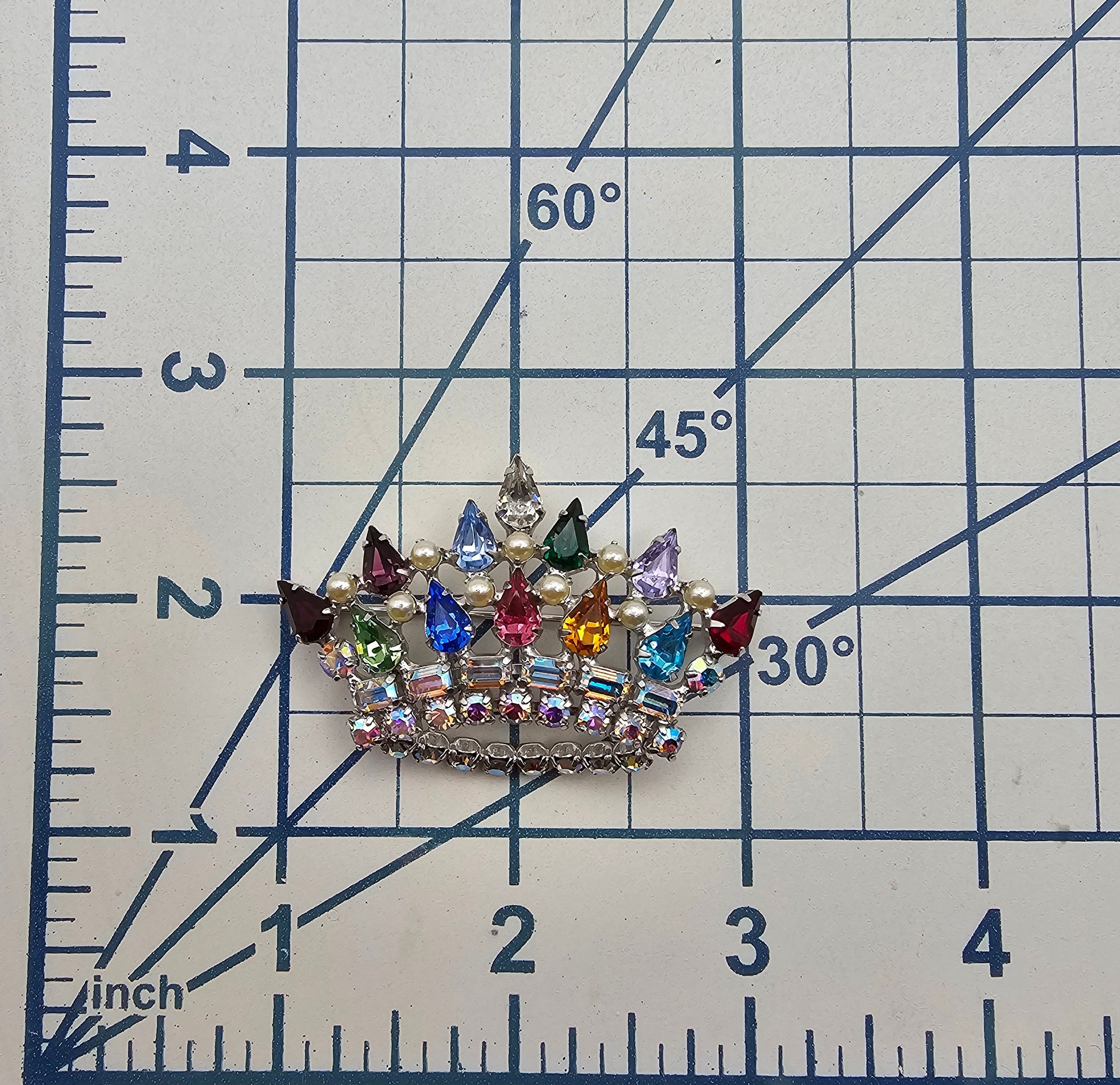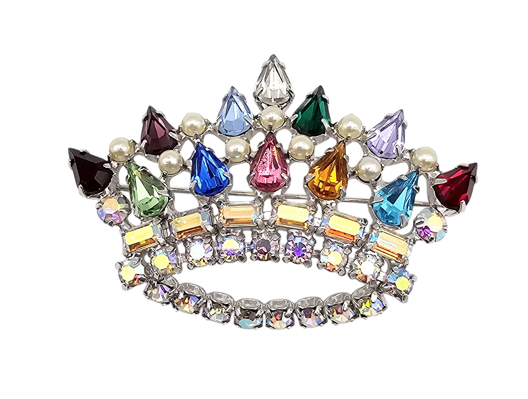 Iridescent Rhinestone Faux Pearl Silver Tone Crown Brooch