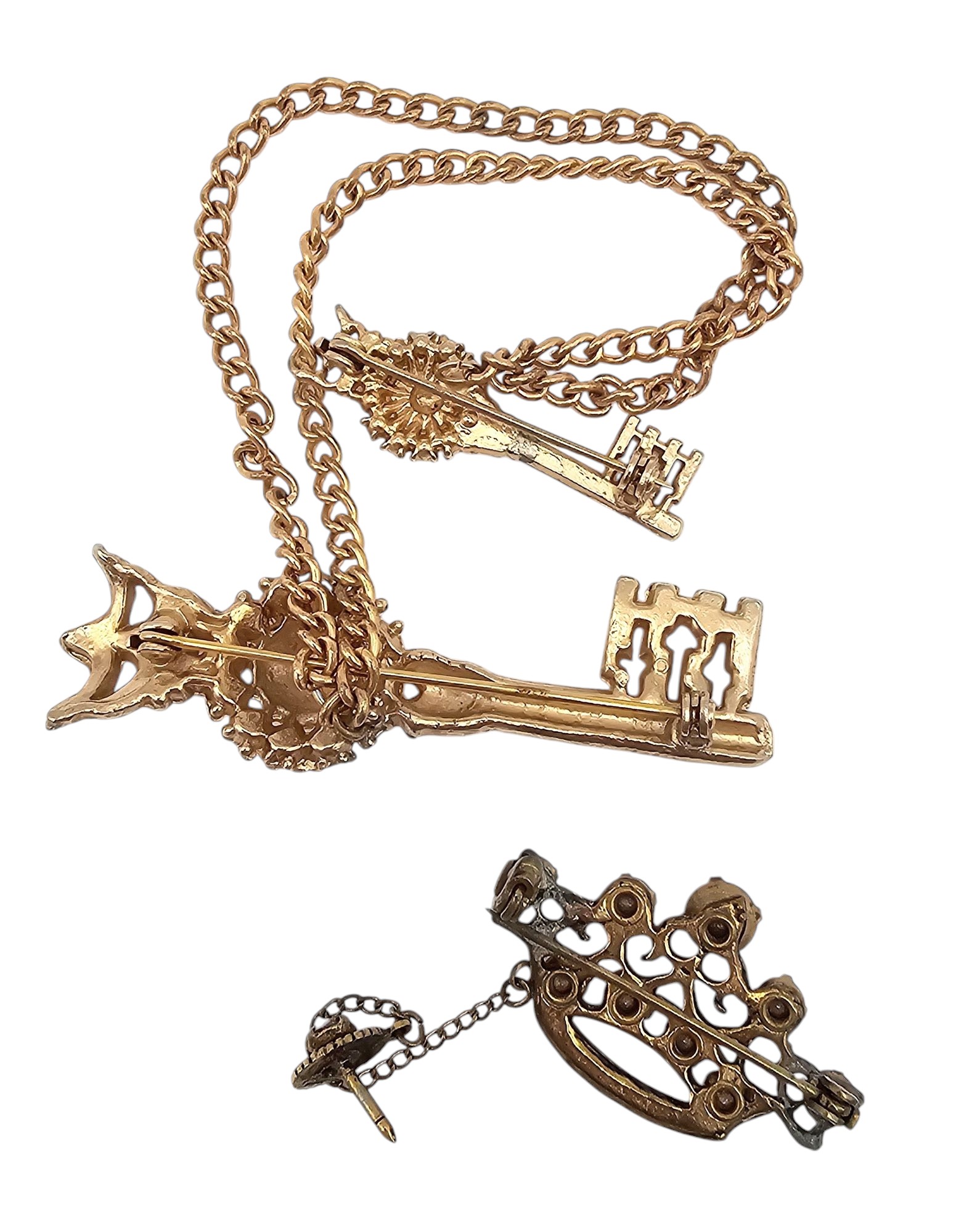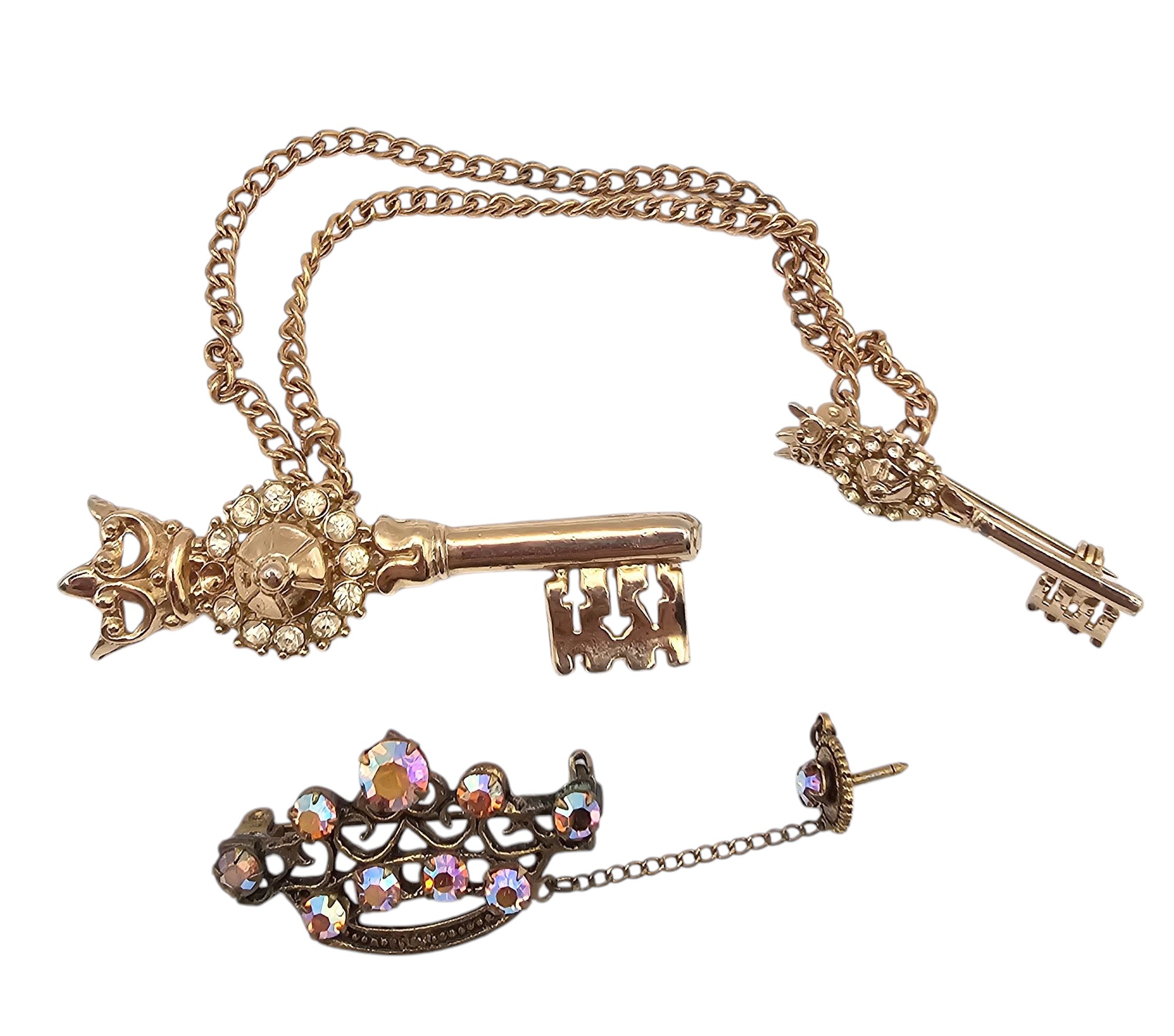 Vintage Iridescent Rhinestone Gold Tone Key Crown Crown Brooches