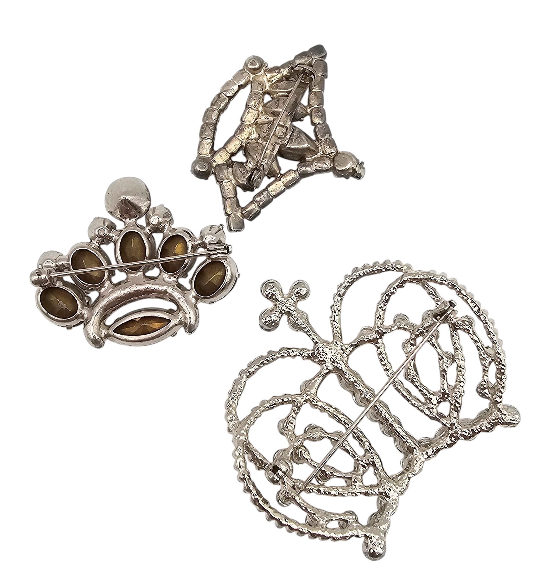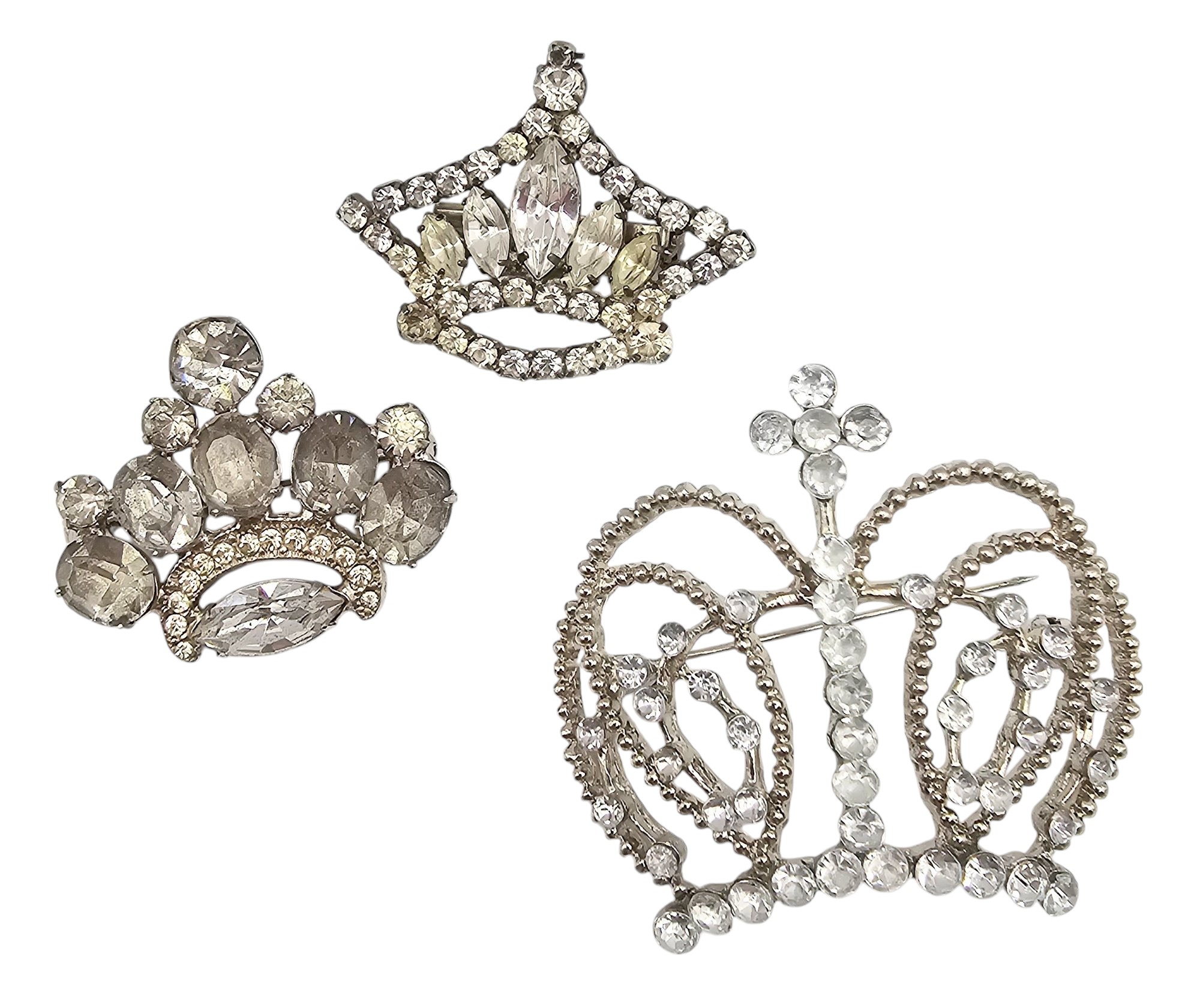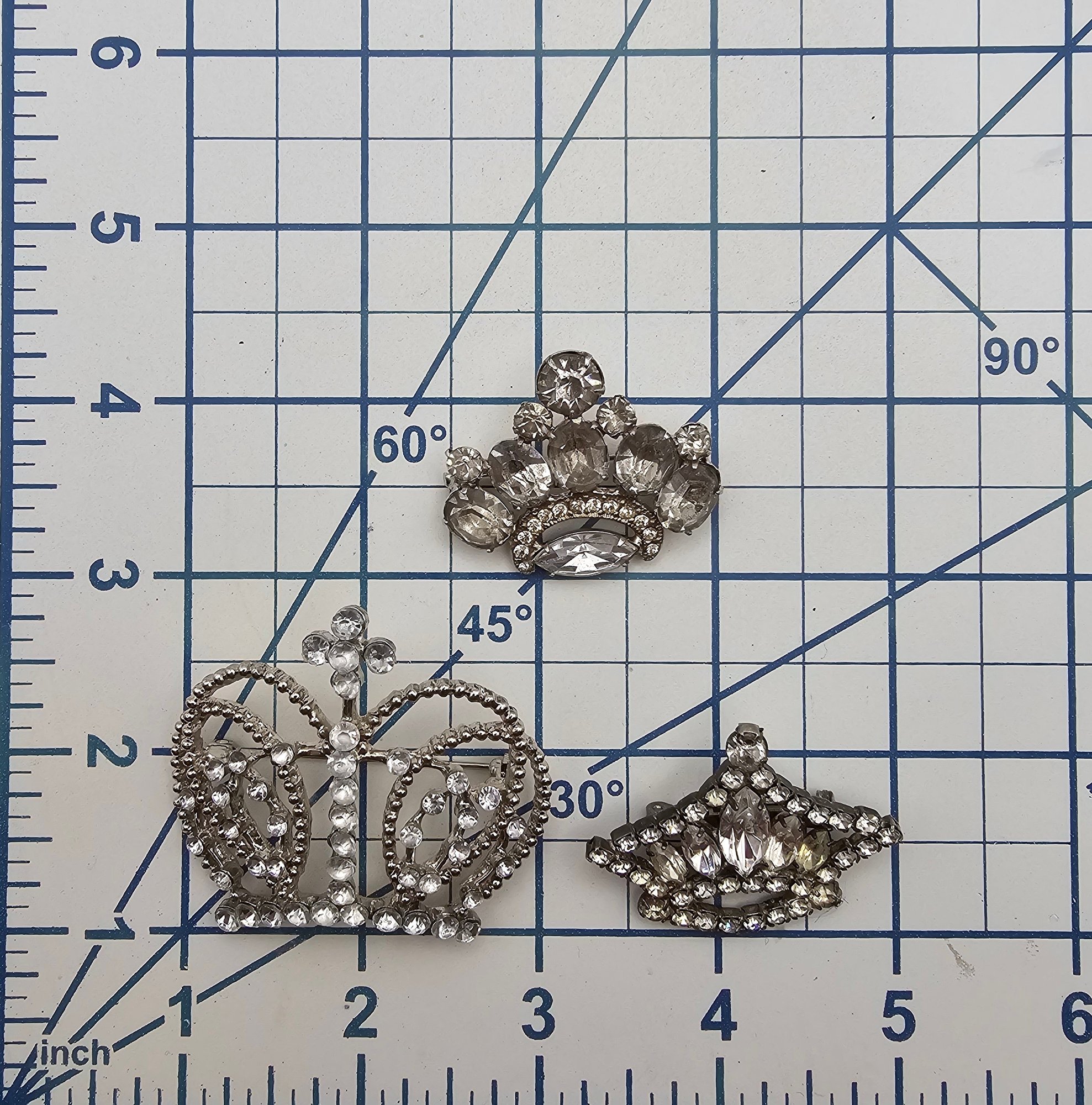 Vintage Lot 3 Clear Rhinestone Crown Brooches