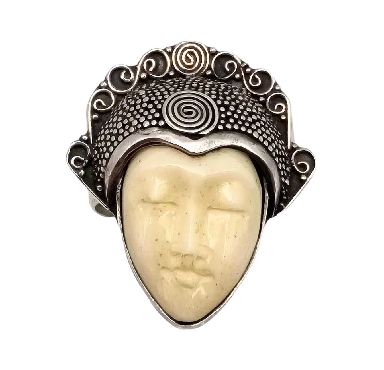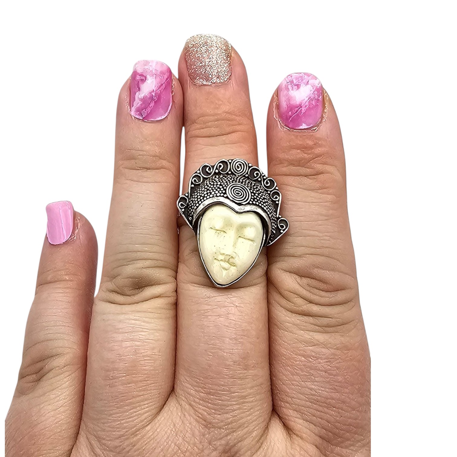 Bone Carved Face Sterling Silver Asian Style Headdress Ring Size 8.5 6.4 G