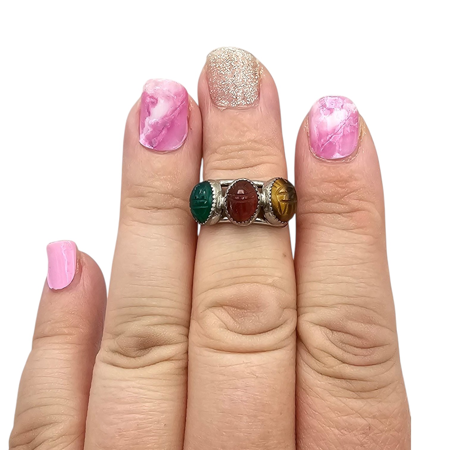 Tigers Eye Carnelian Aventurine Scarab Sterling Silver Egyptian Revival Ring Adjustable 3.1 G