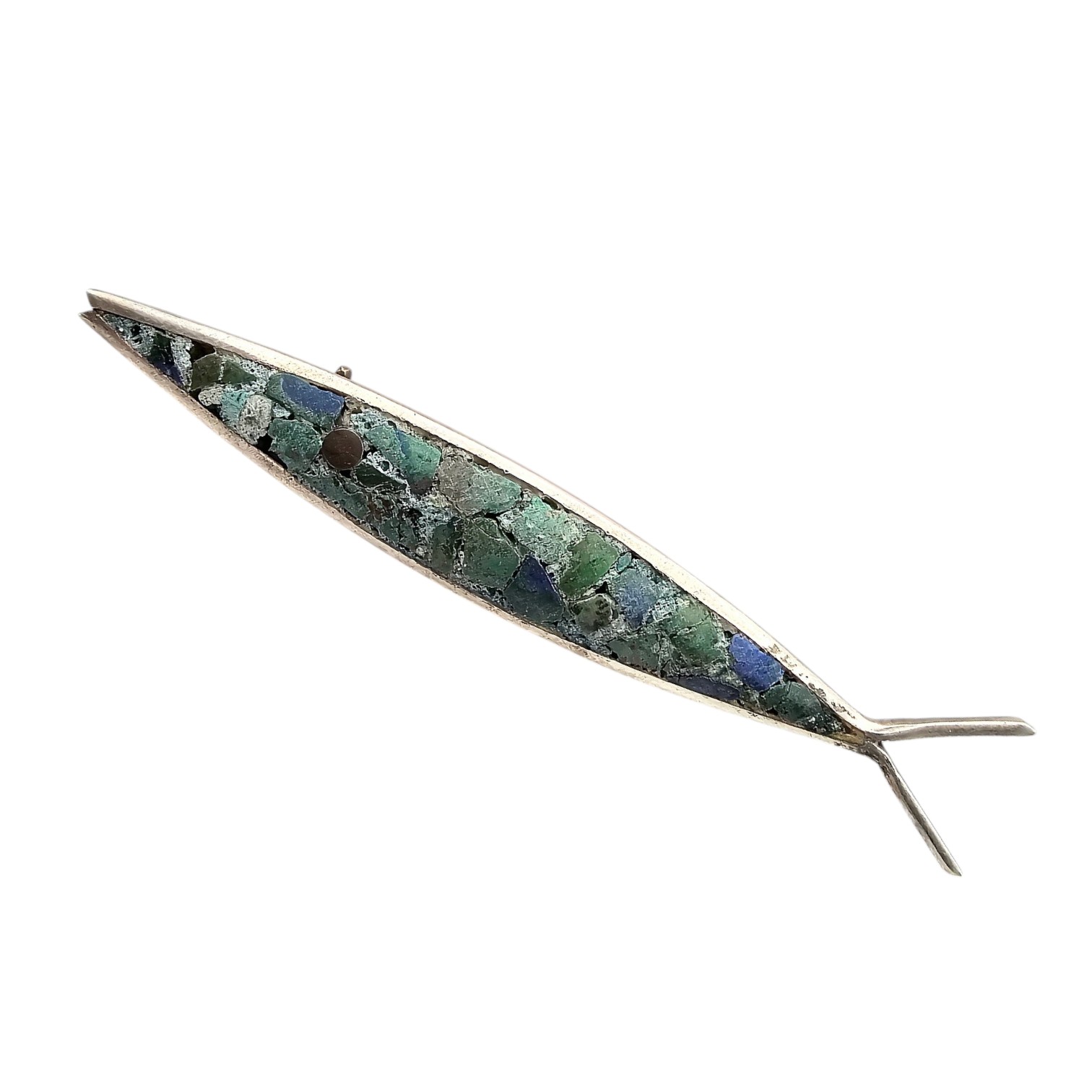 Mexico Crushed Turquoise Sterling Silver Fish Brooch 5.2 G