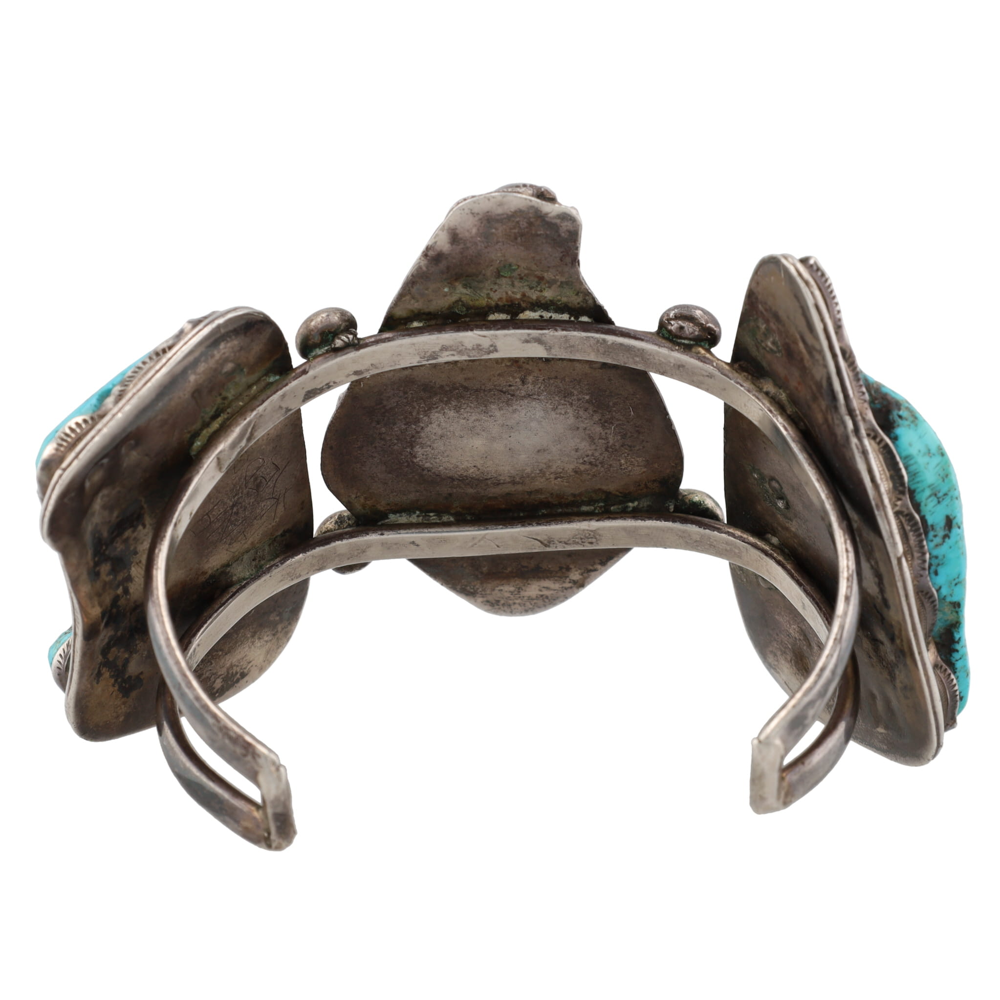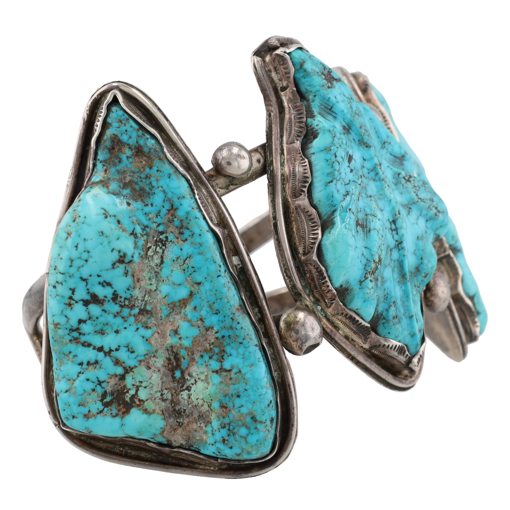 Huge Signed Zuni Turquoise Carved Leaf Sterling Cuff Bracelet 94g. Our consignor reports that this cuff is attributed to Zuni artists Leekya Deyuse/Dan Simplicio. We are unable to confirm the attribution, so please see photos and bid accordingly. The cuff does have a handwritten signature, but this may be a prior owners signature or traders marks given the attribution.