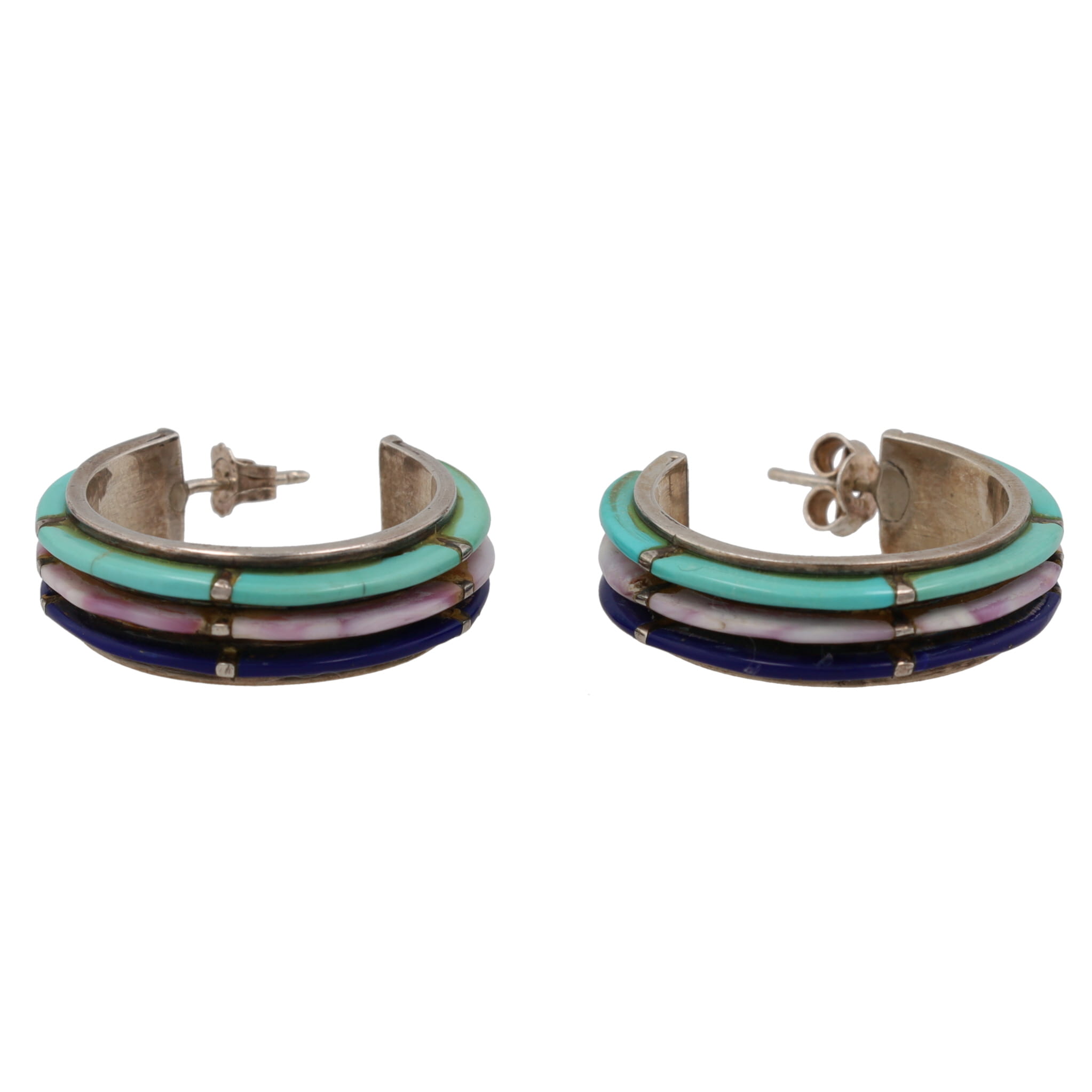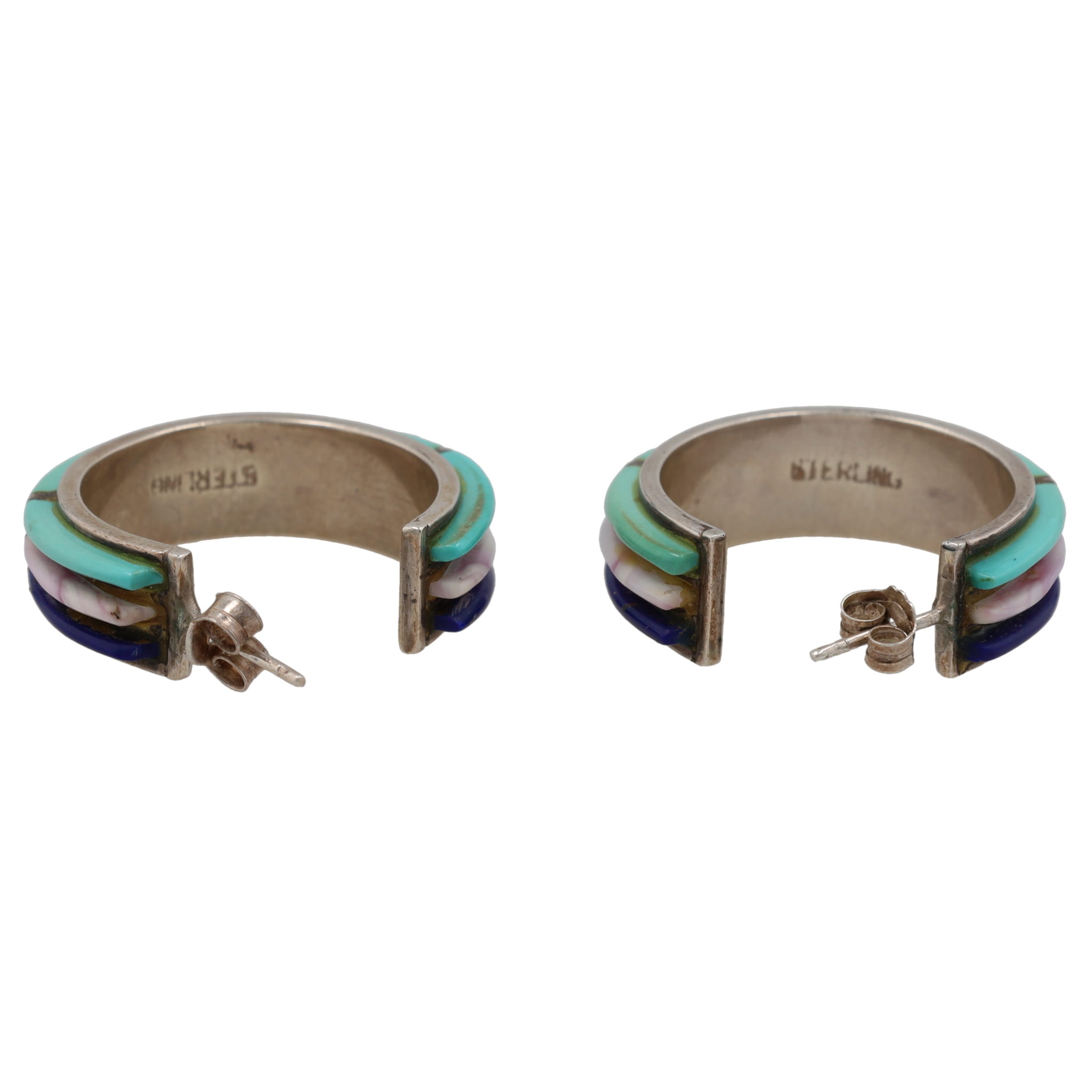 Vintage Navajo Raised Turquoise Lapis Channel Raised Inlay Earrings 11g