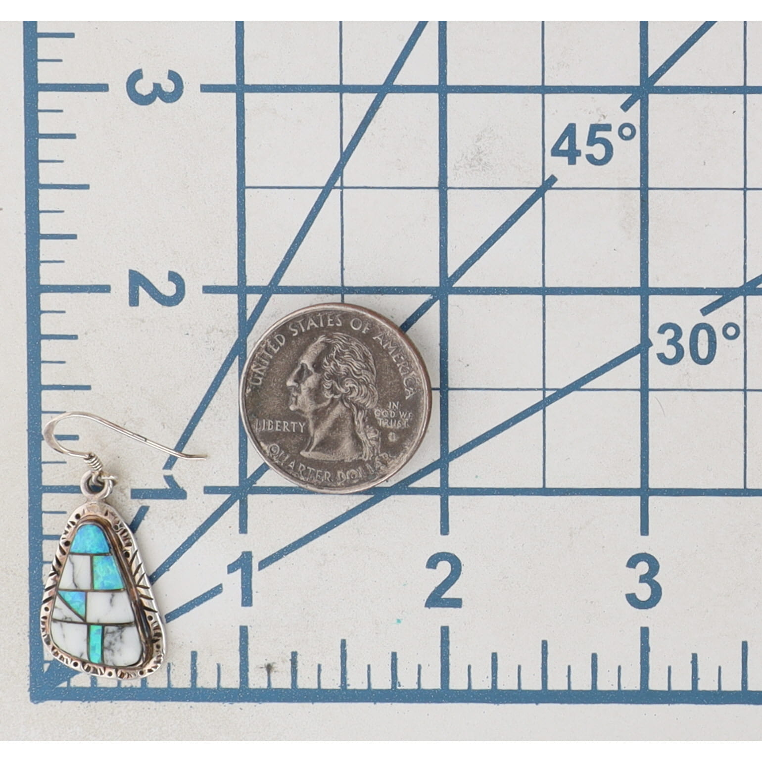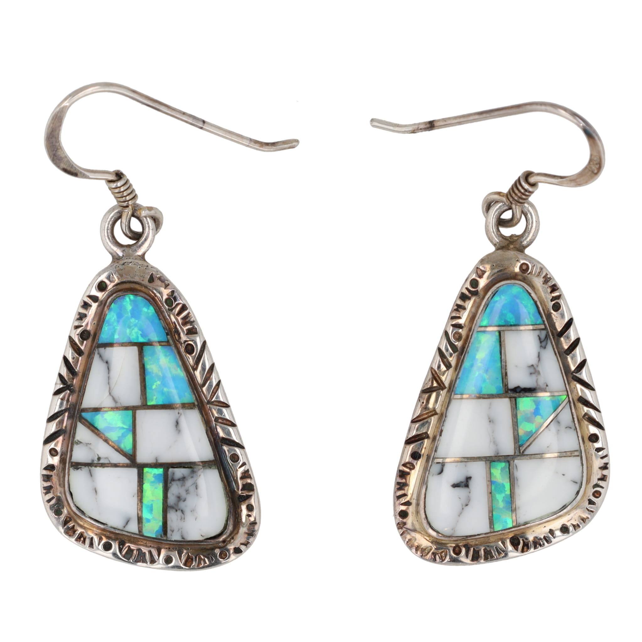 Signed MD Navajo Inlay White Buffalo Turquoise Opal Sterling Inlay Hook Earrings 7g