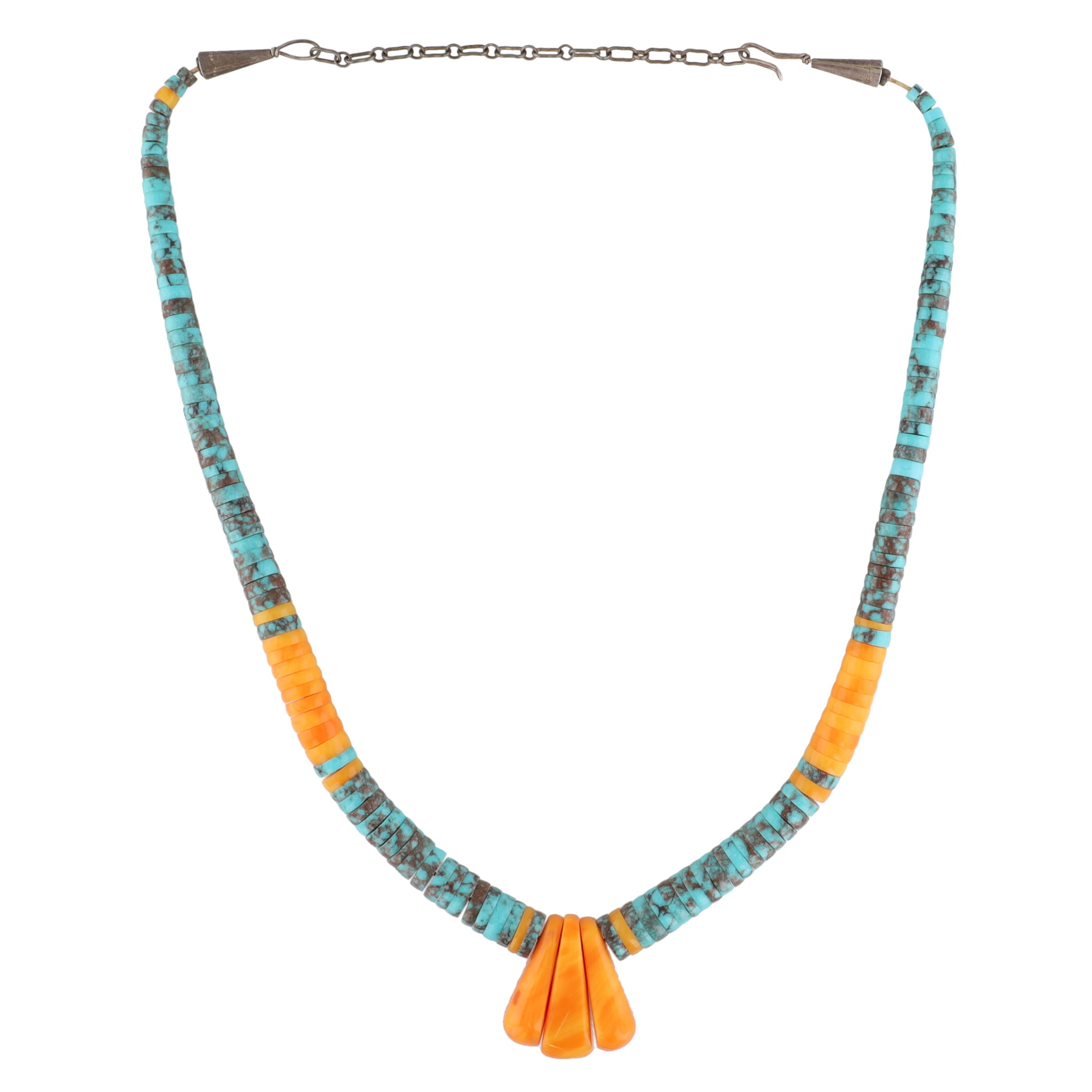 Vintage Santo Domingo Spiny Oyster Turquoise Sterling Heishi Necklace 28.5g