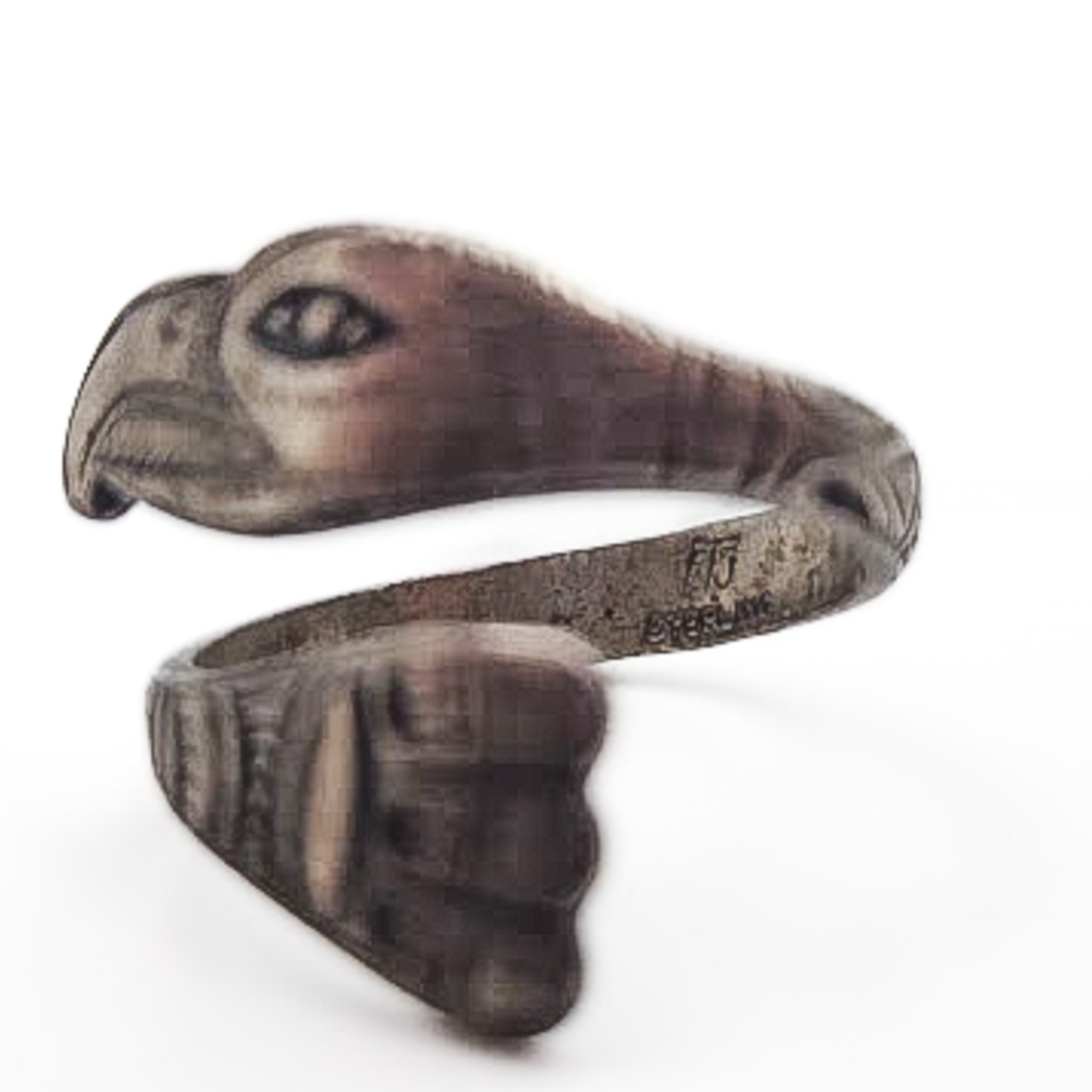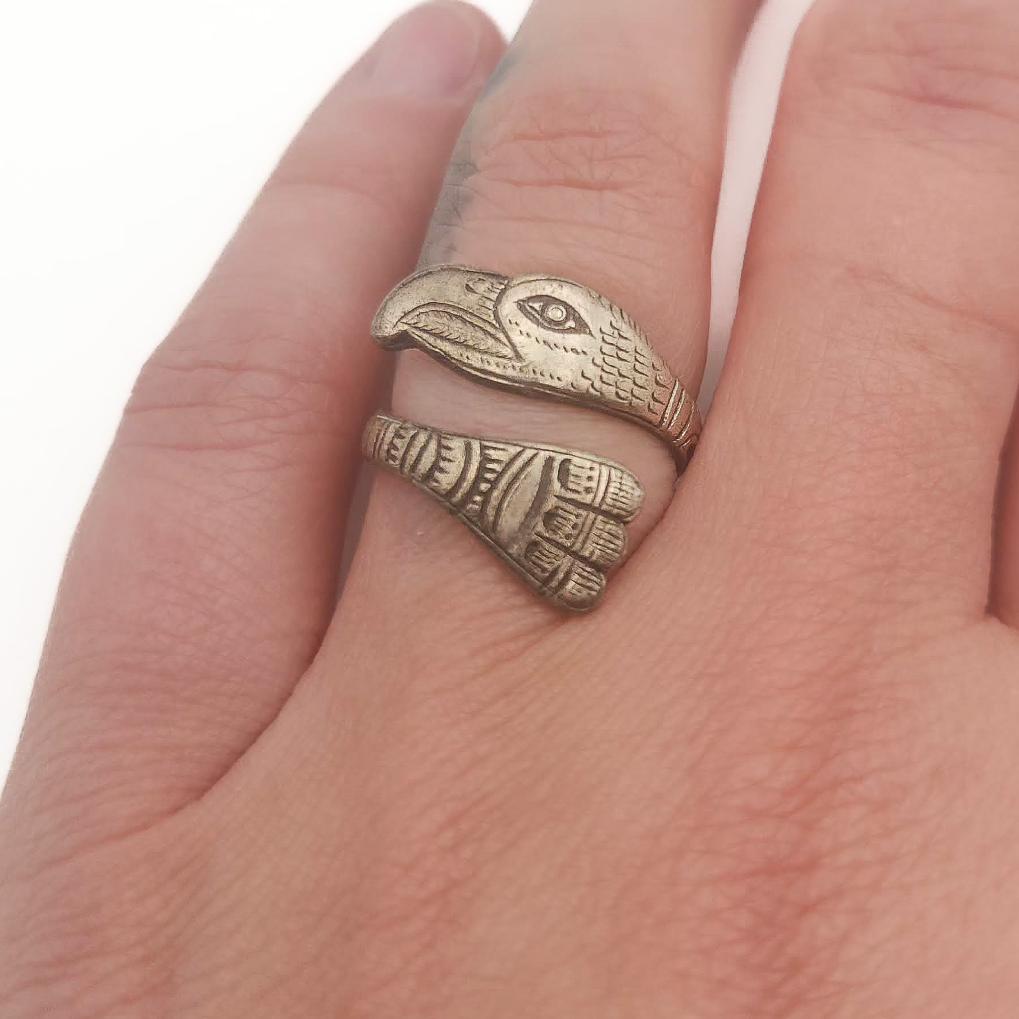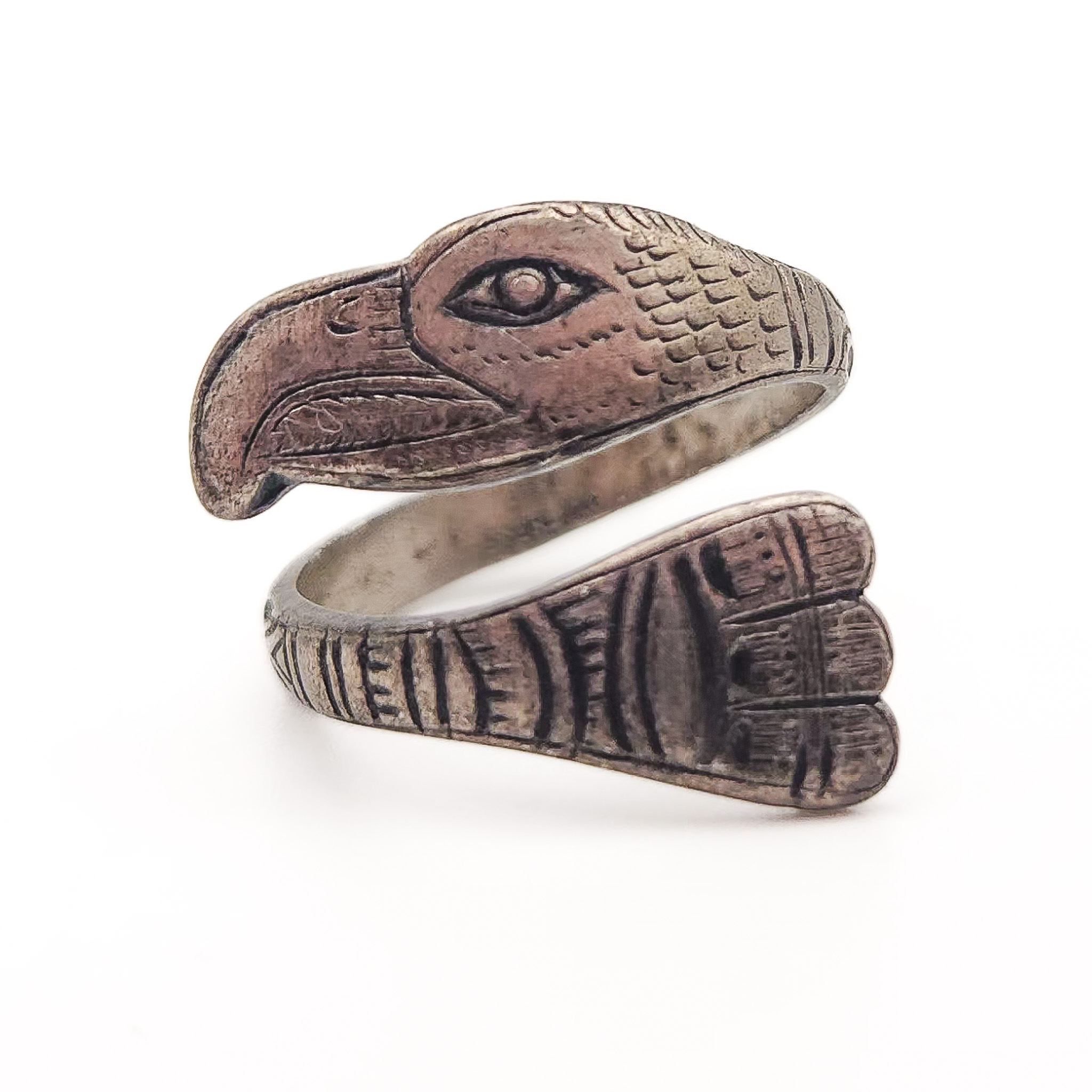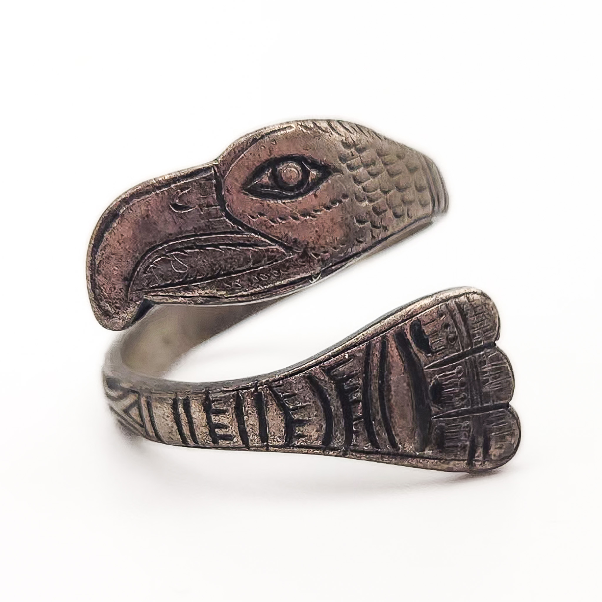 EJ Towle First Nation Northcoast Indian Sterling Eagle Totem Wrap Ring 3.7g, signed EJT