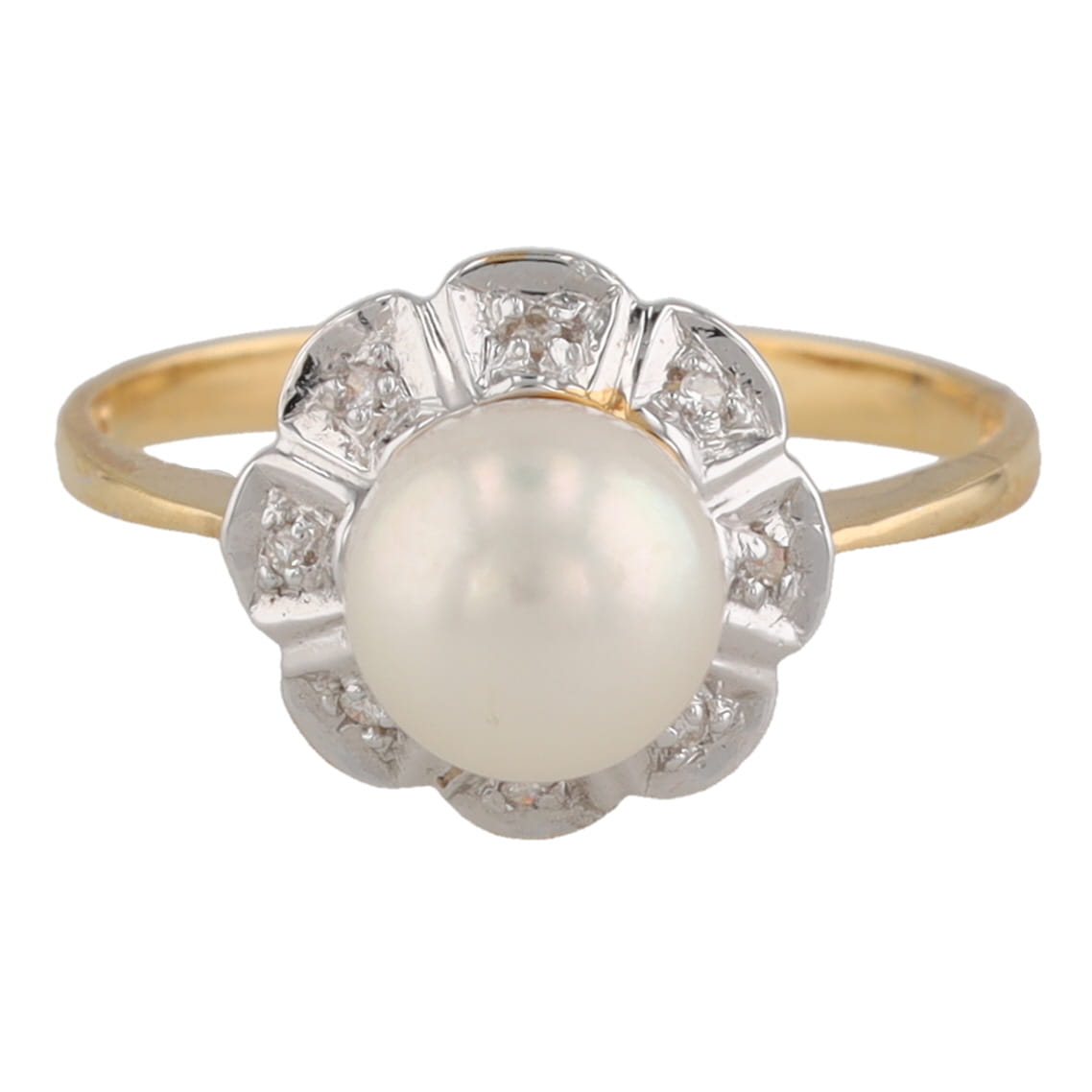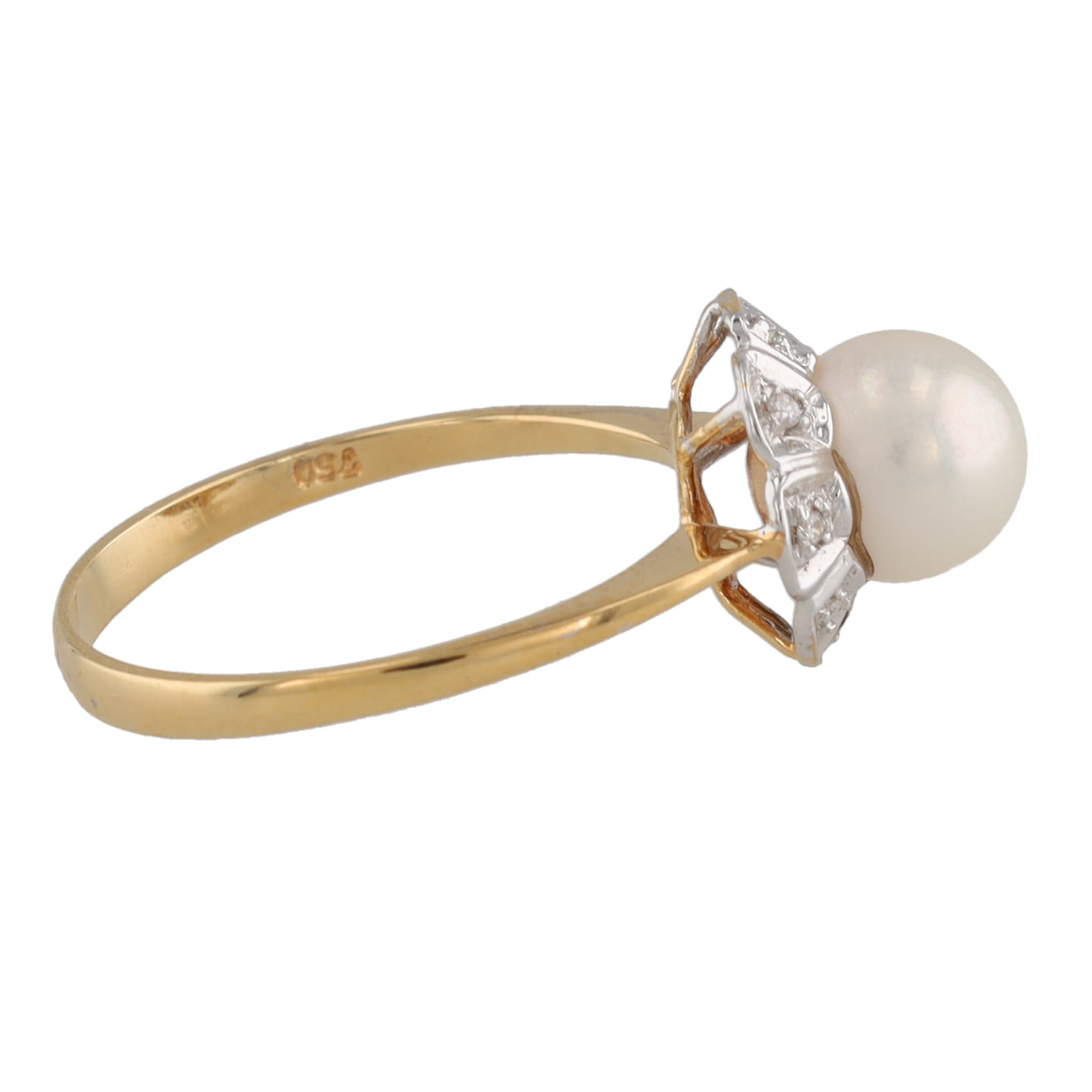18K Pearl and Diamond Cocktail Ring, Marked 750 and 18K, Rhodium Plated 18k White Gold and 18K Yellow Gold Band. 6.5-7MM cultured Pearl, .02 carats Round Brilliant cut diamonds. Sz 6.5, Weight 2.4g. New!