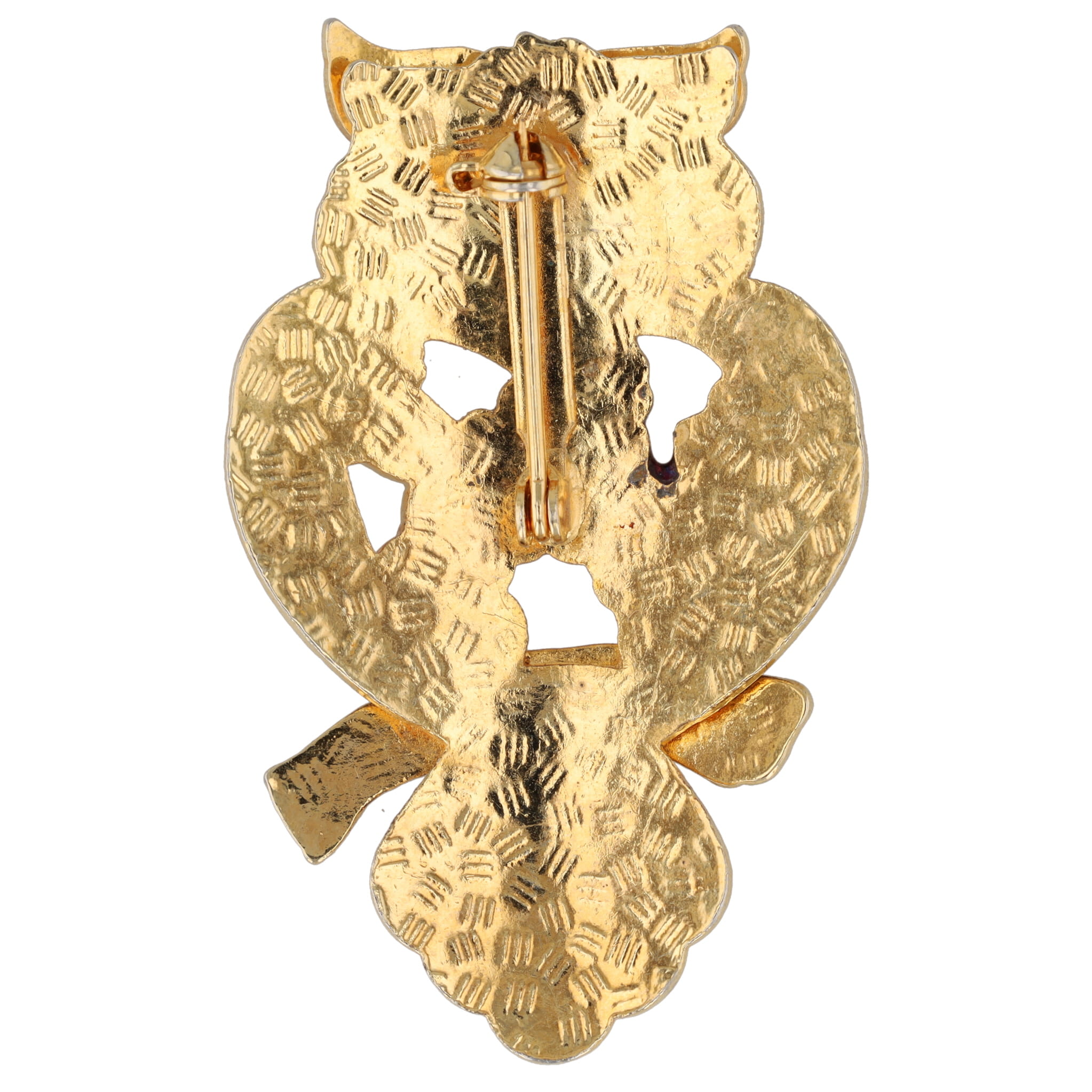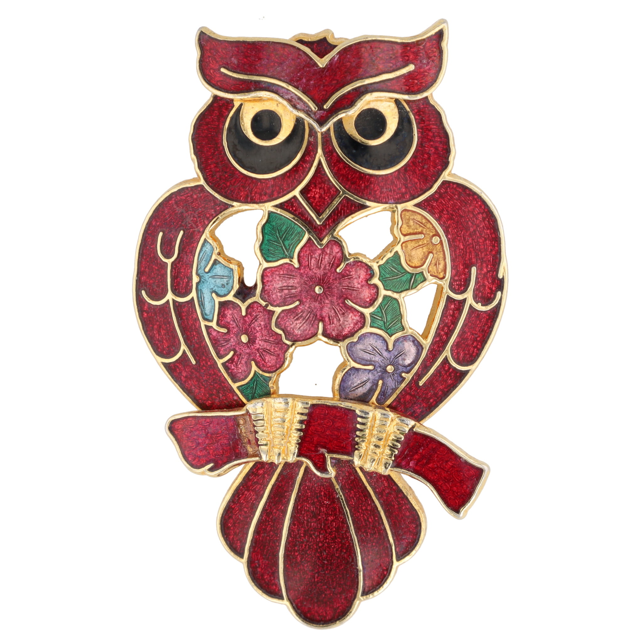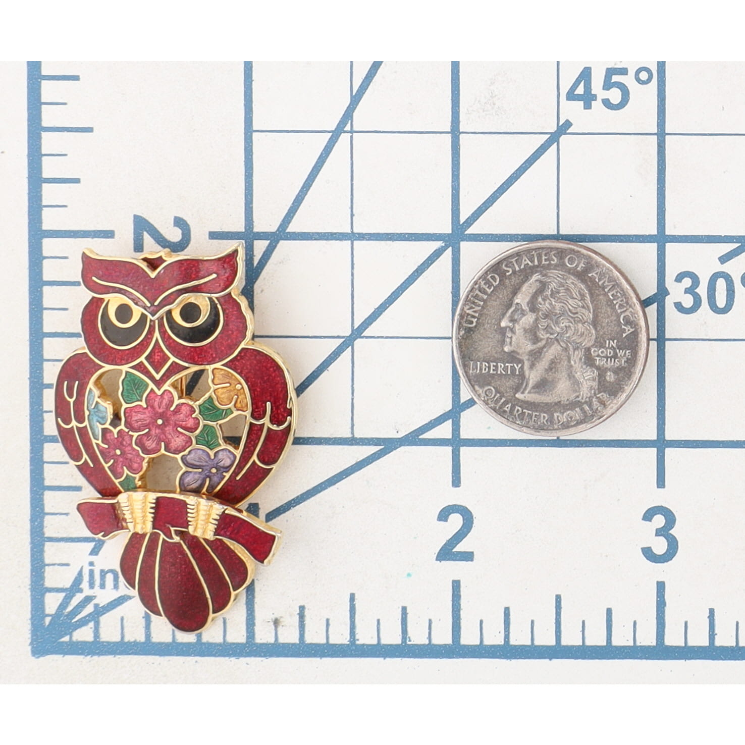 Stunning Vintage Gold Tone Red Cloisonné Owl Brooch 2 inches tall, 12.2g