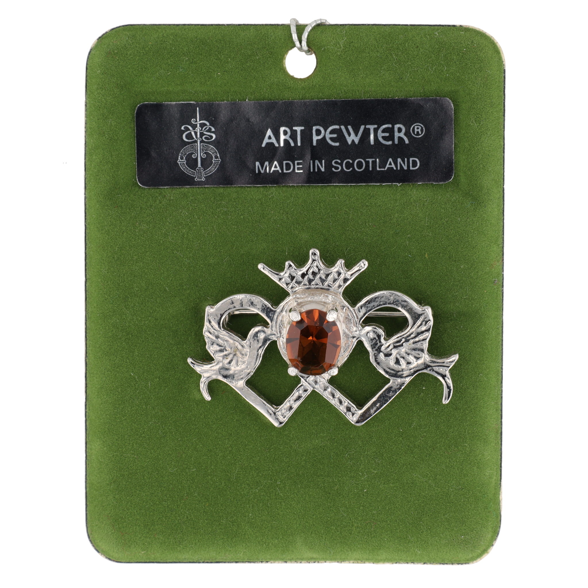 New Old Stock Scottish Thistle Luckenbooth Brooch Pewter w/Rhinestone, Made in Glasgow. This type of brooch was traditionally given by a groom to his bride and pinned on their baby’s blanket to protect it from evil spirits. Comes with original informational booklet and card stock.