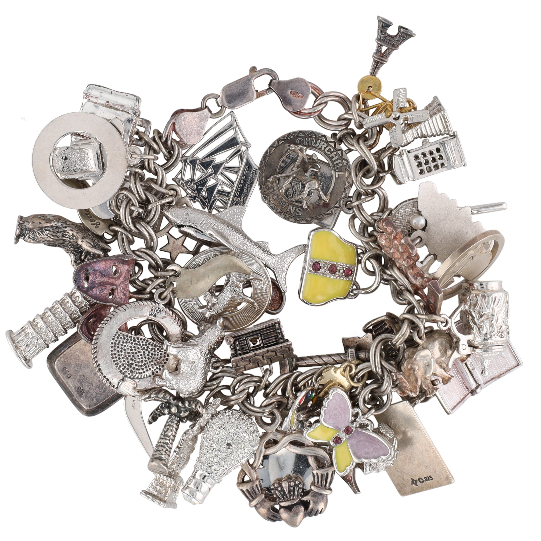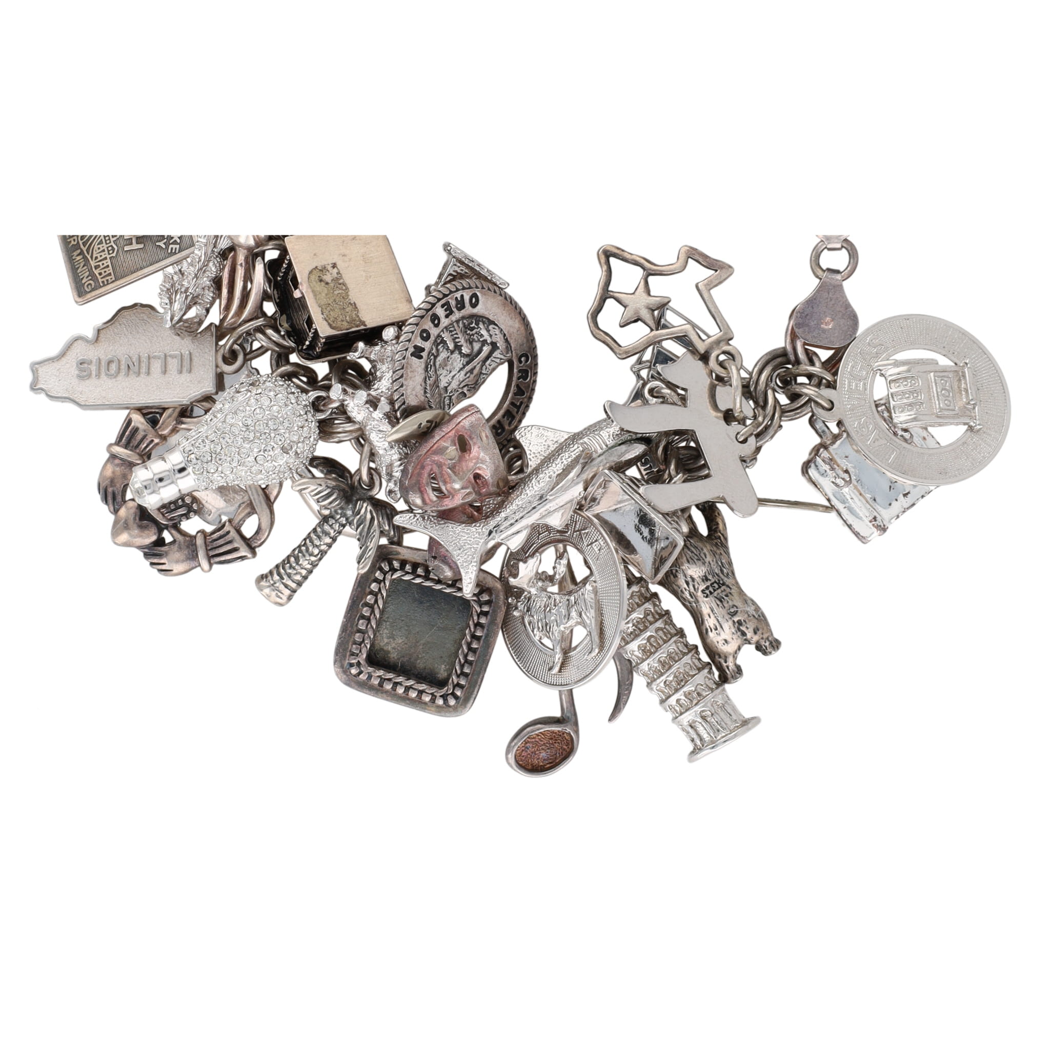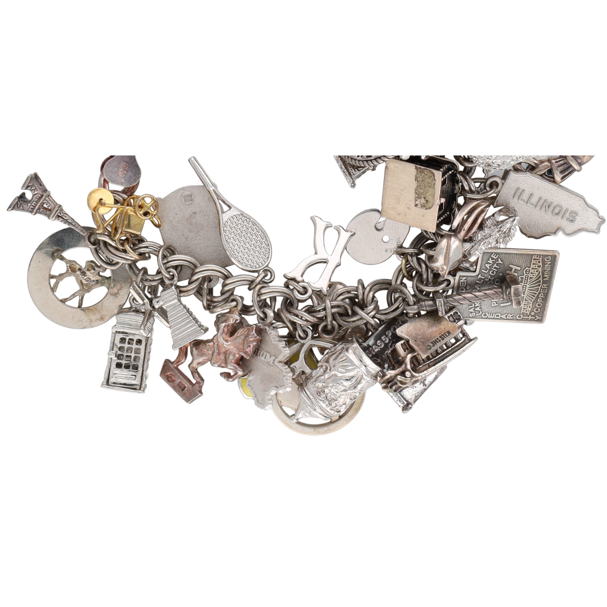 125.4g Silver and Gold. Fully Loaded Sterling Silver Vintage Charm Bracelet, Over 45 Sterling Charms, One 14K Gold Chai Charm 124.4g! One Swarovski Crystal Hot Air Balloon Charm.