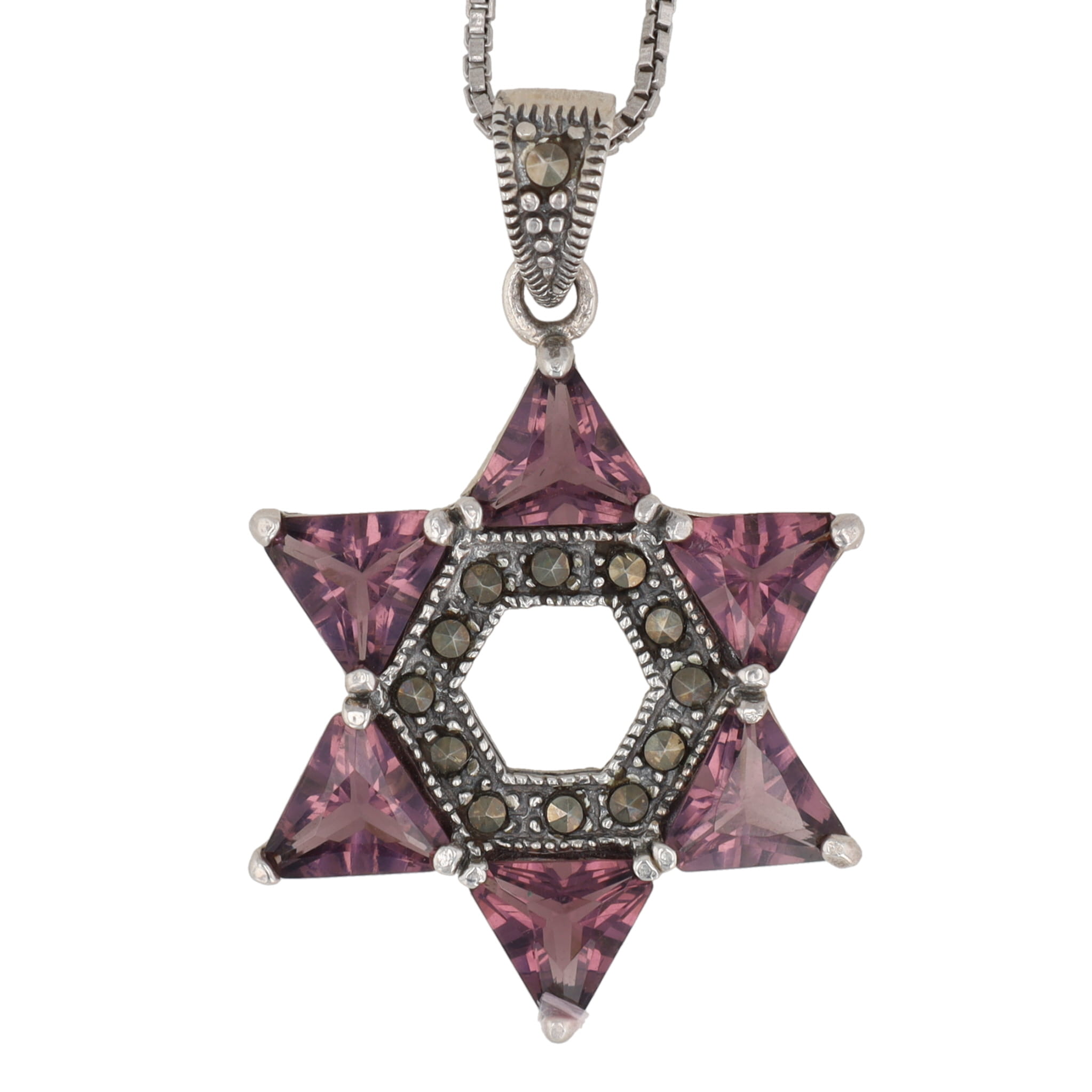 Sterling Silver Marcasite, Amethyst Star of David Pendant and Sterling Chain Necklace