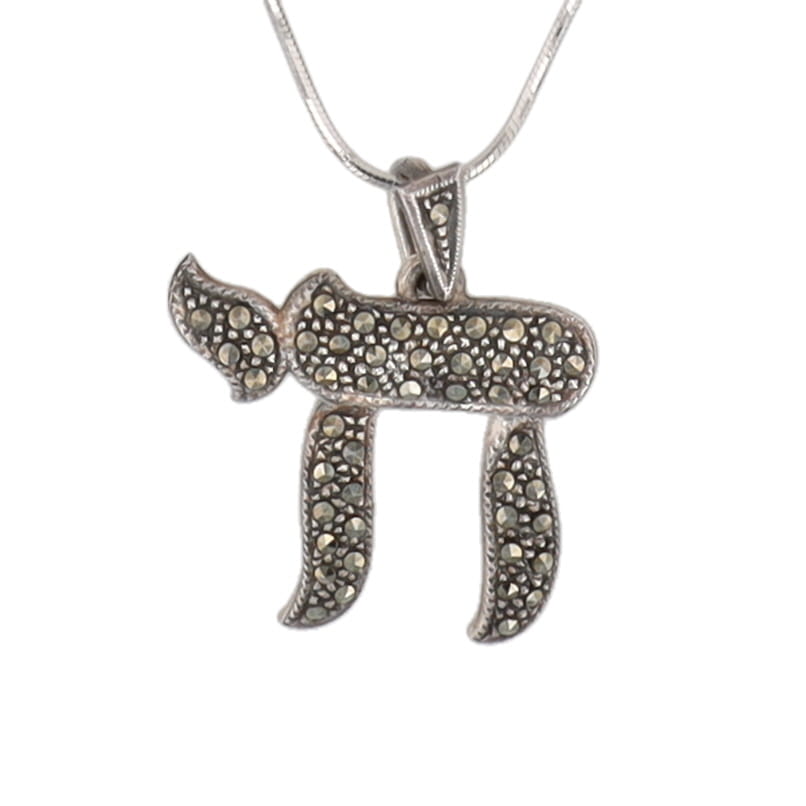 Sterling Silver Marcasite, Chai Pendant and Sterling Chain Necklace