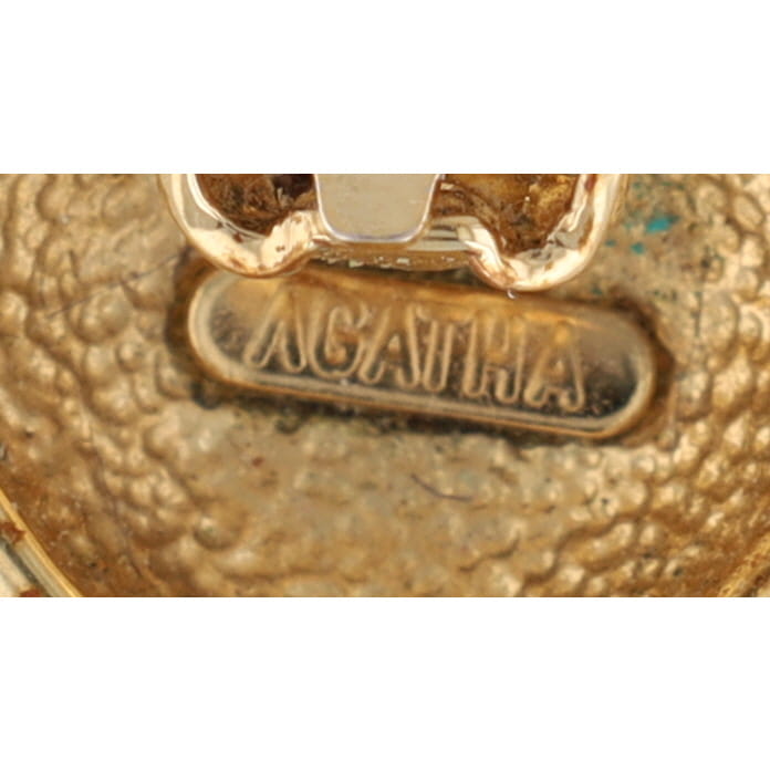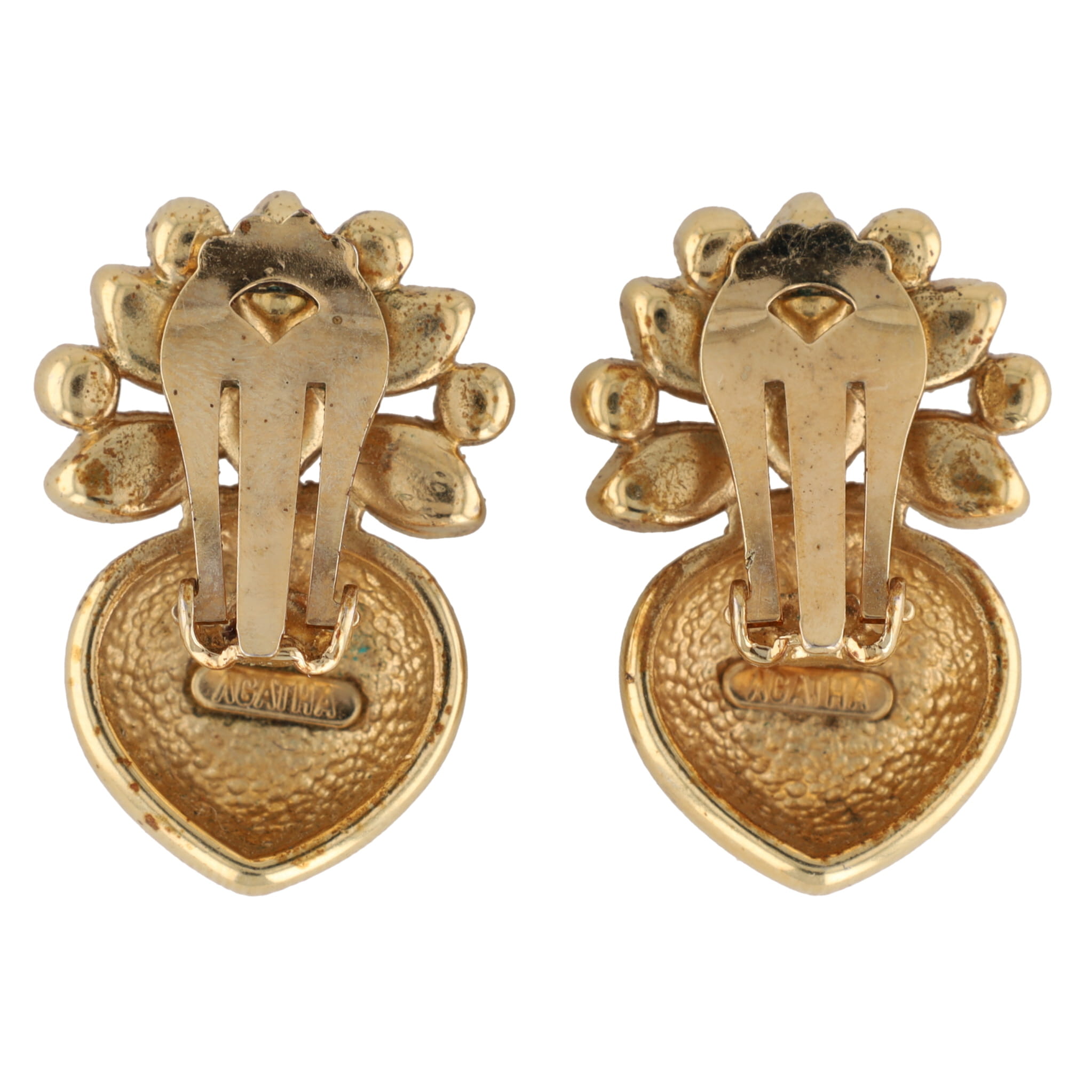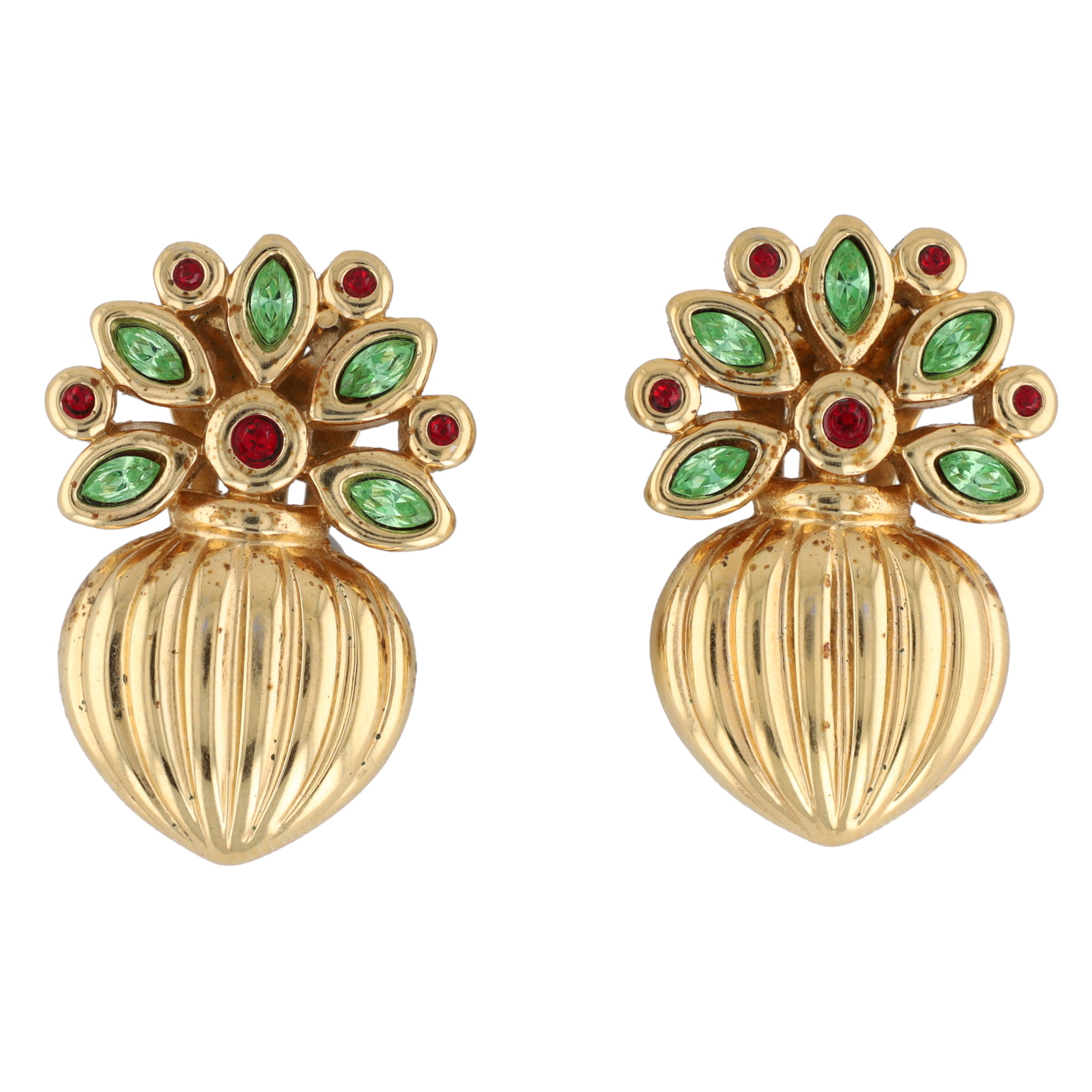 AGATHA Paris Vintage Gold Plated Brass Bouquet Clip Earrings with Green and Red Stones. Signed AGATHA