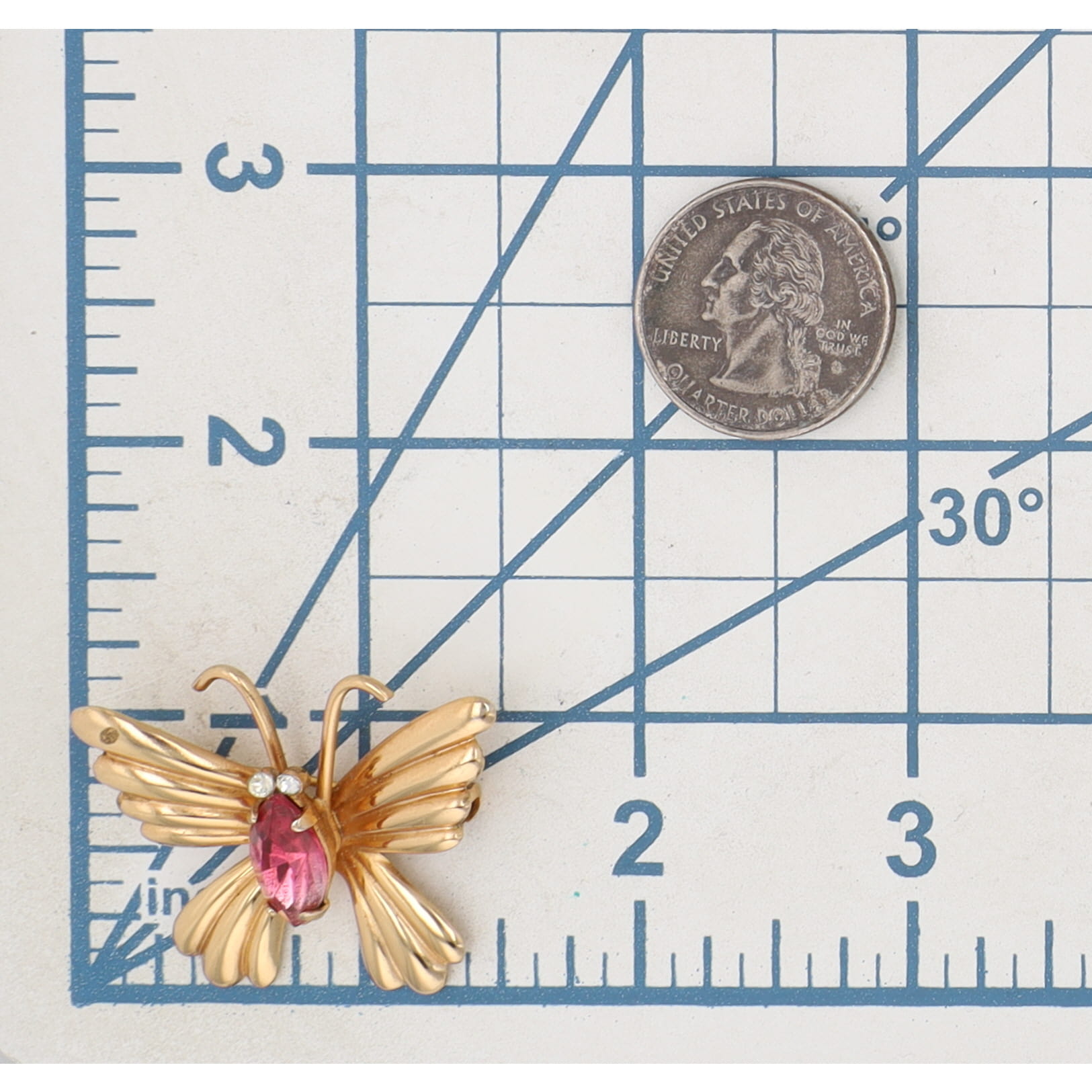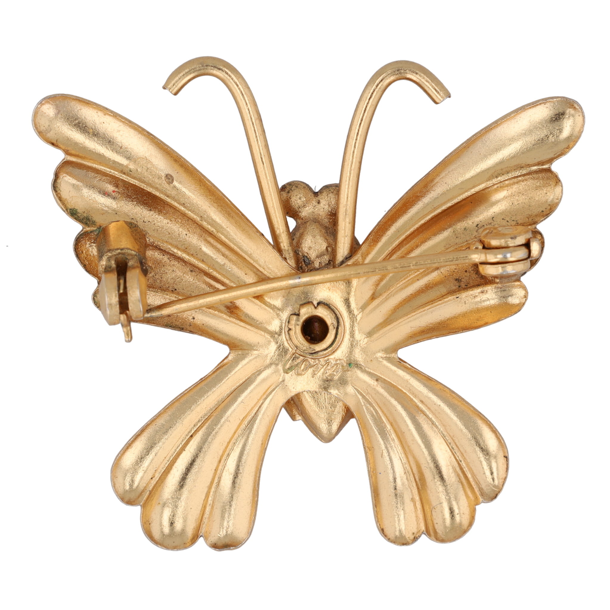Signed Coro Vintage Costume Gold Tone Butterfly Brooch with Pink and White Crystals. Signed Coro