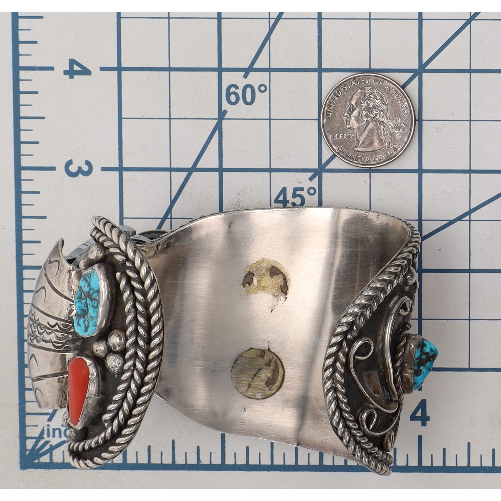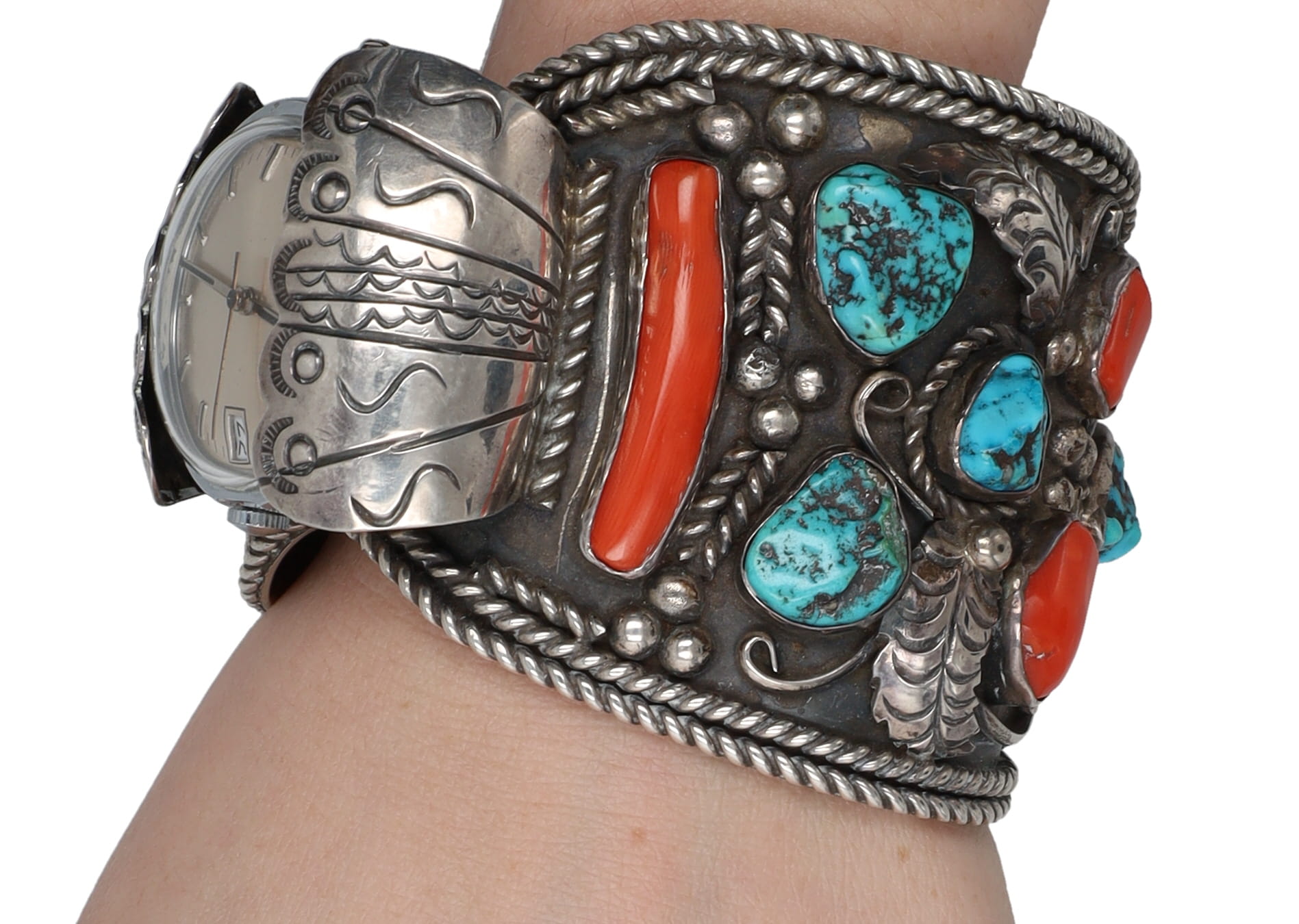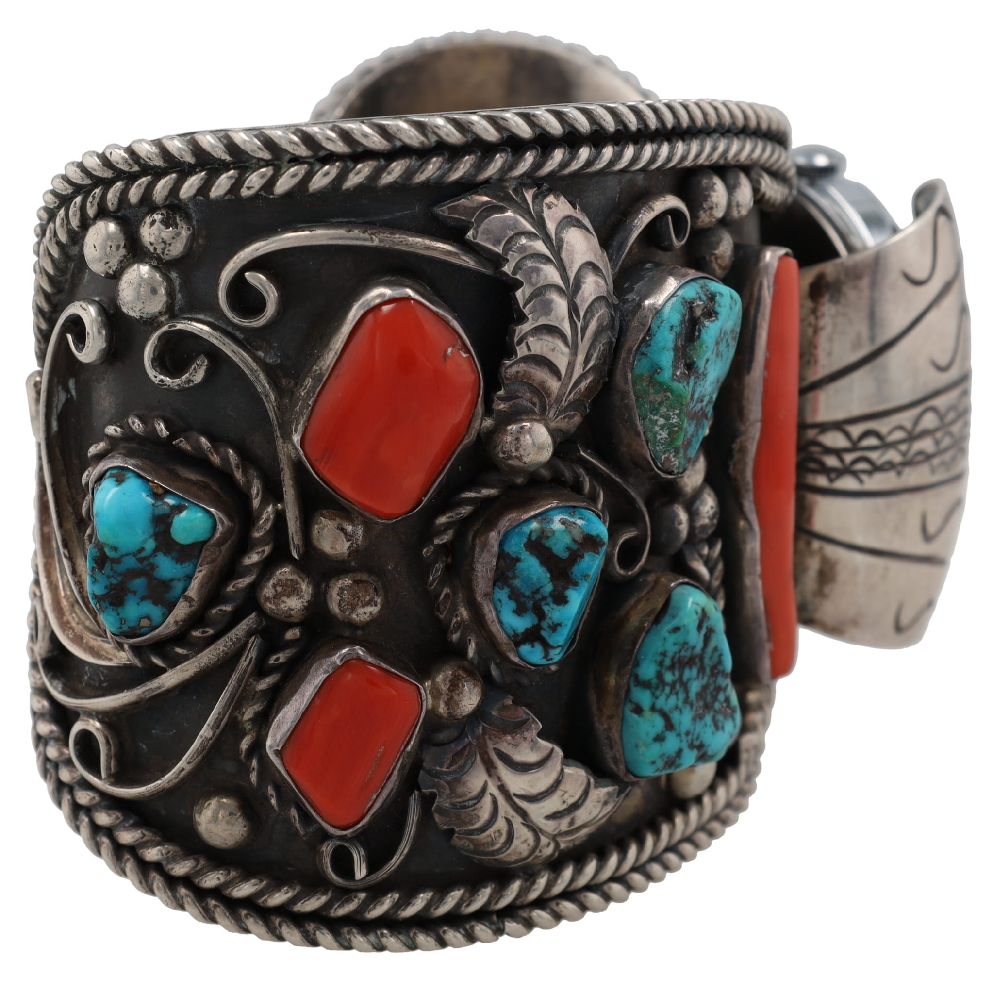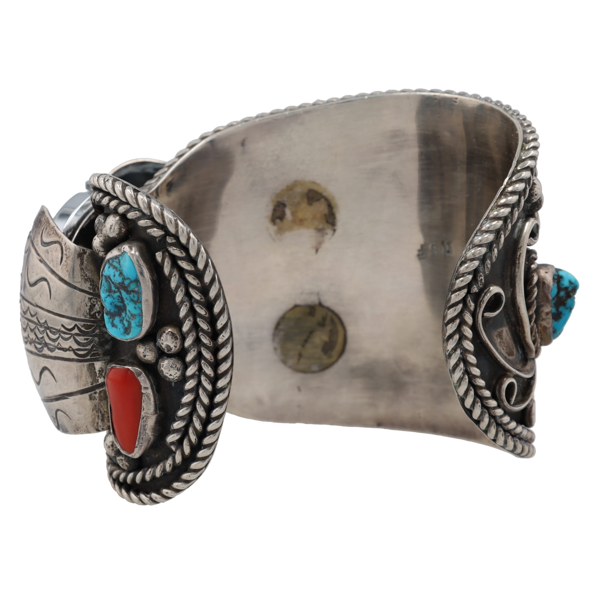 Signed RSF Navajo Huge Turquoise, Coral, Sterling Watch Cuff Bracelet 164g