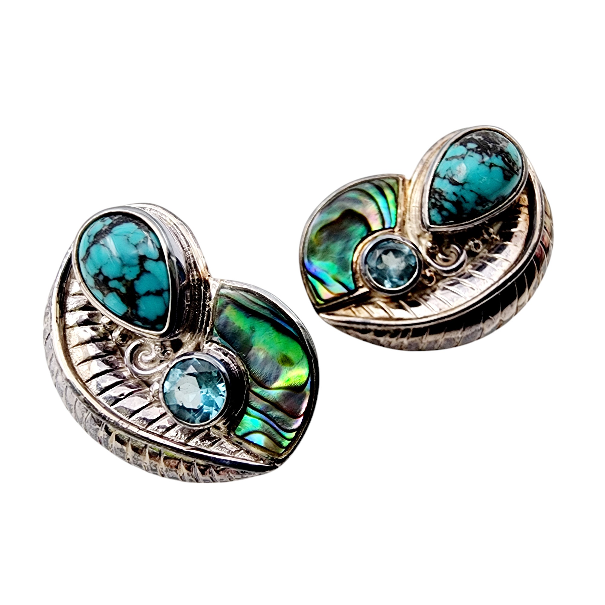 Sajen Sterling Turquoise Topaz Abalone Feather Earrings 7.9g