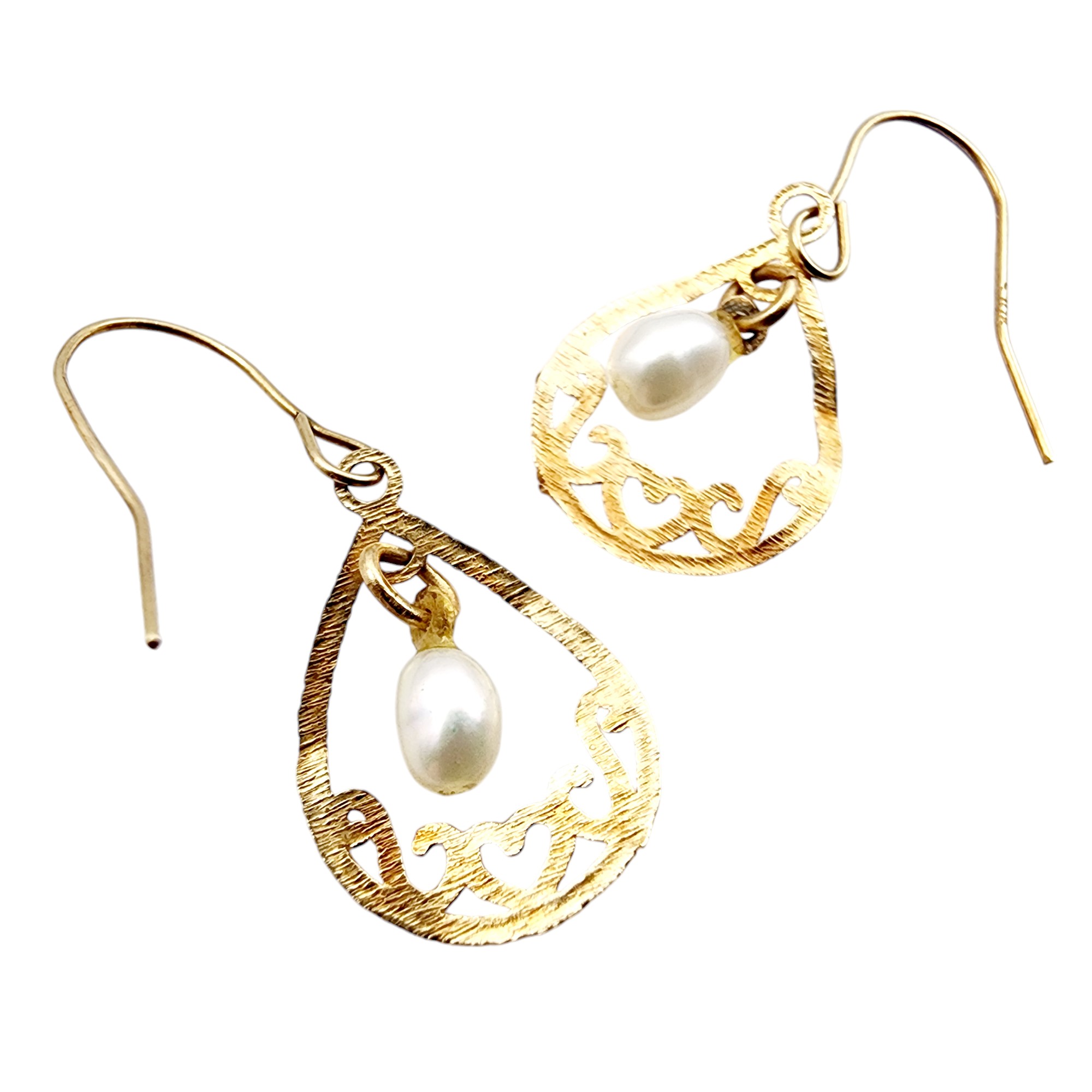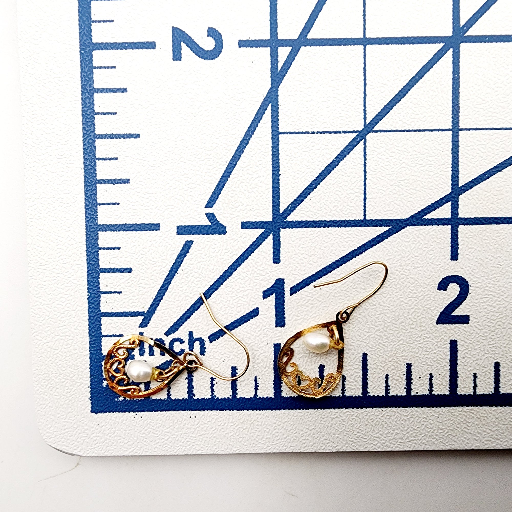 14k Gold Ornate Teardrop Pearl Earrings .4g, as is, bends