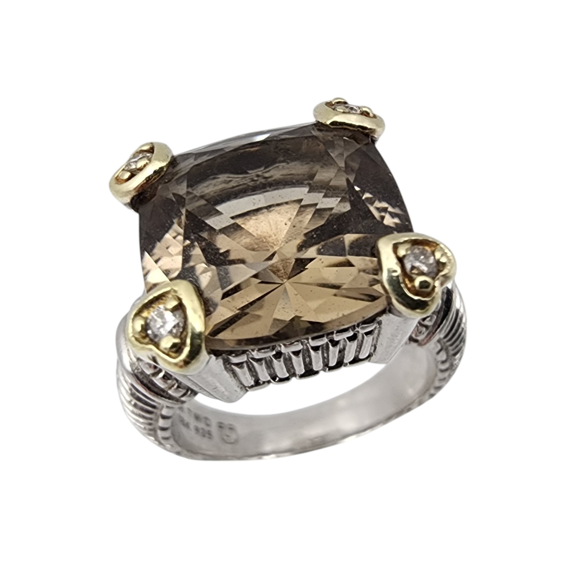 Judith Ripka 18k Gold Sterling Smoky Quartz and Diamond Ring Sz 6 9g