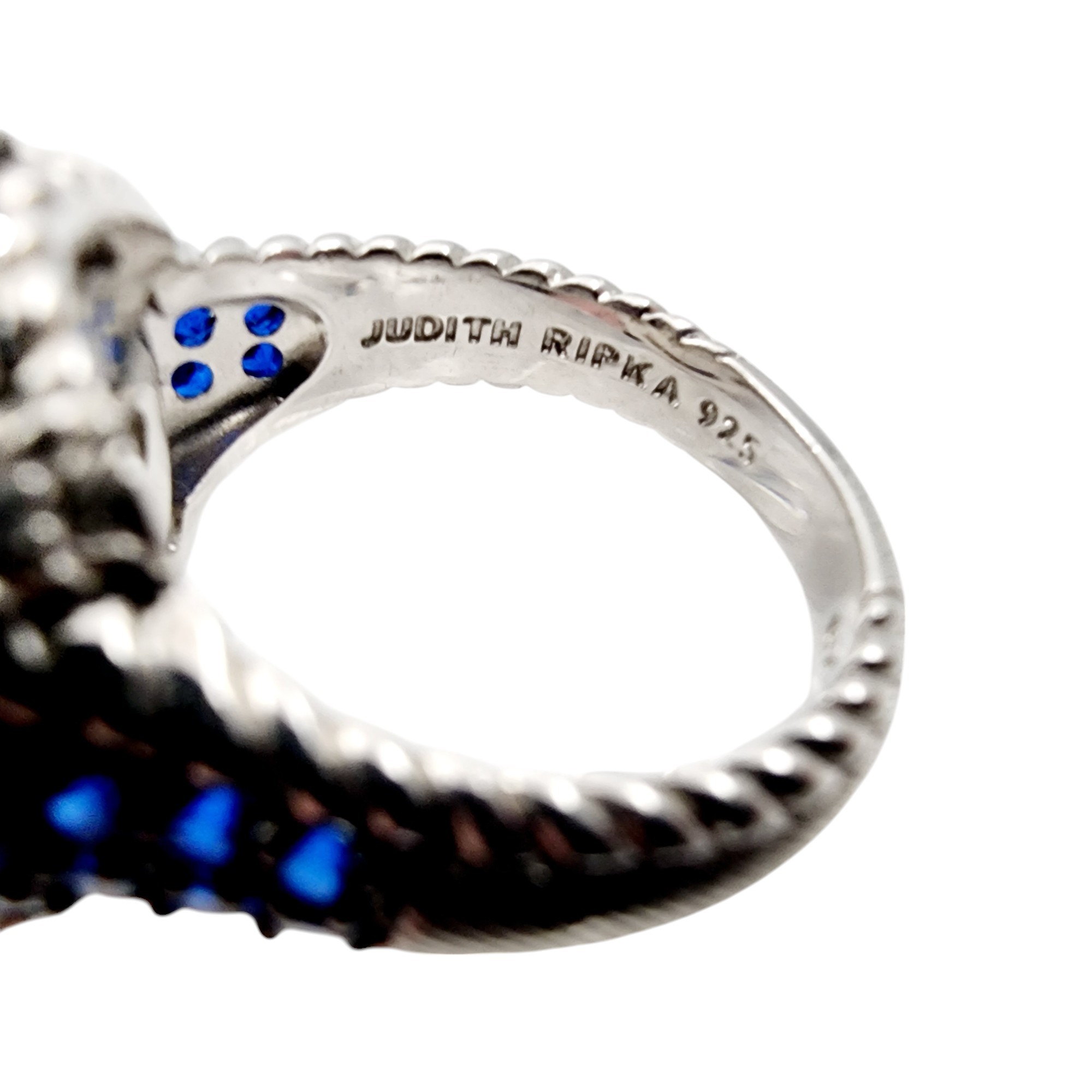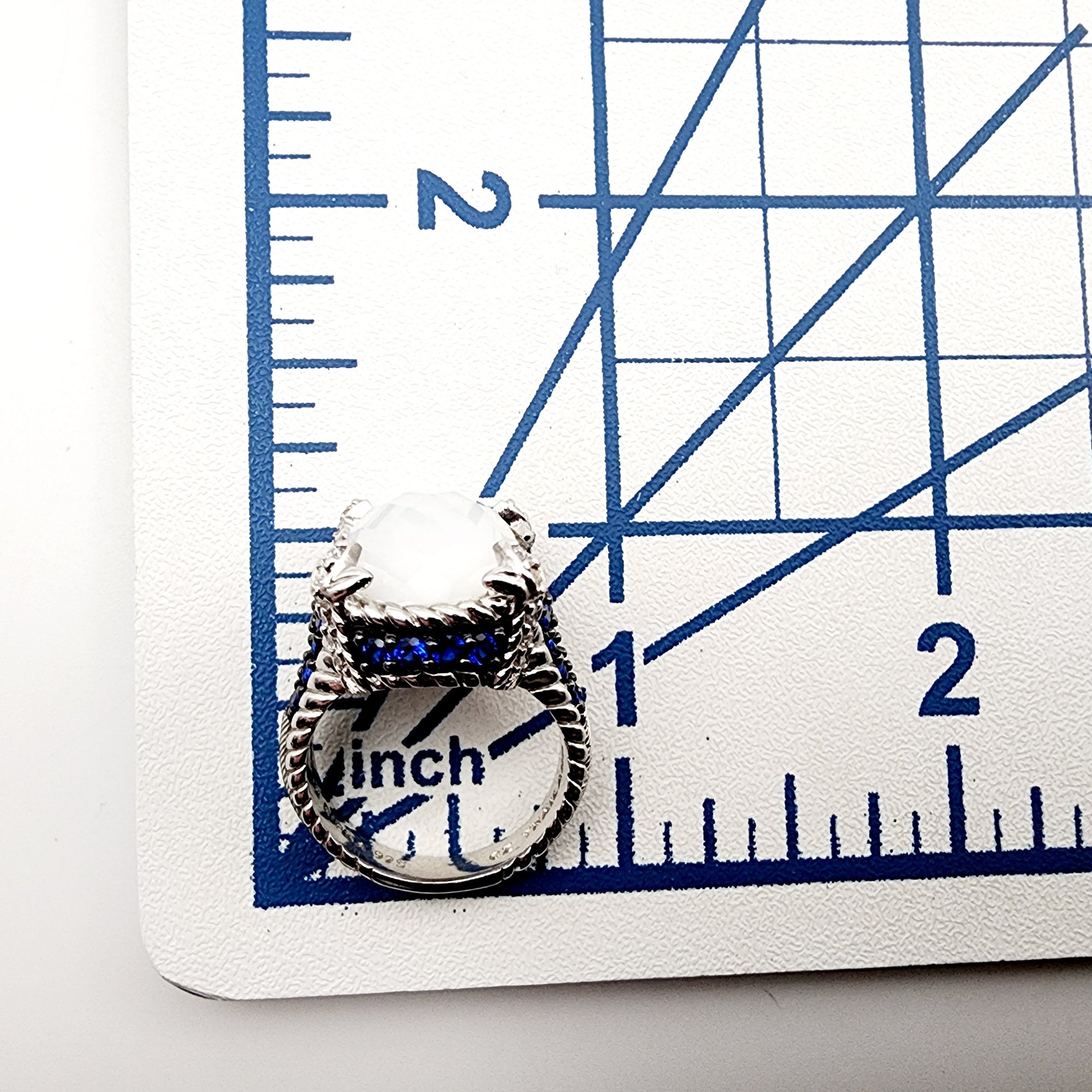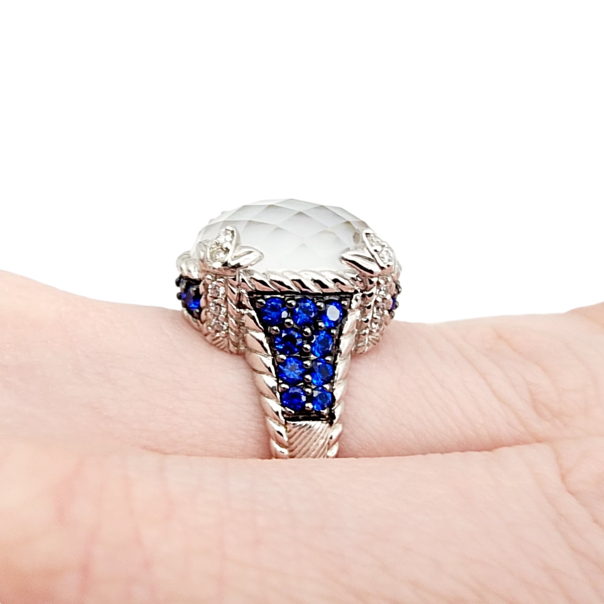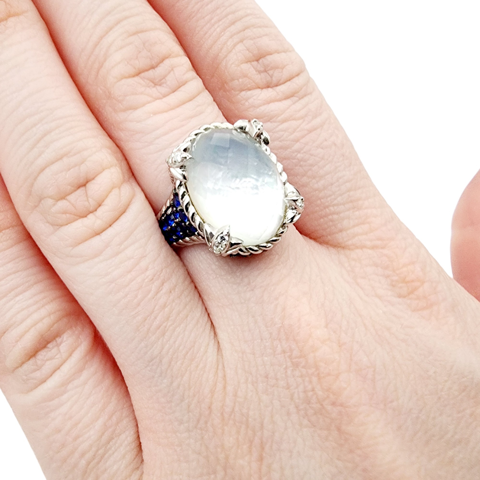 Judith Ripka Sterling Monaco Oval Doublet Ring Sz 7, Blue sapphire, white chalcedony/quartz, and CZ. 10.1g