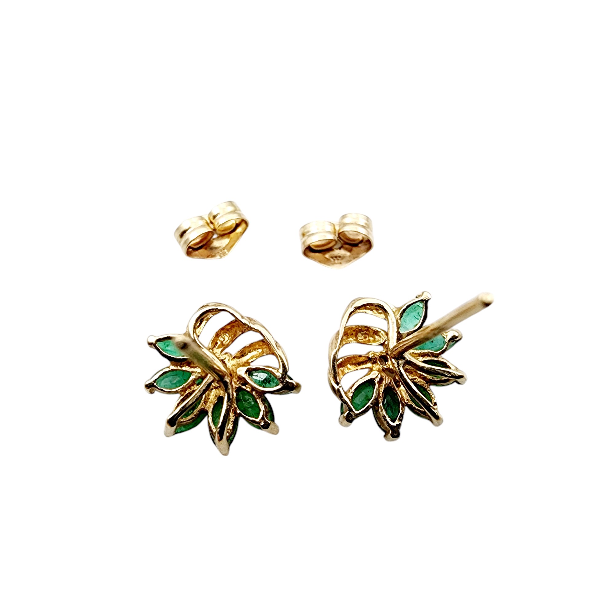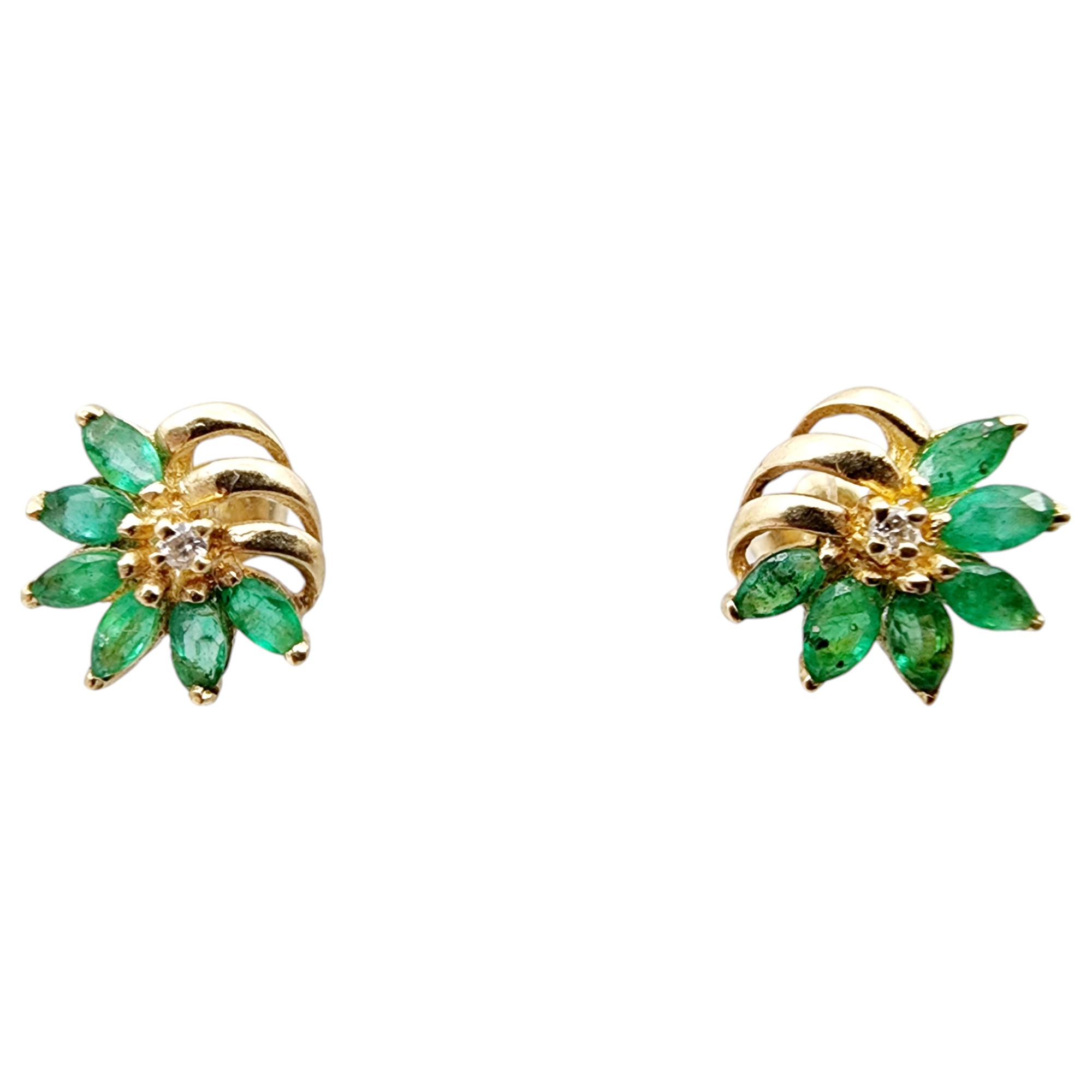 14k Gold Emerald Diamond Earrings 1.3g w/backs, tested with diamond tester, please note diamond tester accuracy decreases with size of stone. Unable to verify if diamond tester reading is correct.