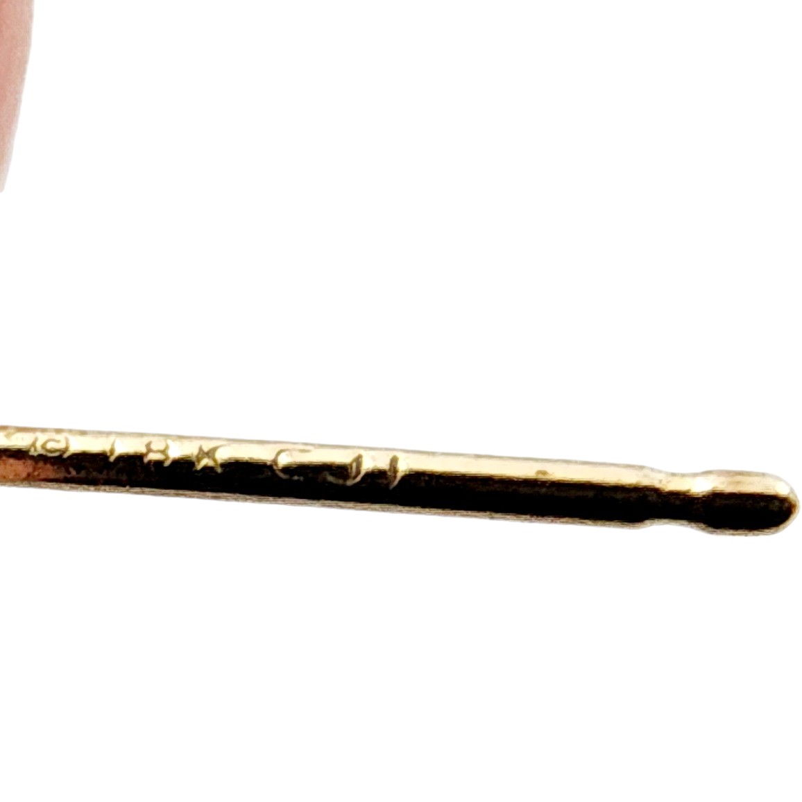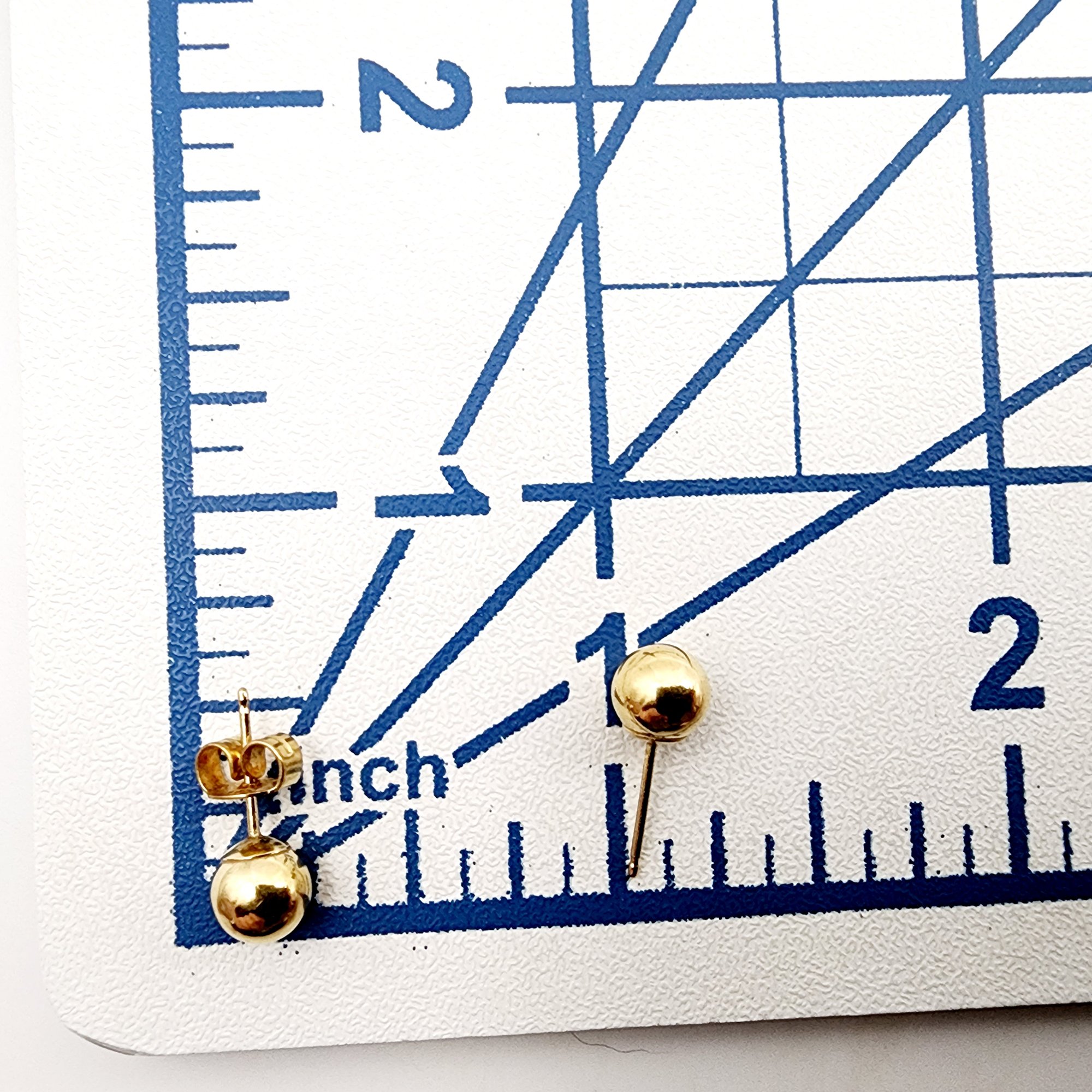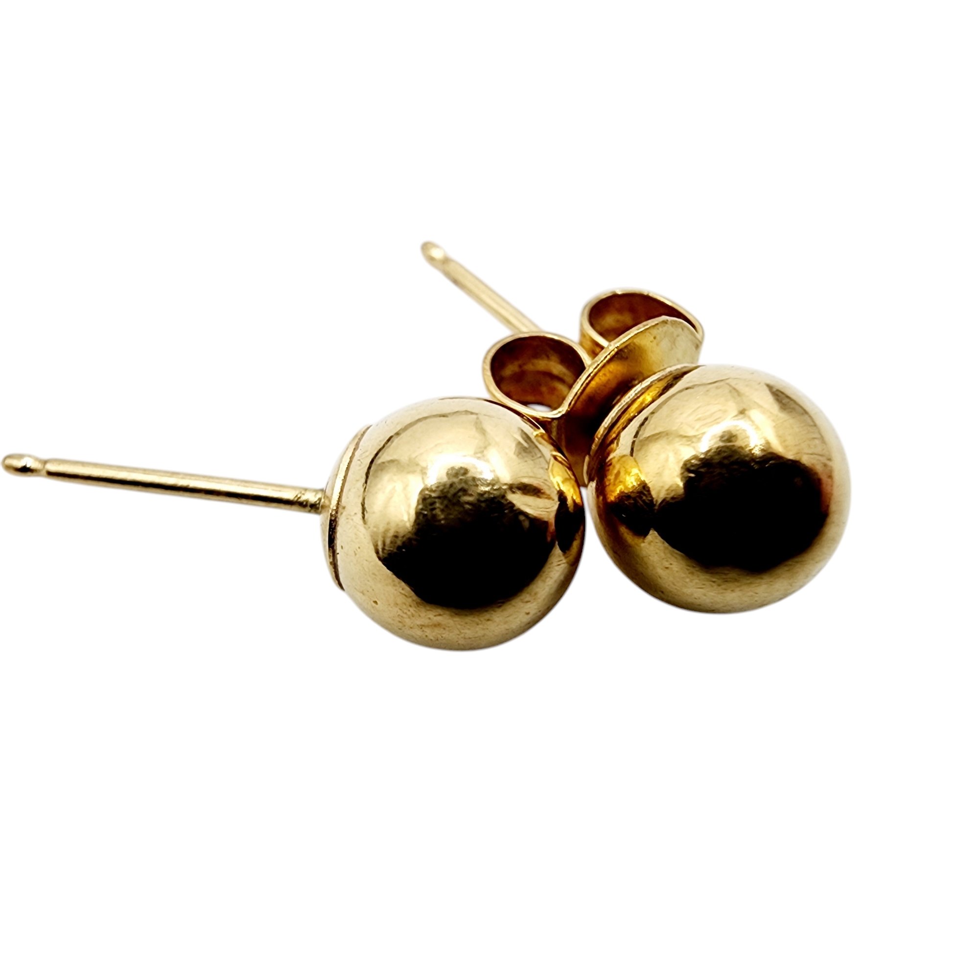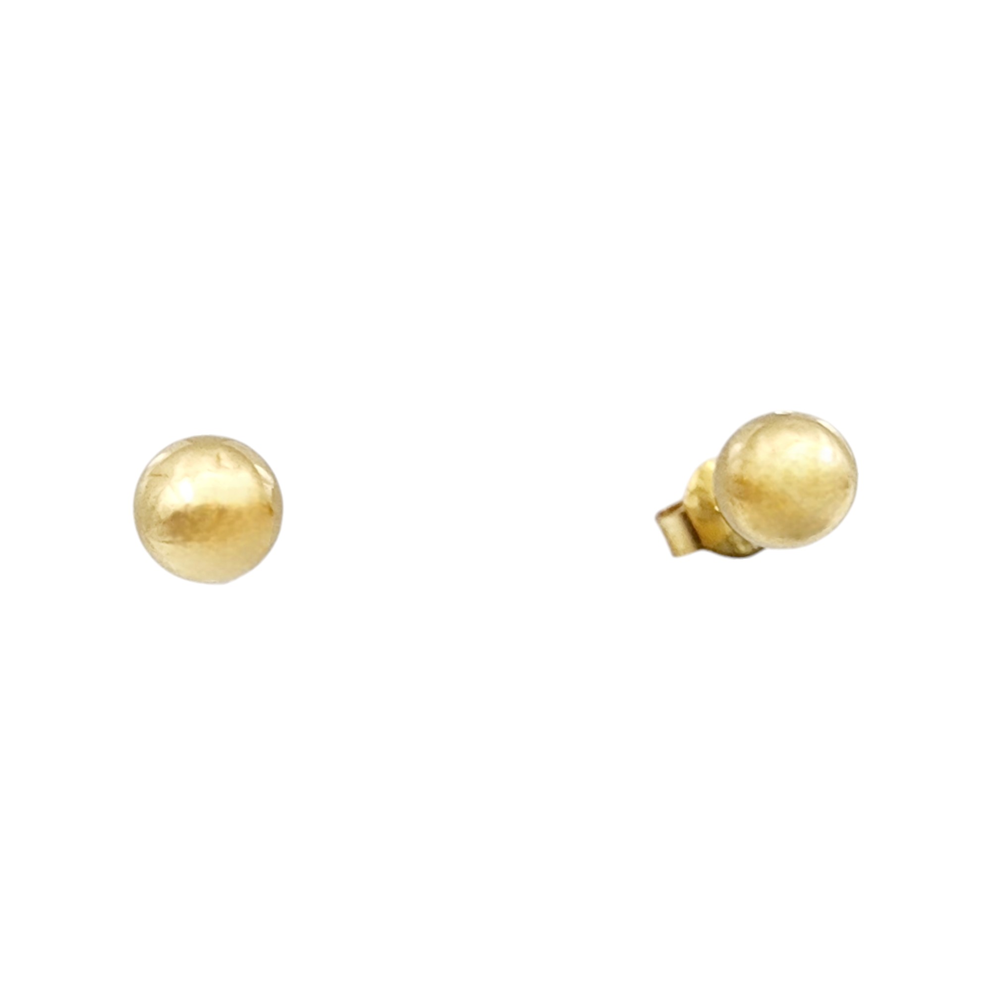 18k Gold Ball Stud Earrings .53g. As is – one 18k back. Some areas of indentation, dimples are present.