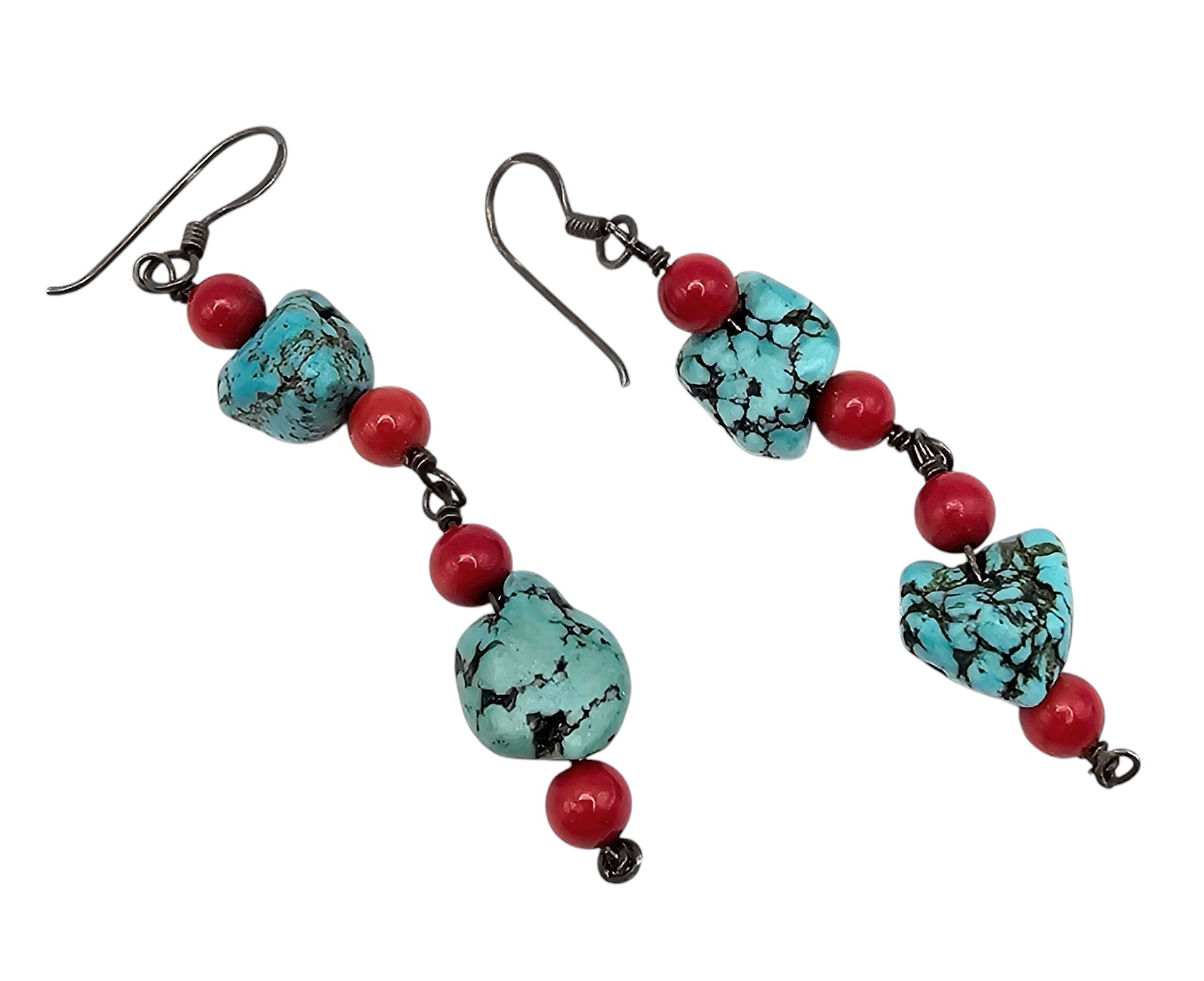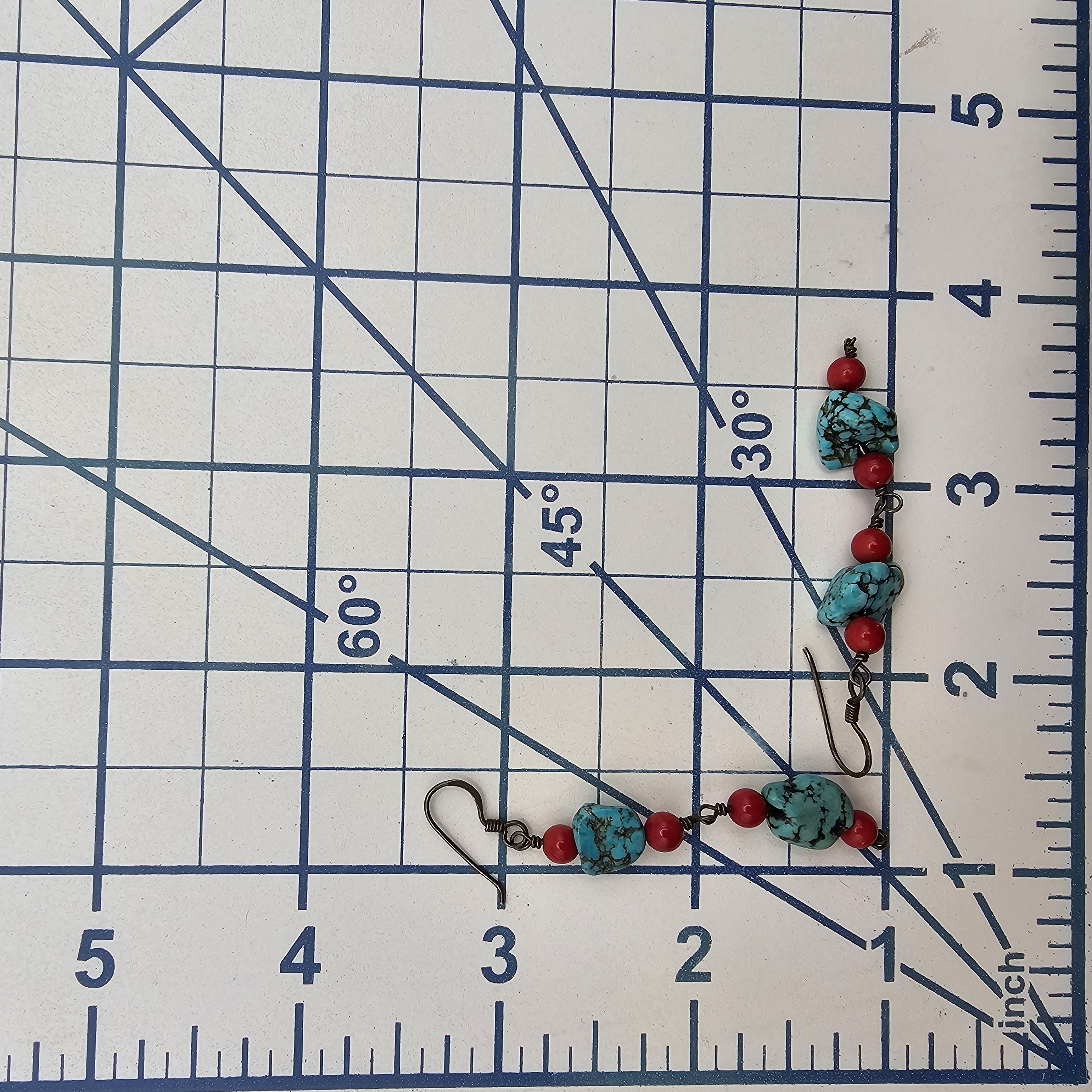 Navajo Chunk Turquoise Coral Bead Sterling Hook Dangle Earrings 5g