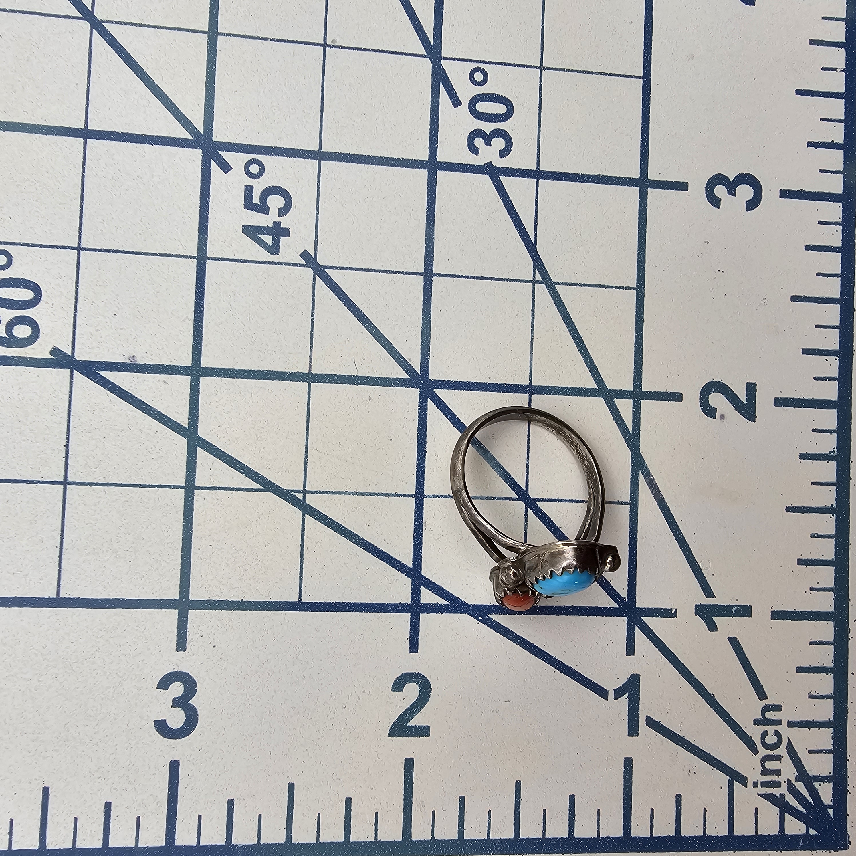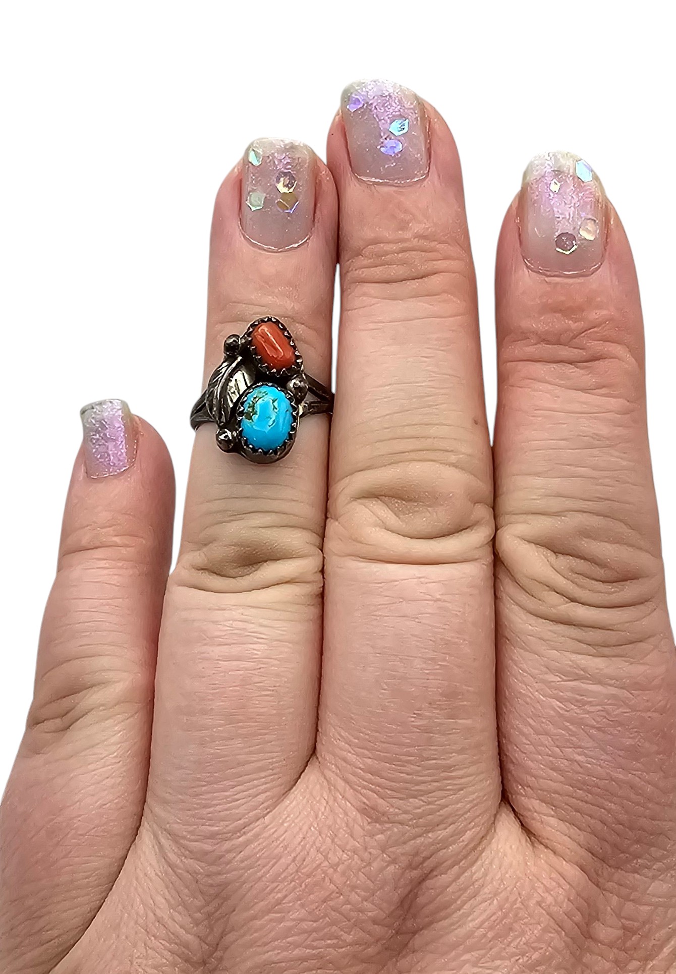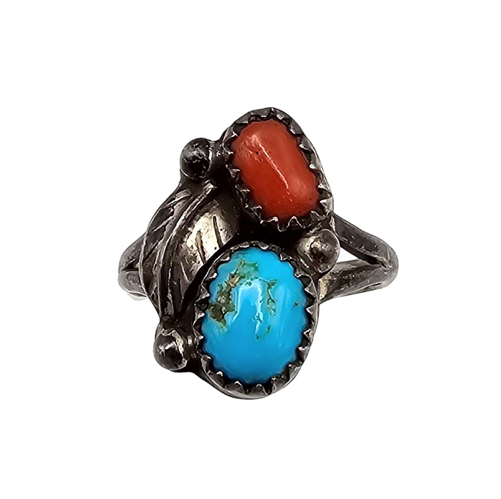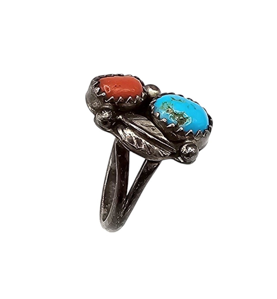Vintage Navajo Coral Turquoise Sterling Leaf Ring Sz 4.75, 3g