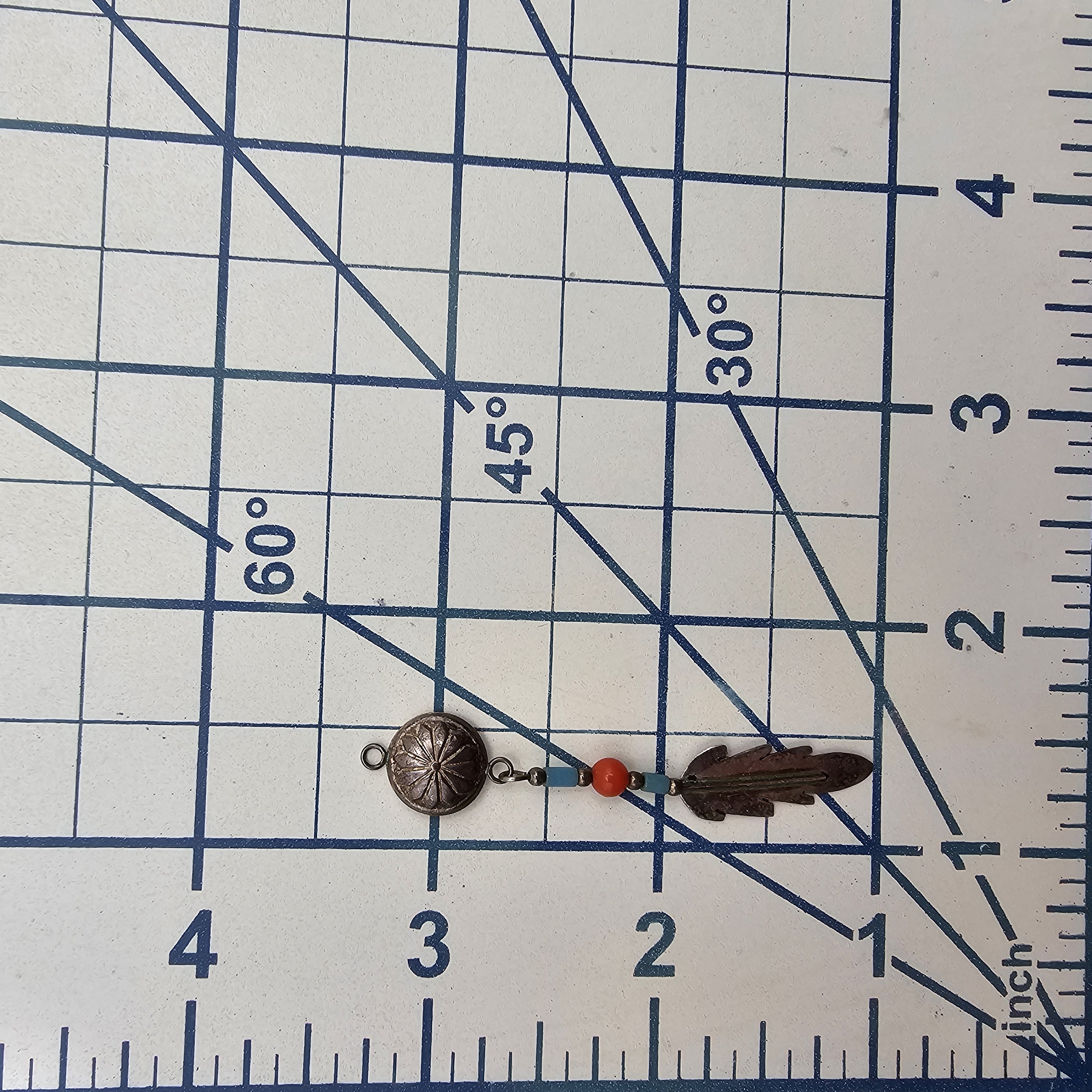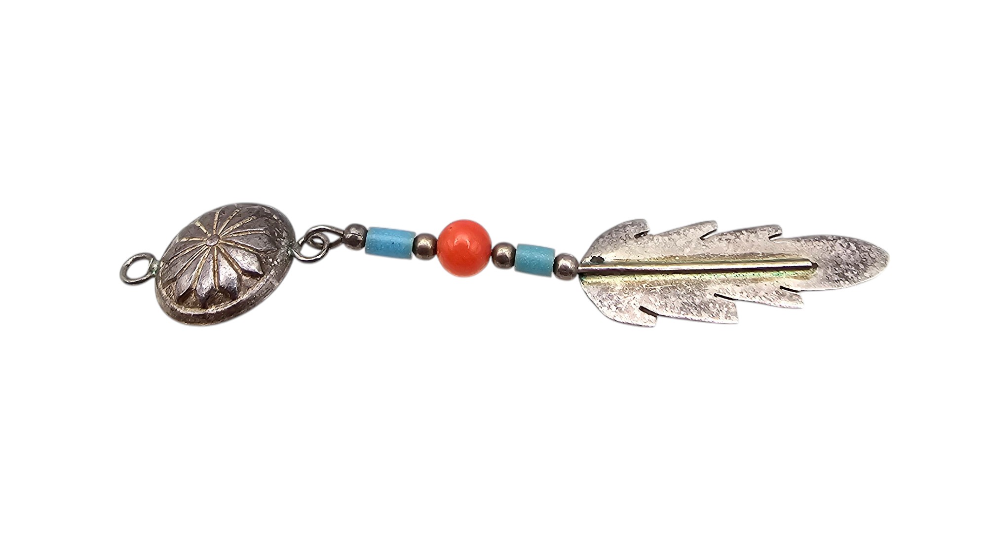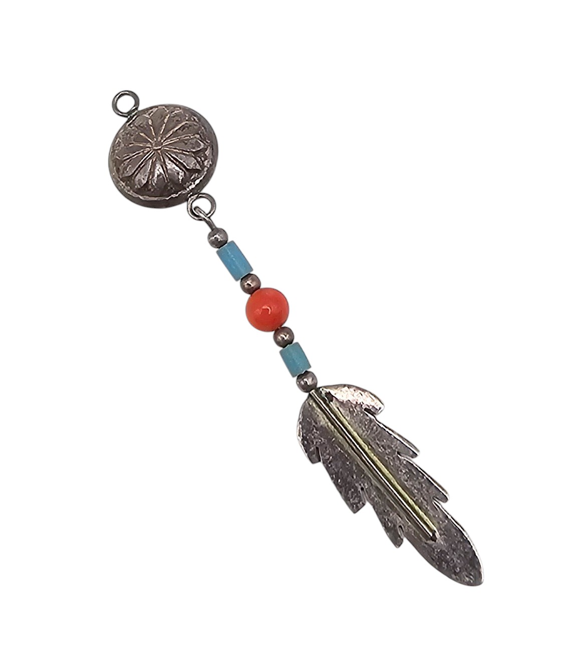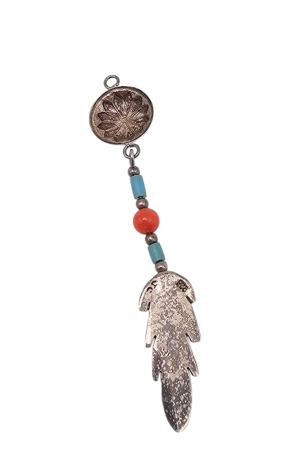 Signed JC Turquoise Coral Sterling Concho Feather Pendant 1g