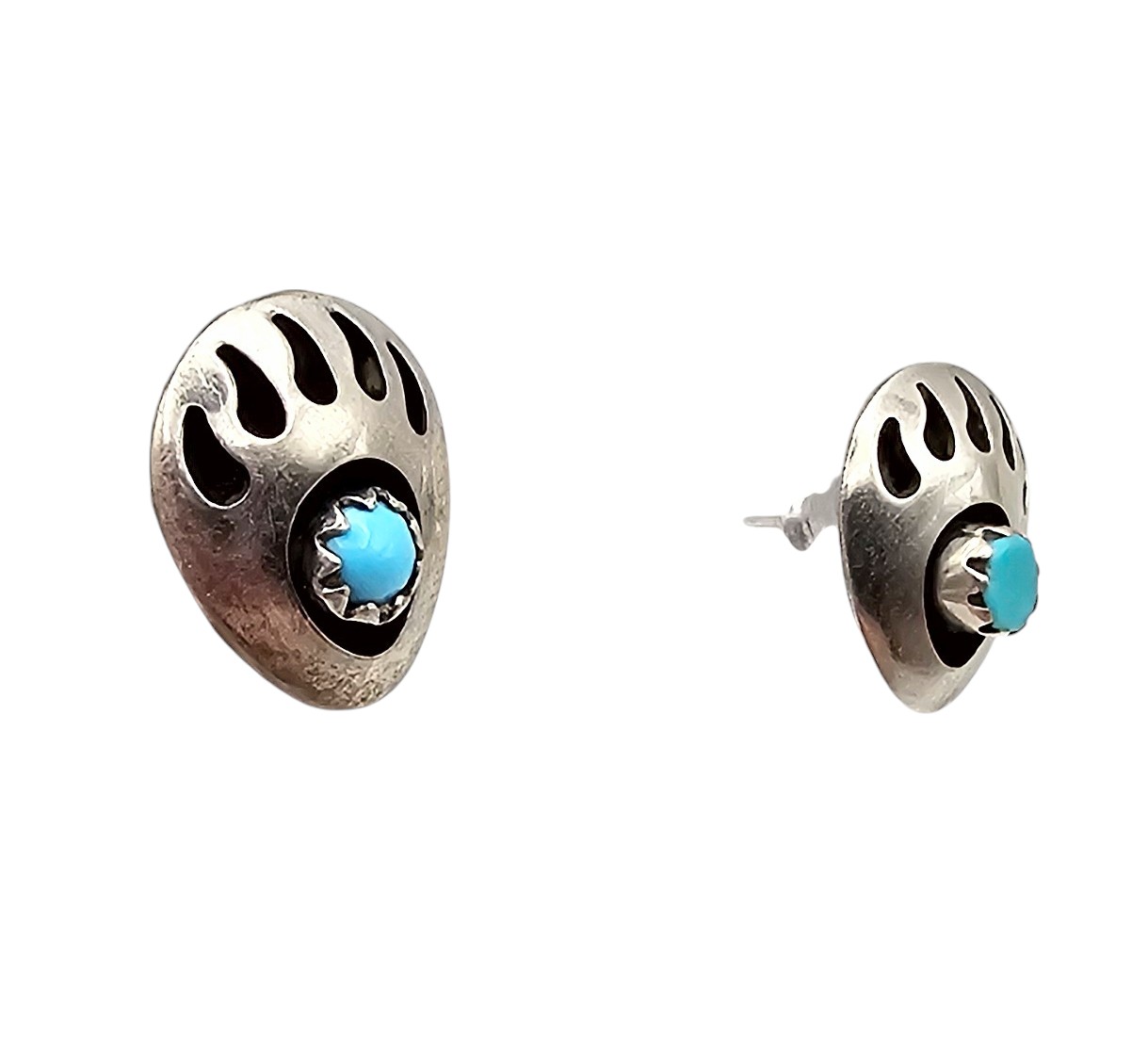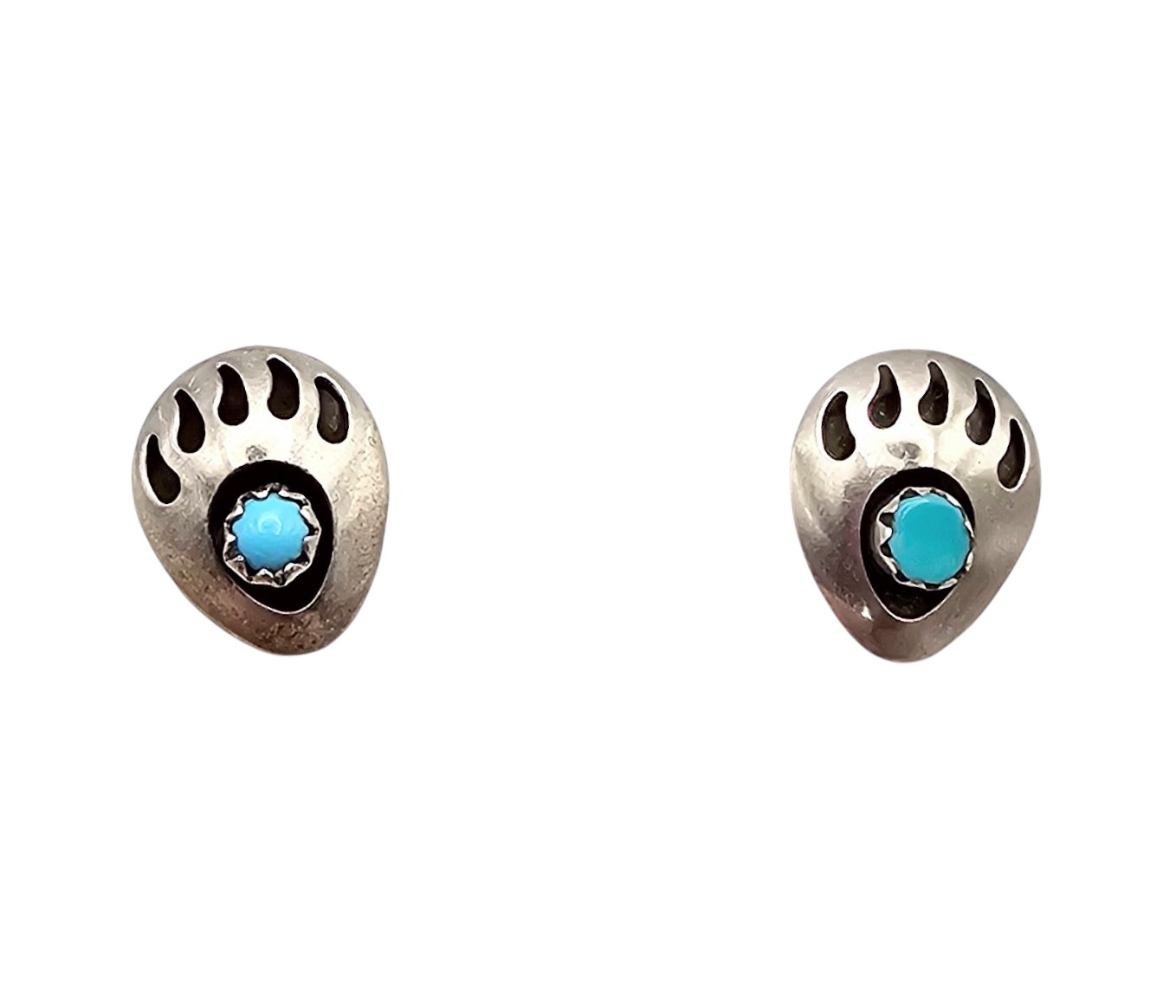 Vintage Navajo Turquoise Sterling Bear Paw Shadow Box Stud Earrings 1.5g