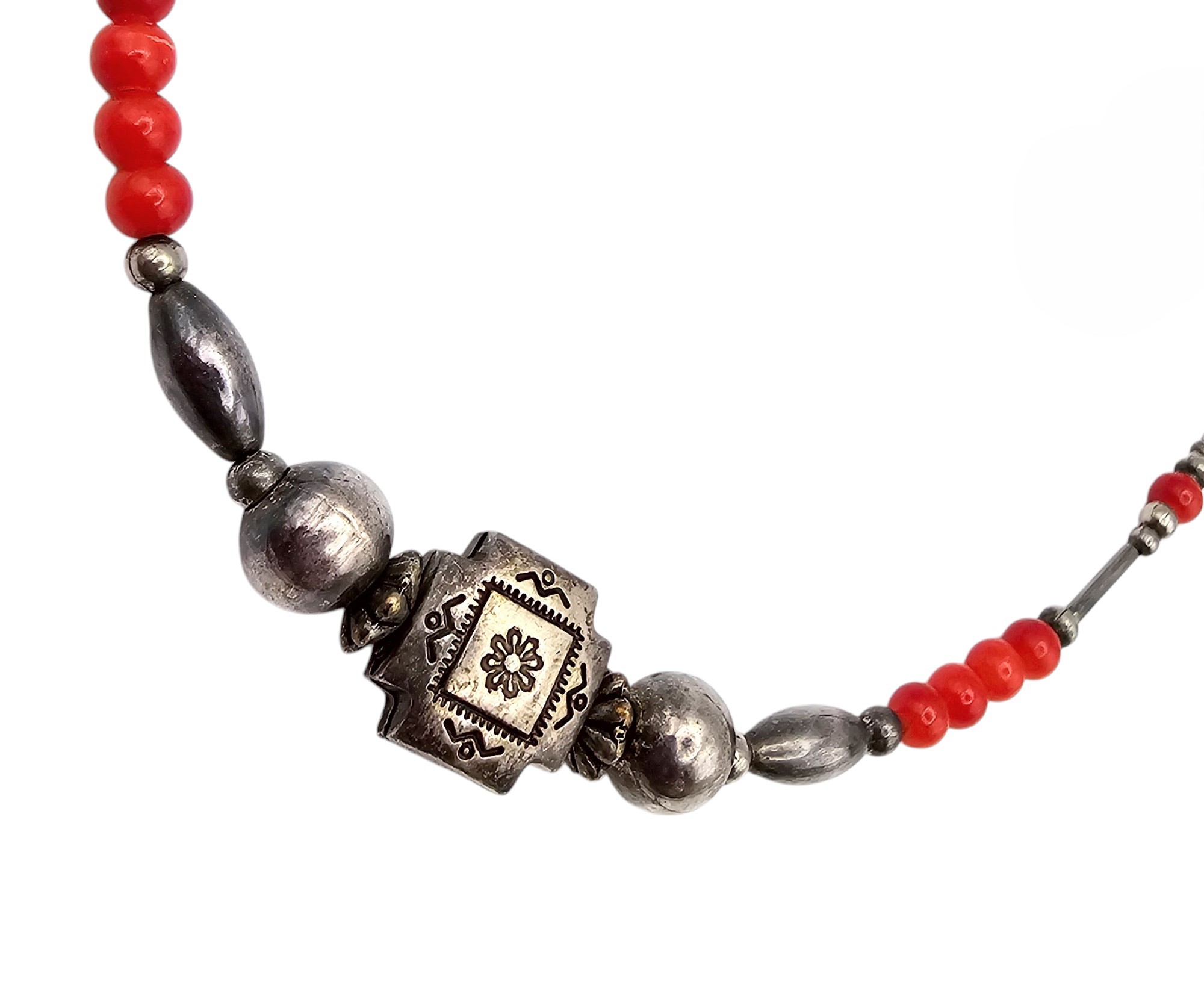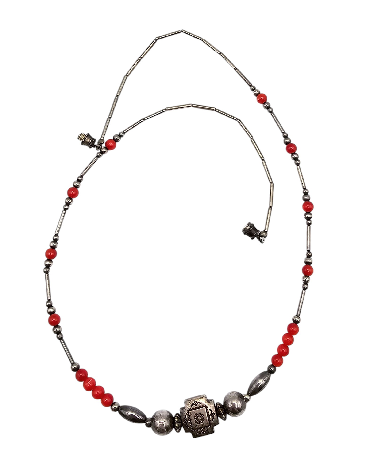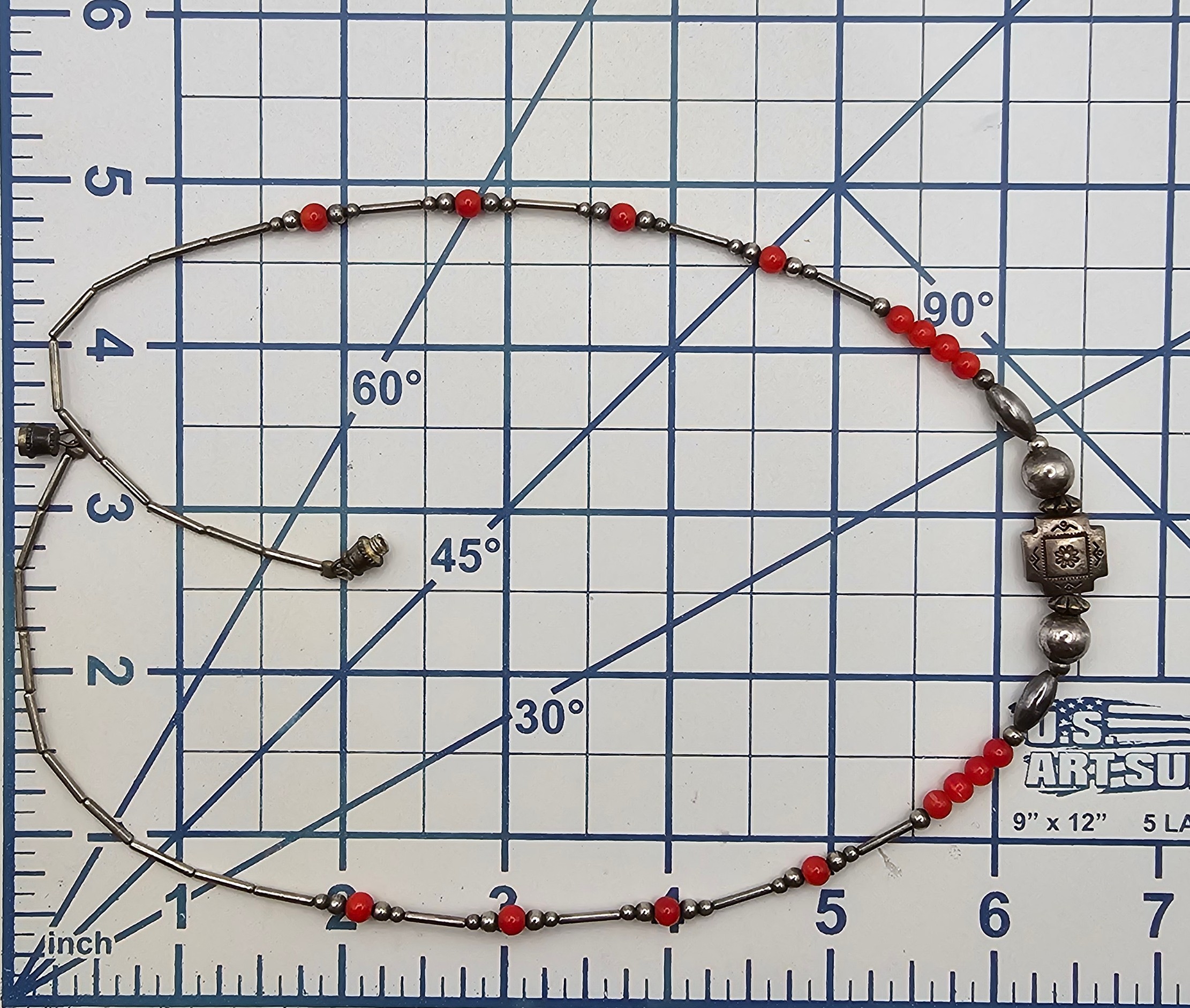 Native American Stamped Liquid Sterling Silver Red Bead Necklace 9.5g