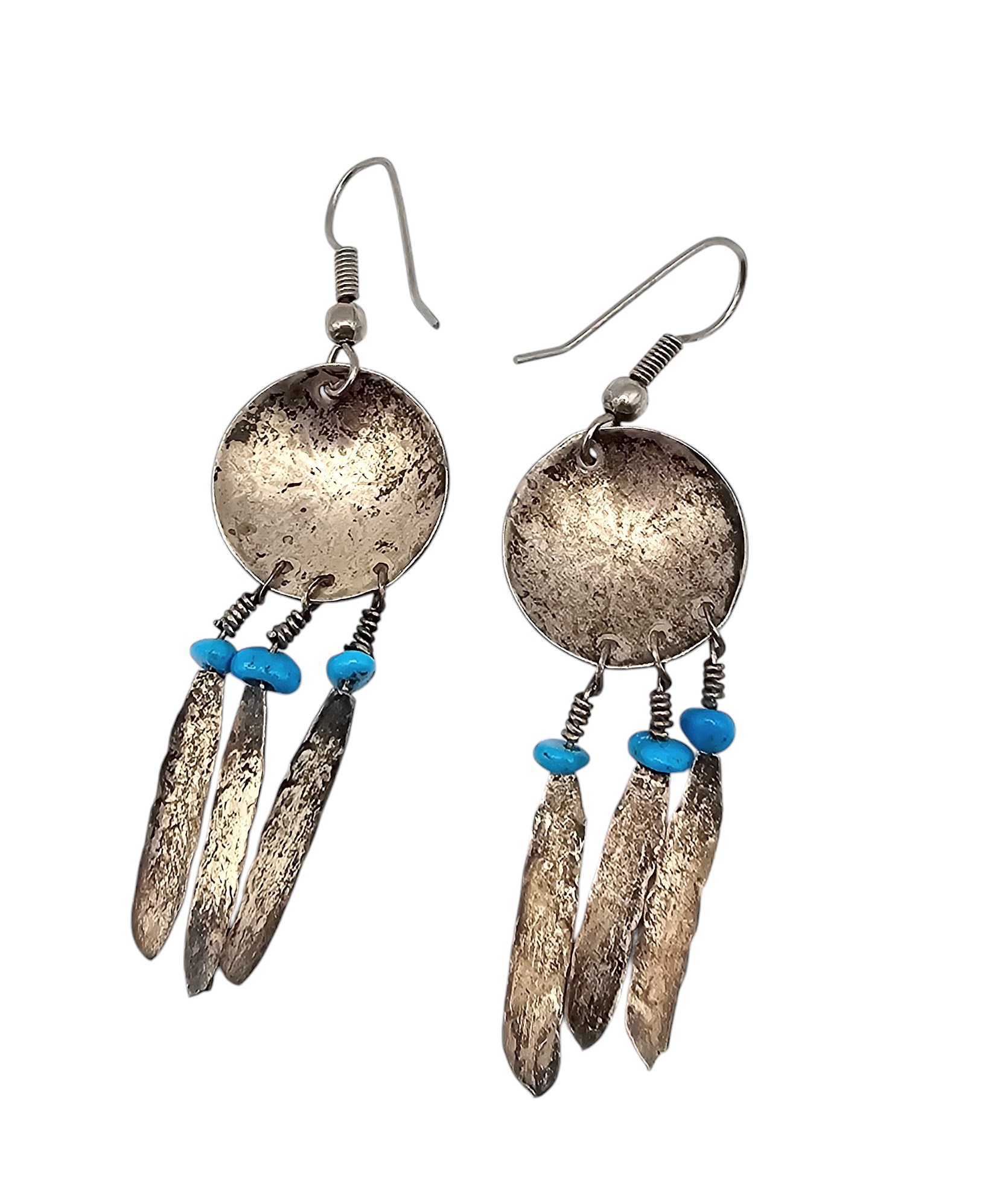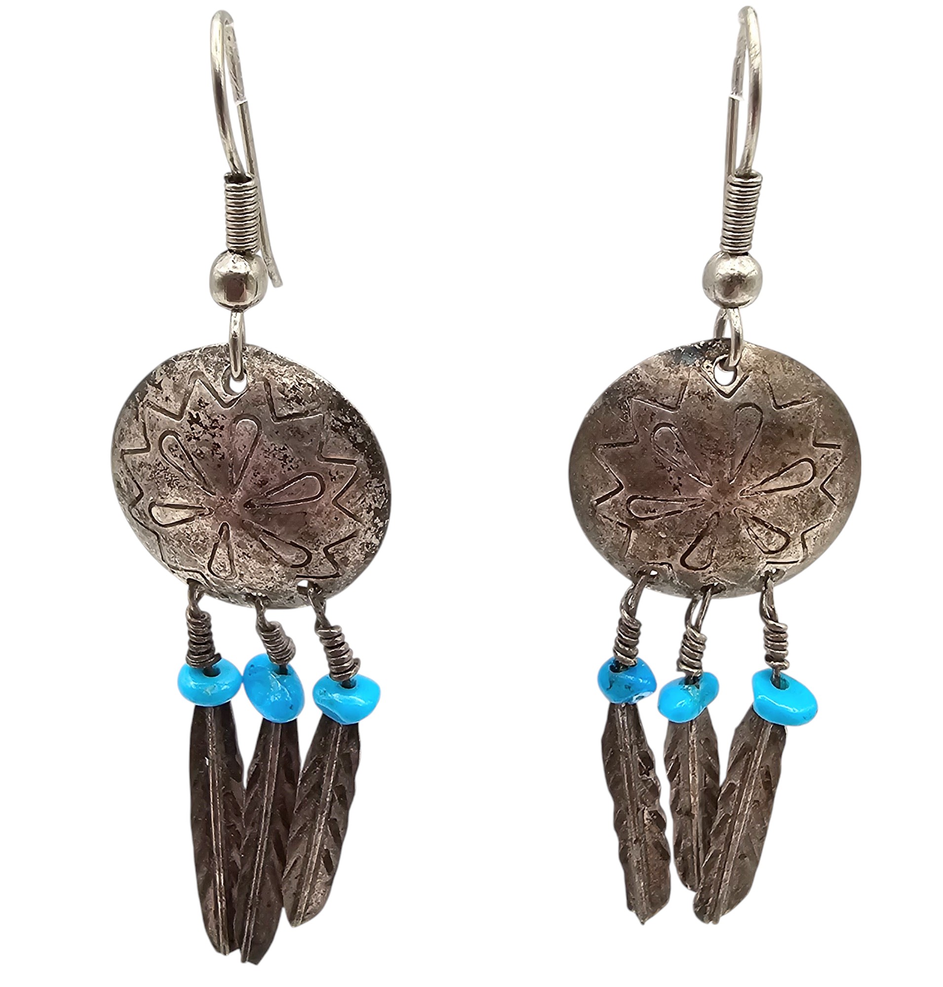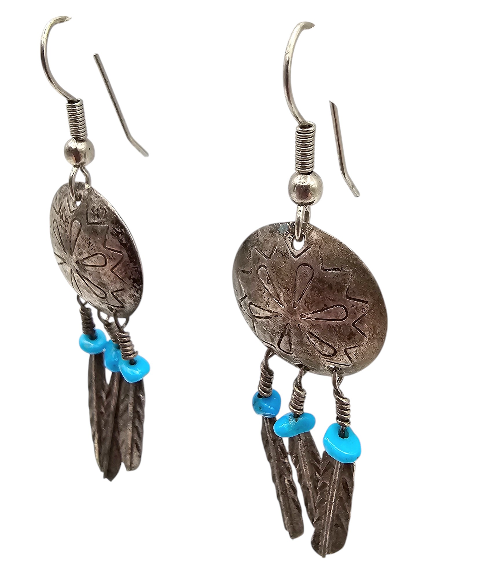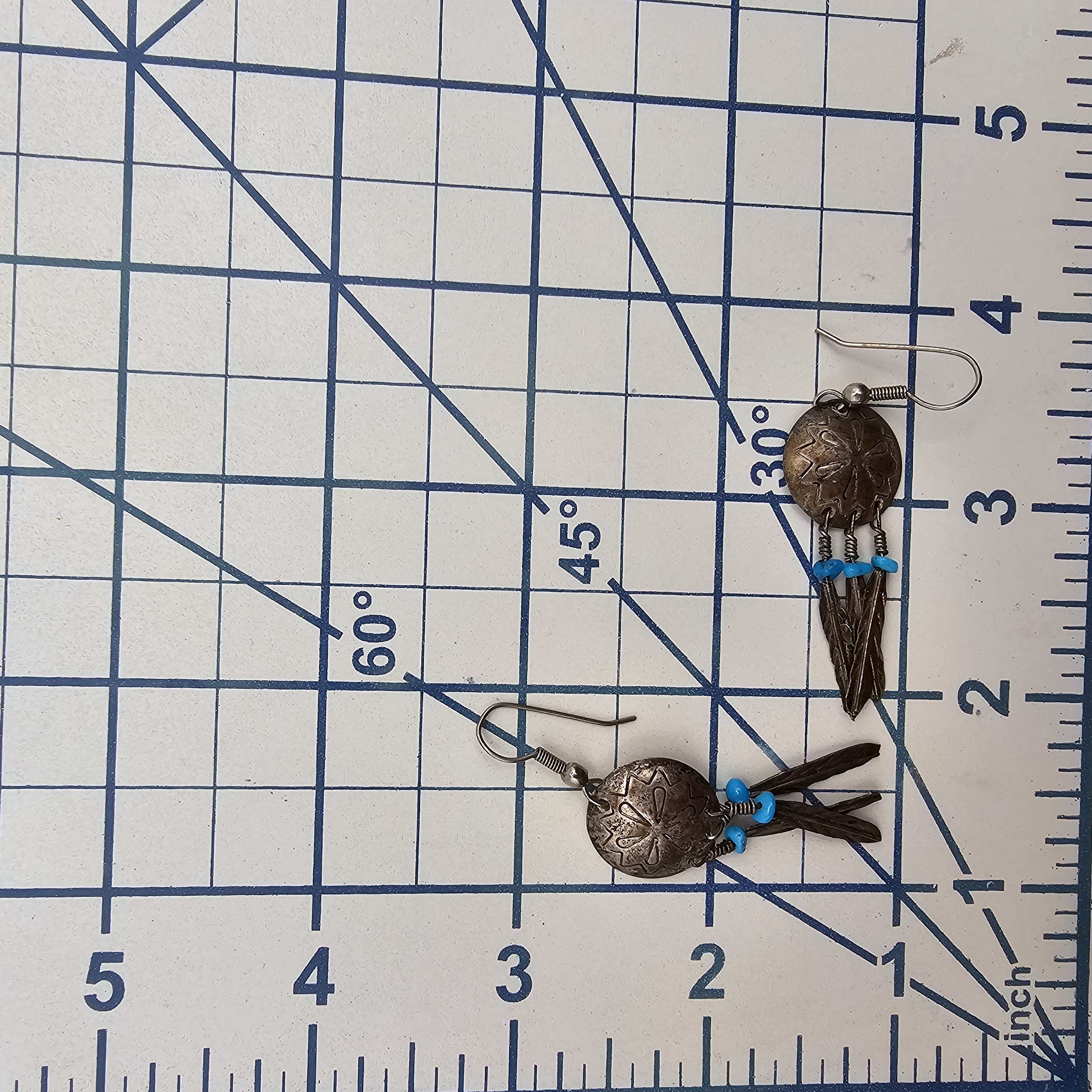 Vintage Navajo Turquoise Sterling Concho Feather Dangle Earrings 4.5g