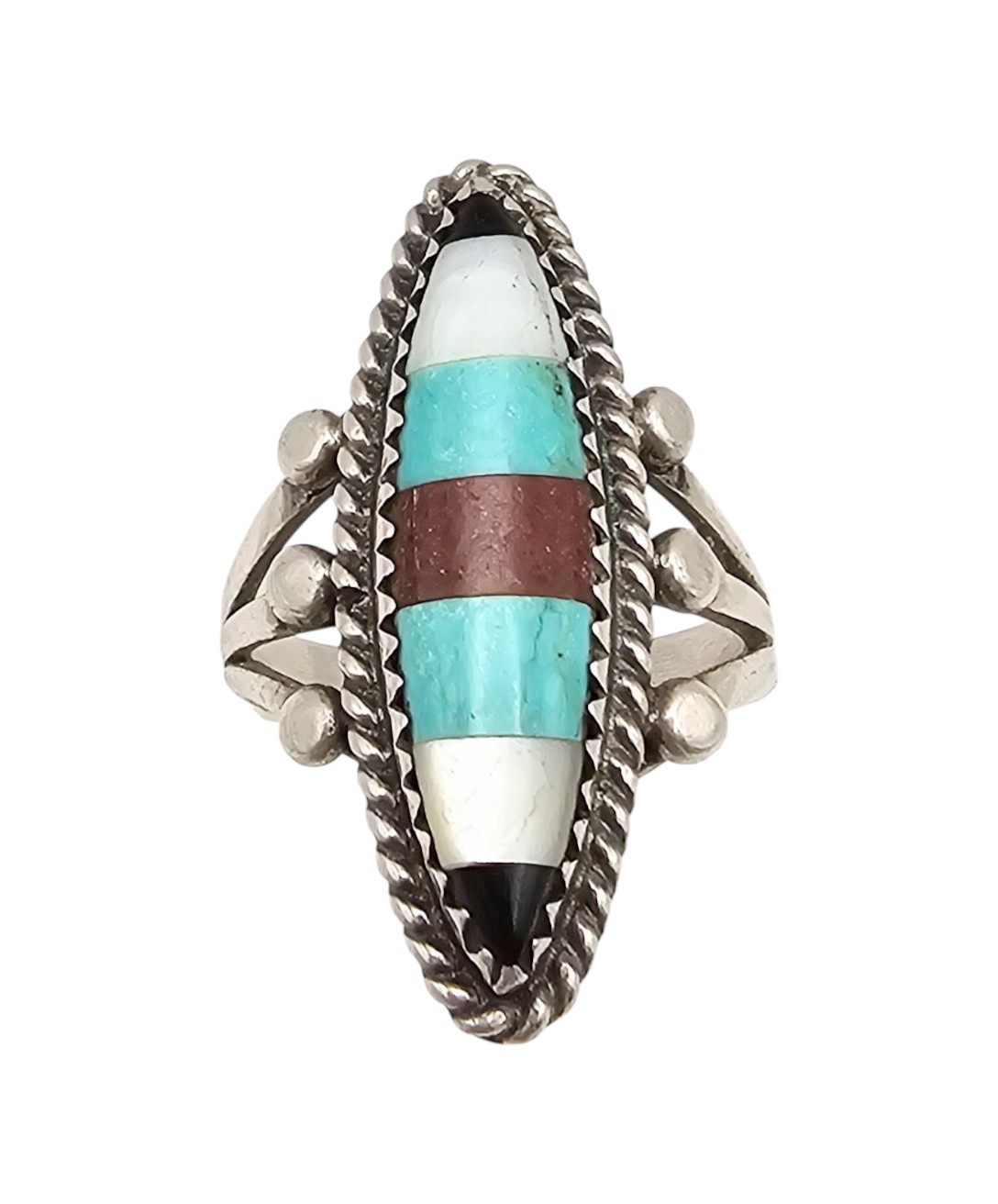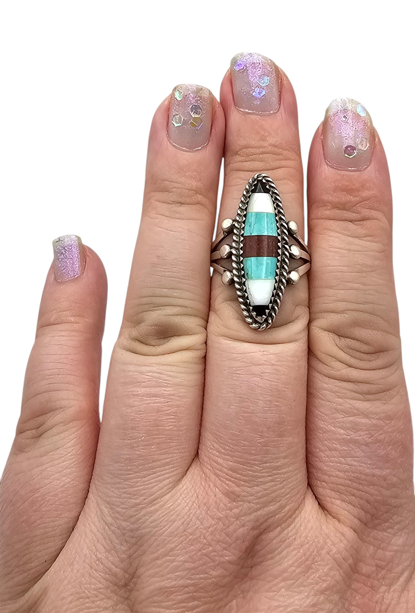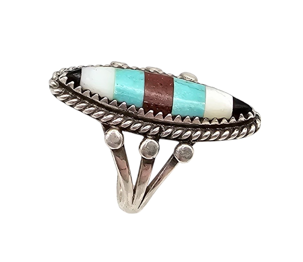 Vintage Navajo Ony Mother of Pearl Turquoise Agate Sterling Inlay Ring Sz 7.25, 6.5g