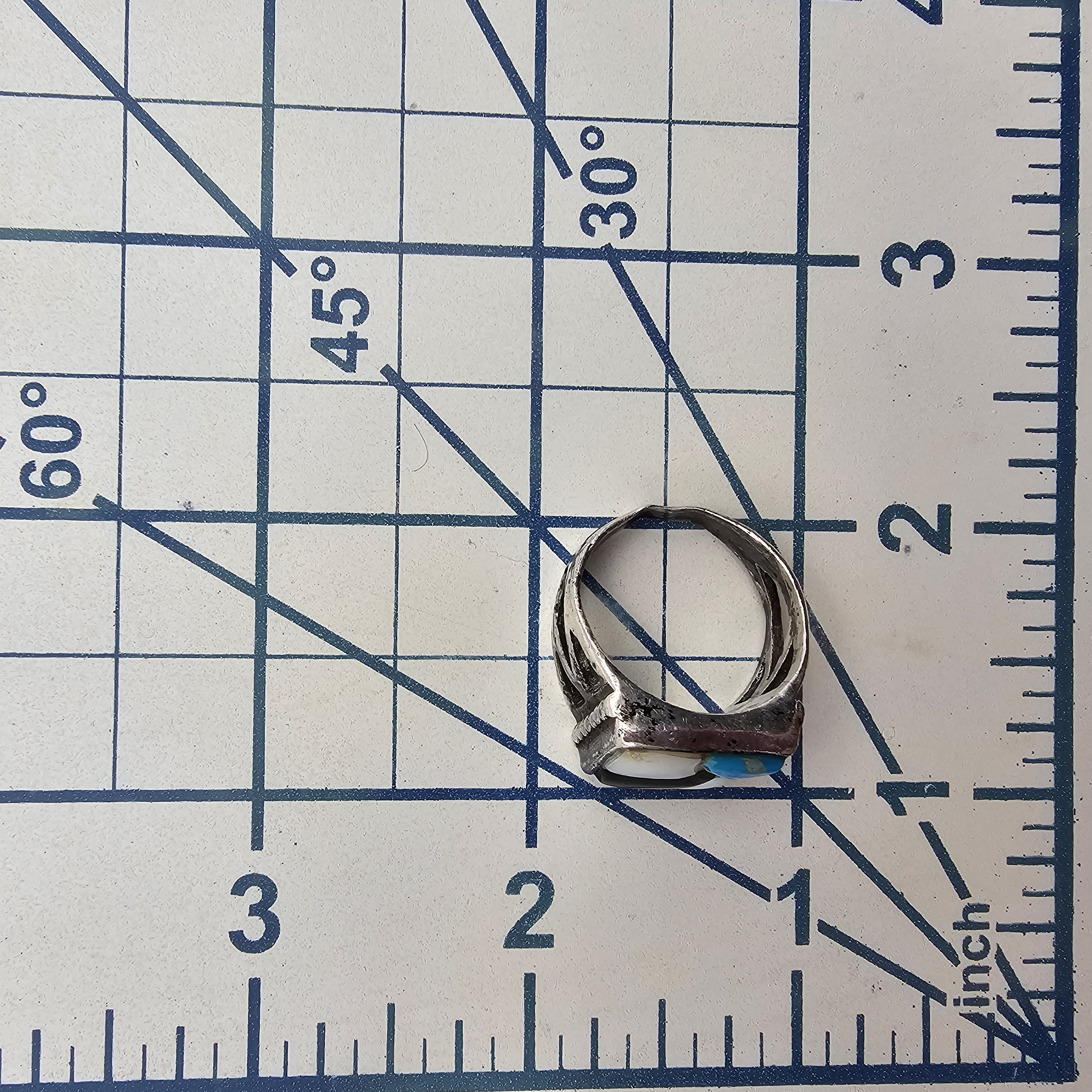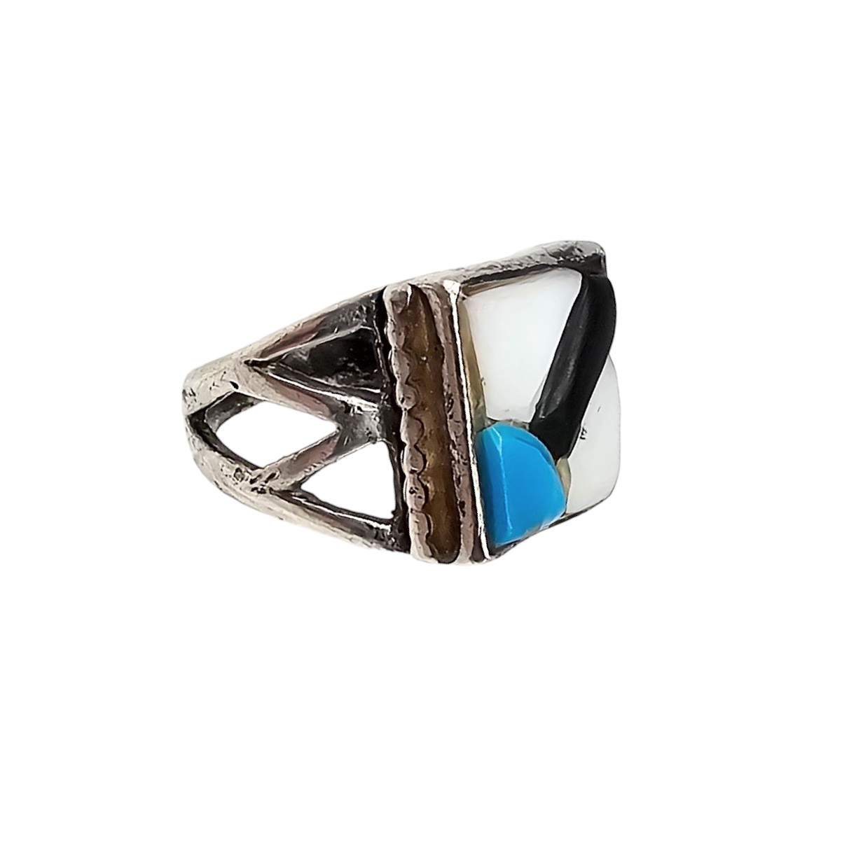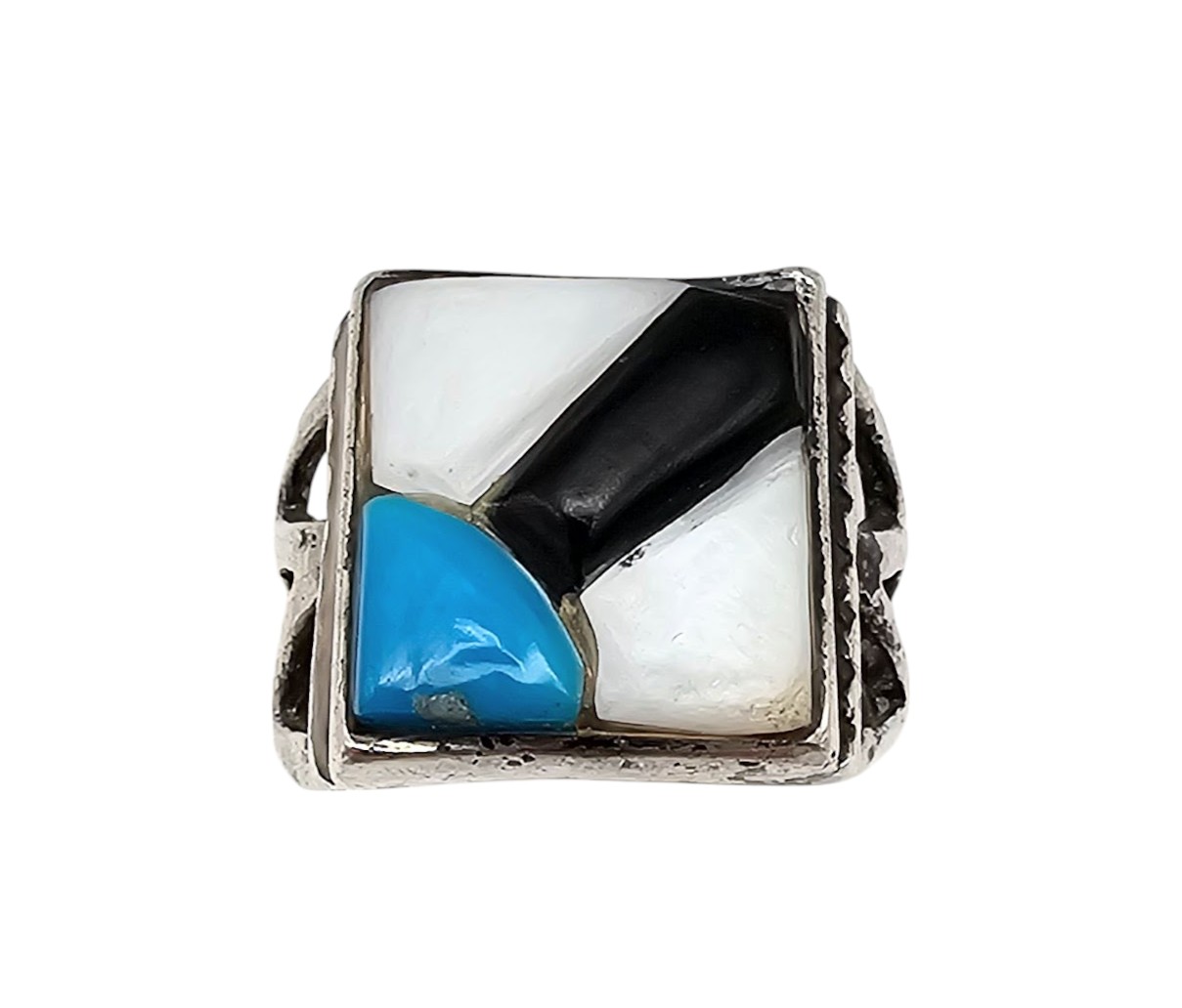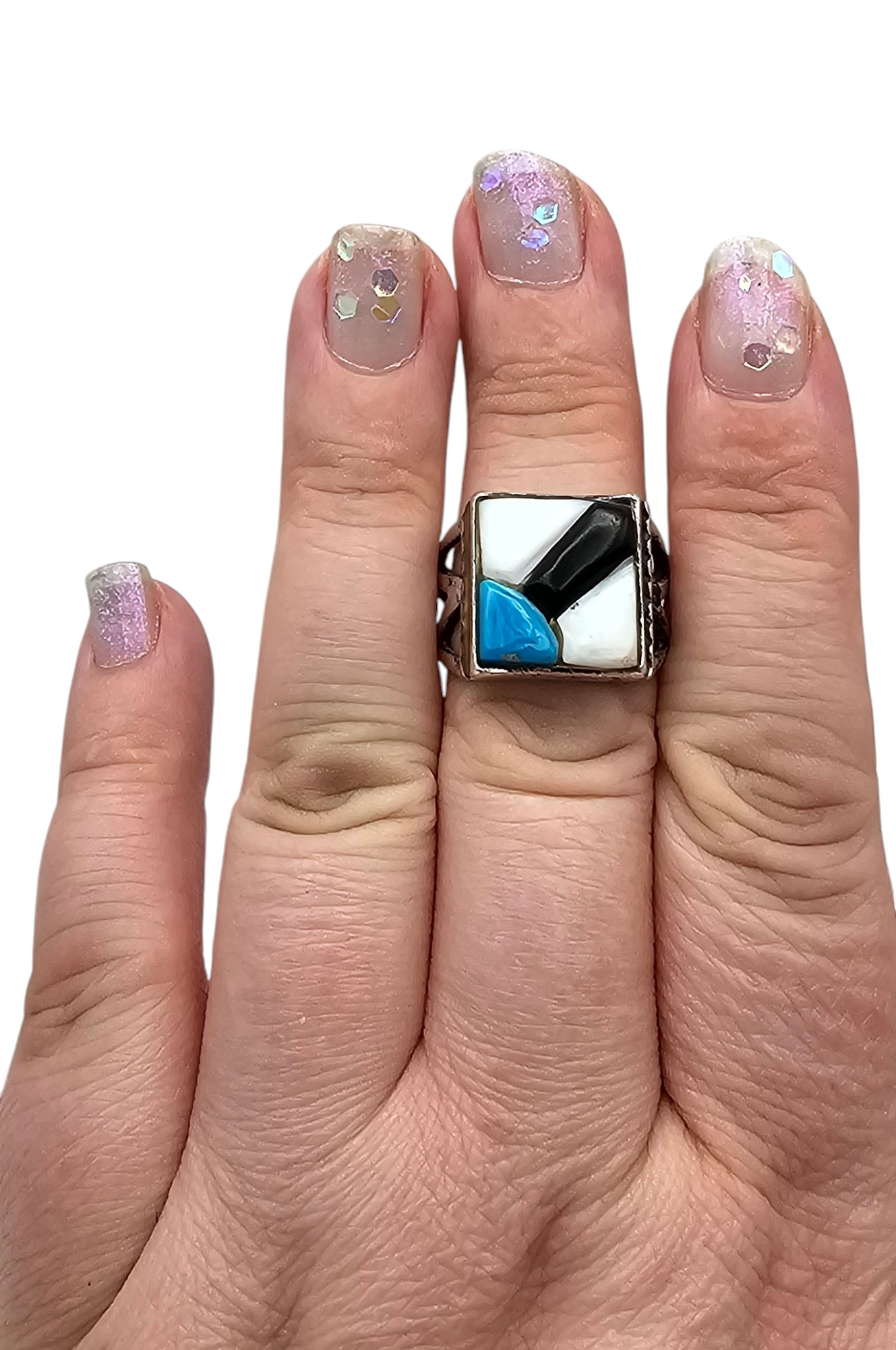 Vintage Navajo Onyx Turquoise Mother of Pearl Sterling Inlay Ring Sz 7.75, 10g
