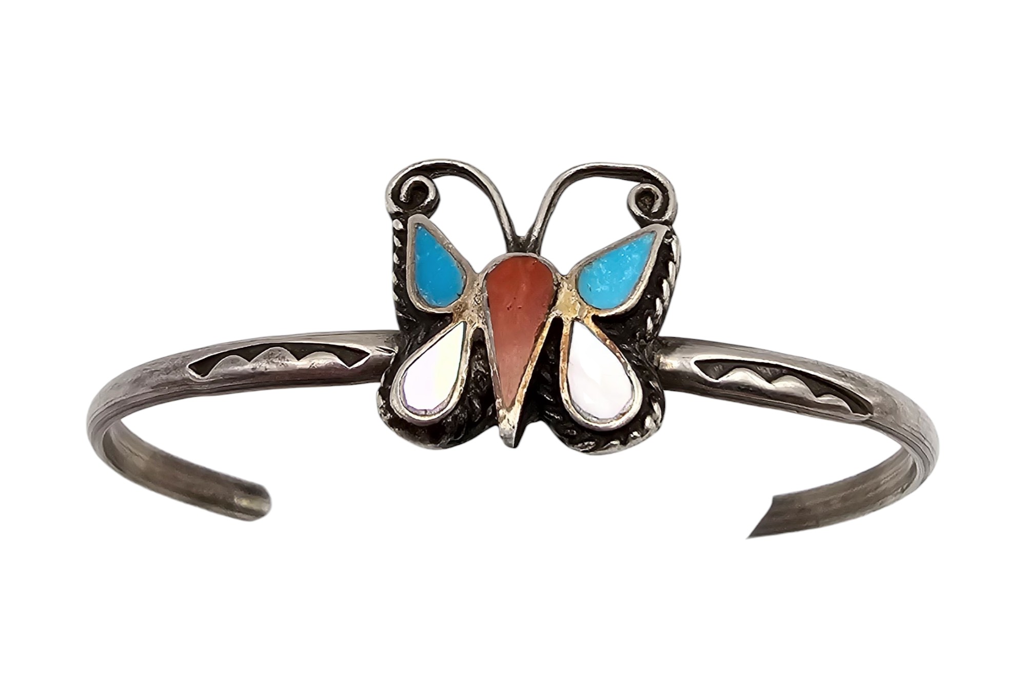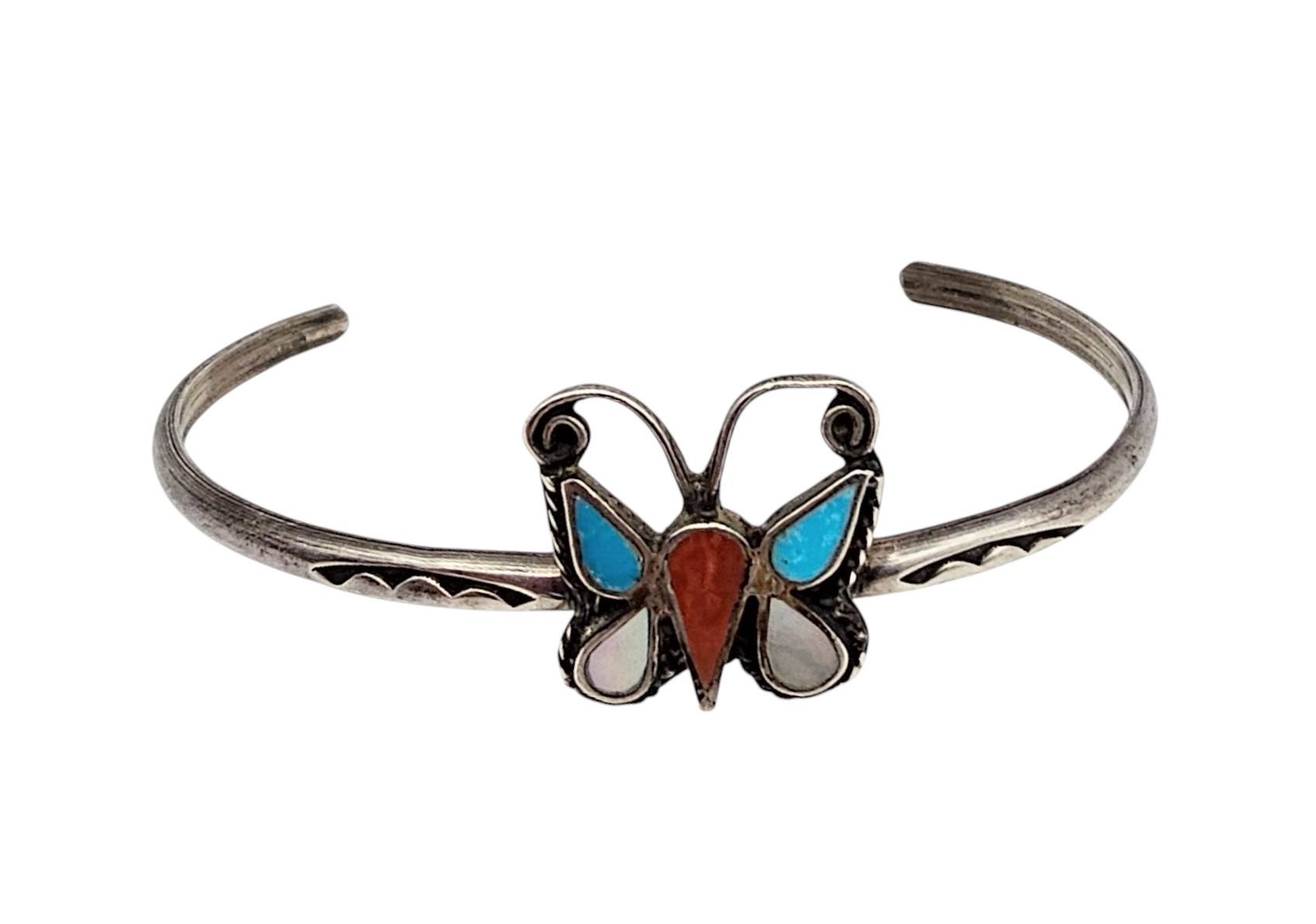 Vintage Native Coral Turquoise Mother Of Pearl Sterling Silver Butterfly Cuff Bracelet 8.1 G