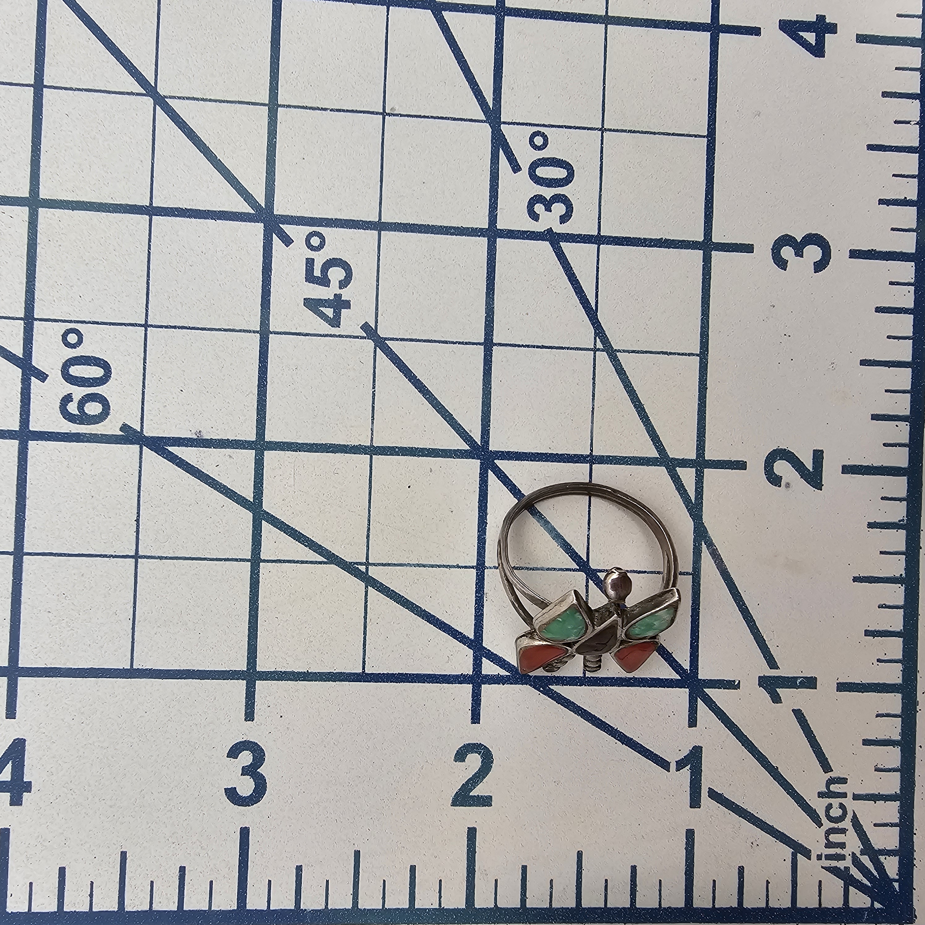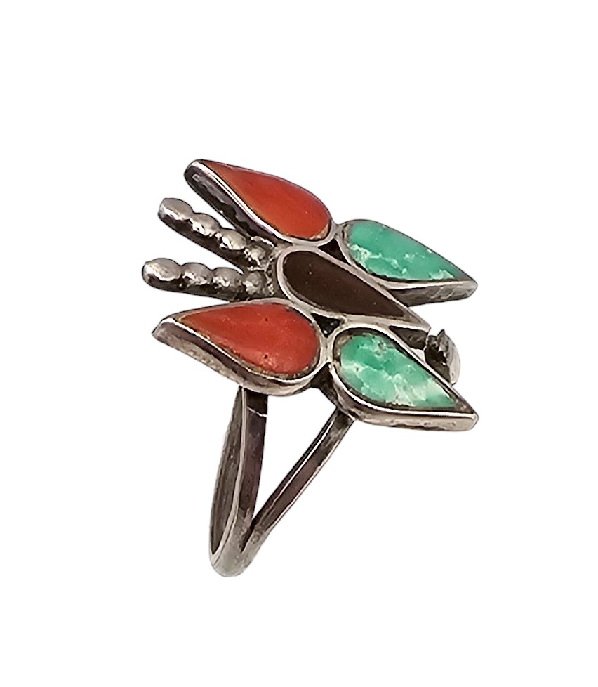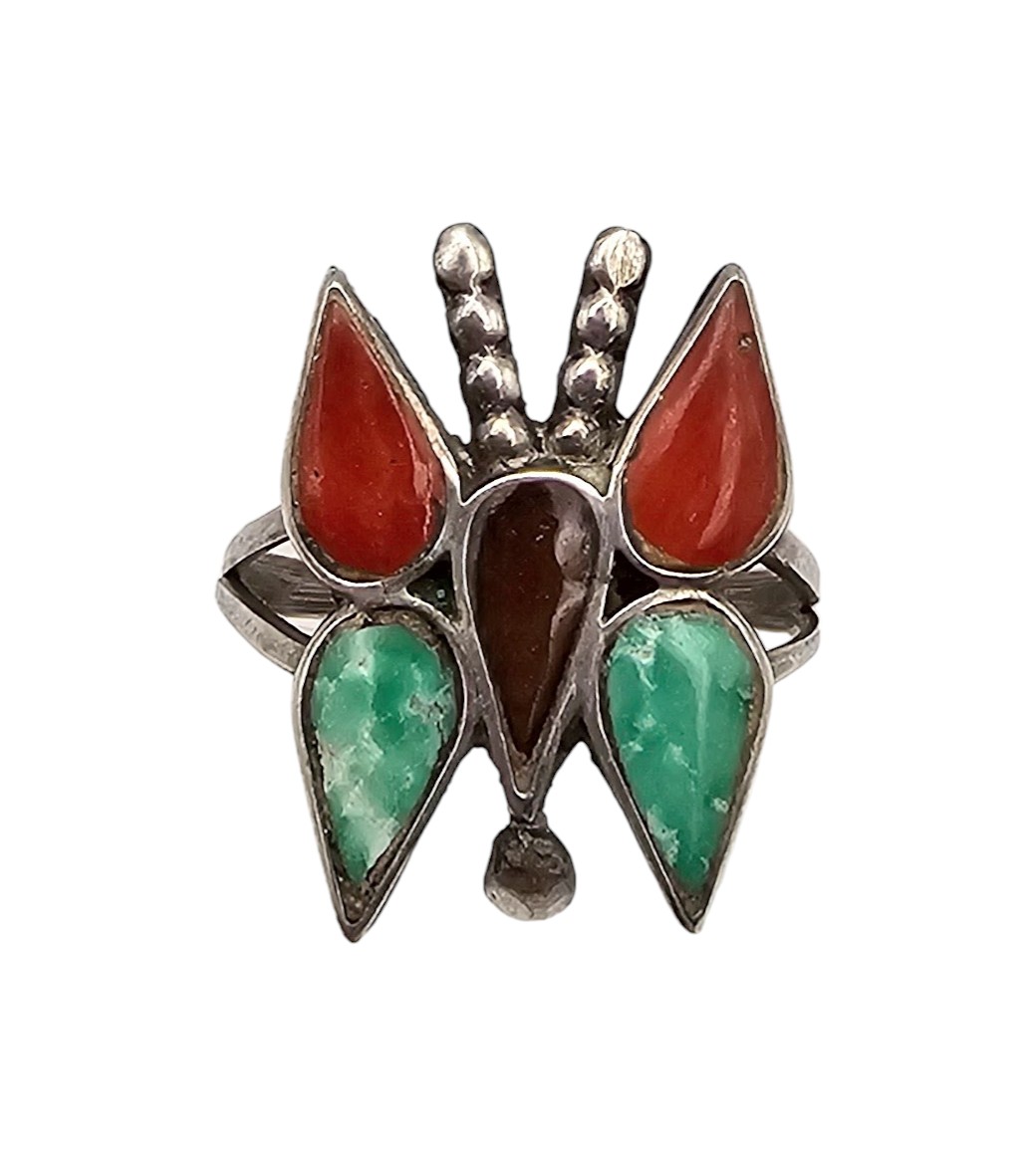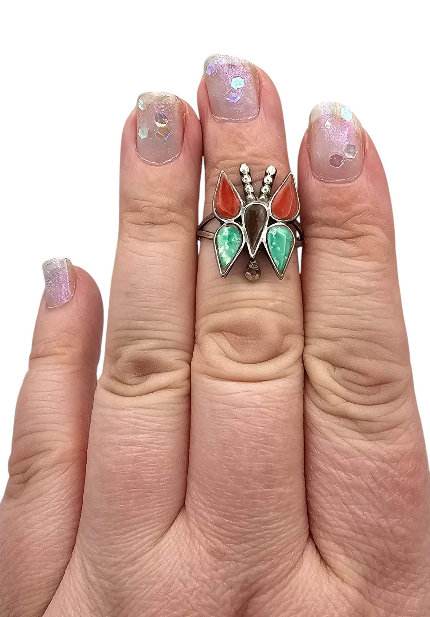 Vintage Southwestern Turquoise Coral Sterling Silver Butterfly Ring Size 5.75