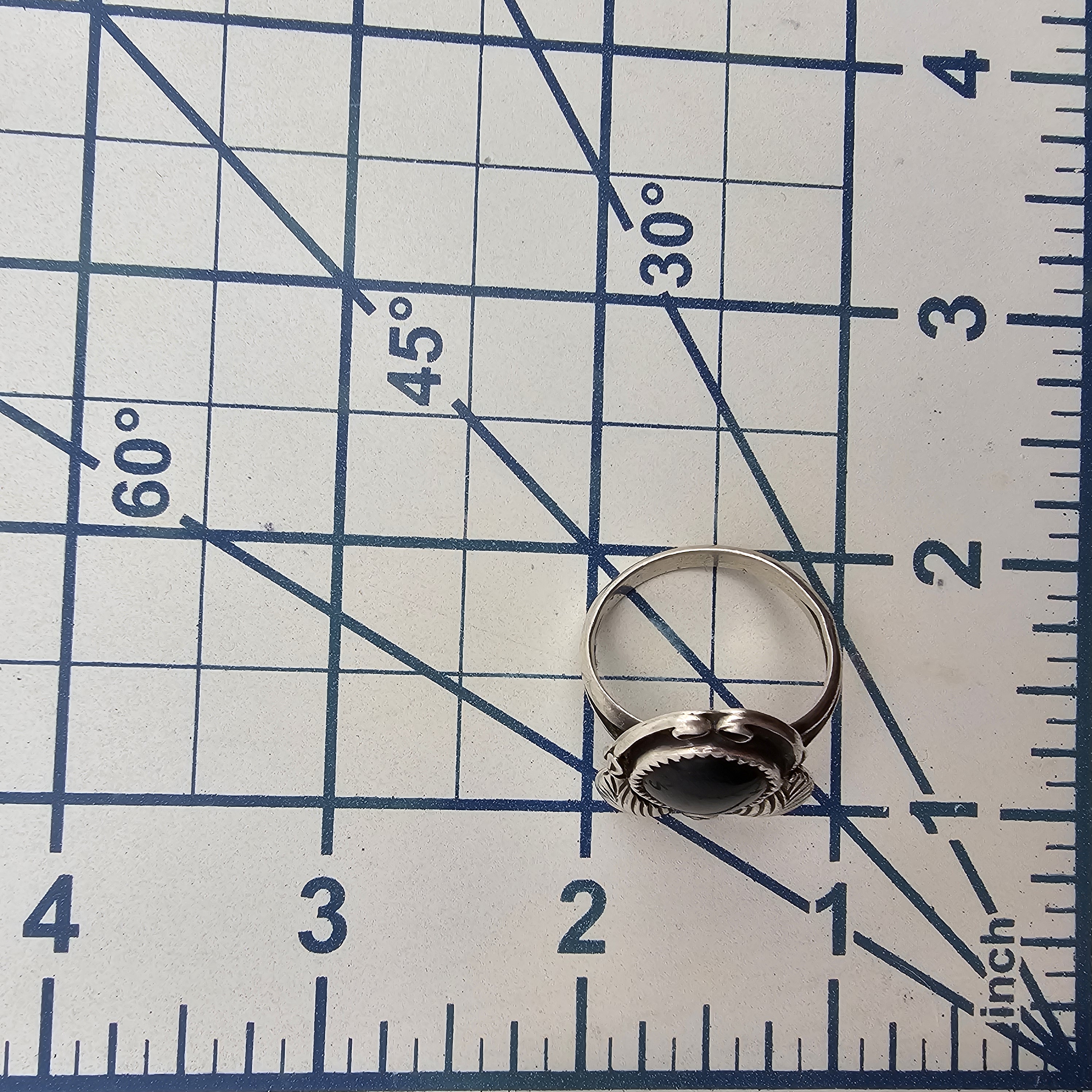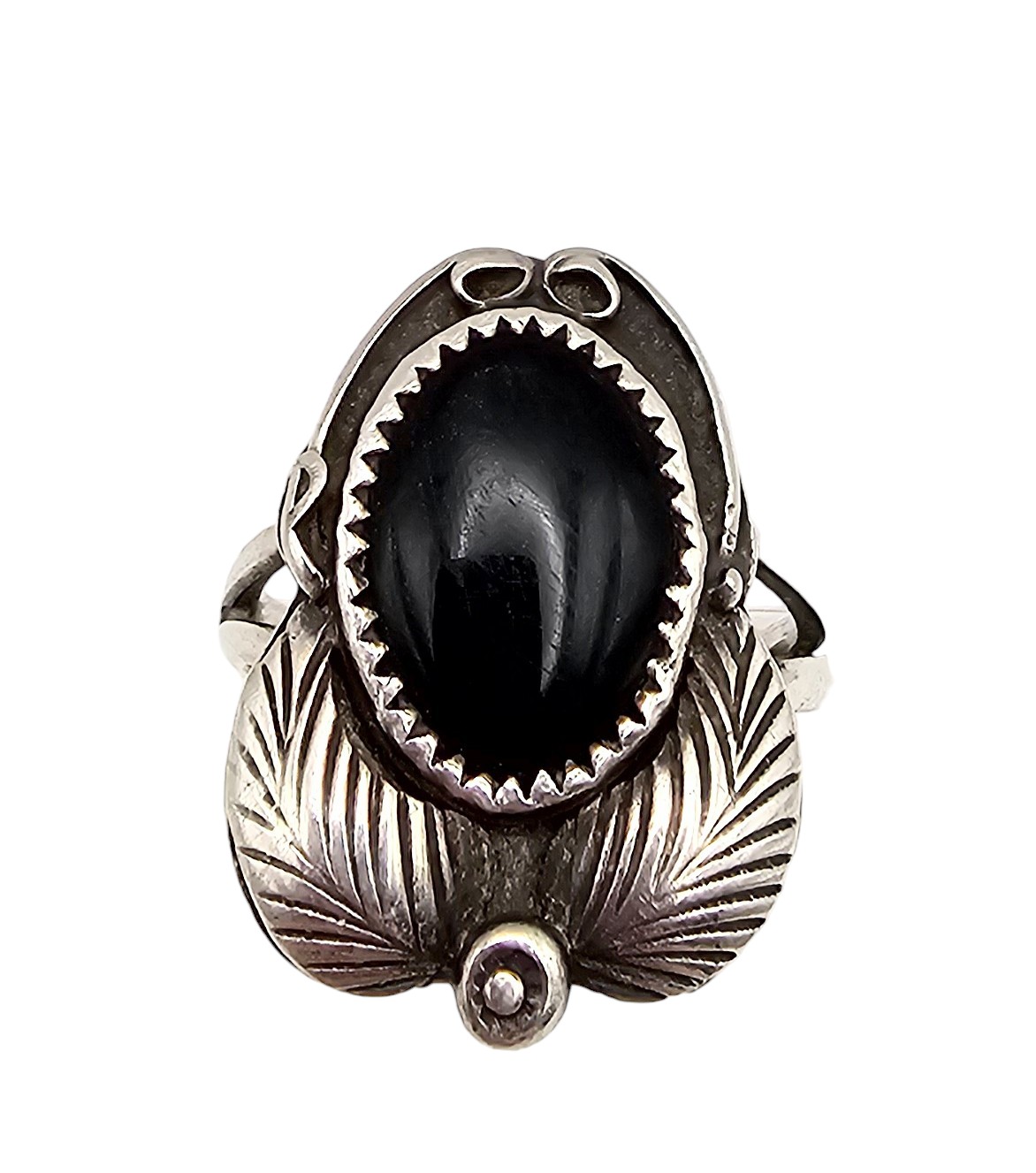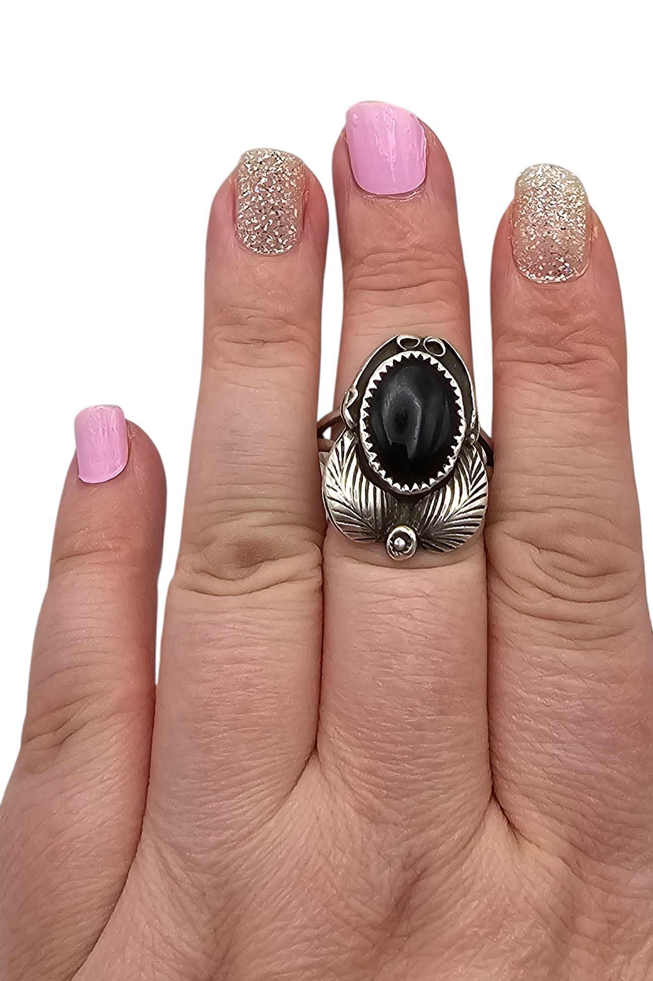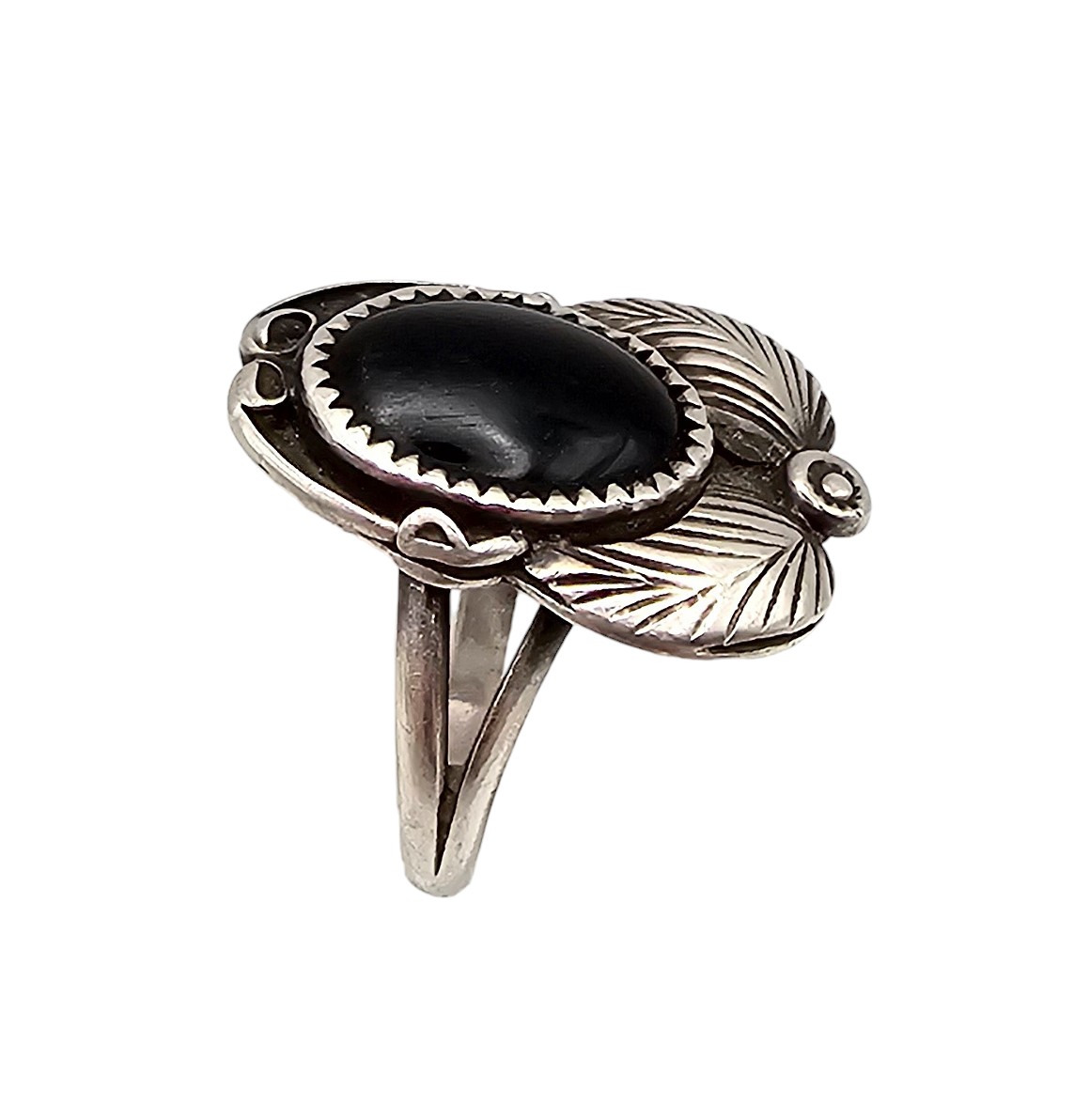 Signed Navajo Onyx Sterling Silver Leaf Design Ring Size 10.5 7 G