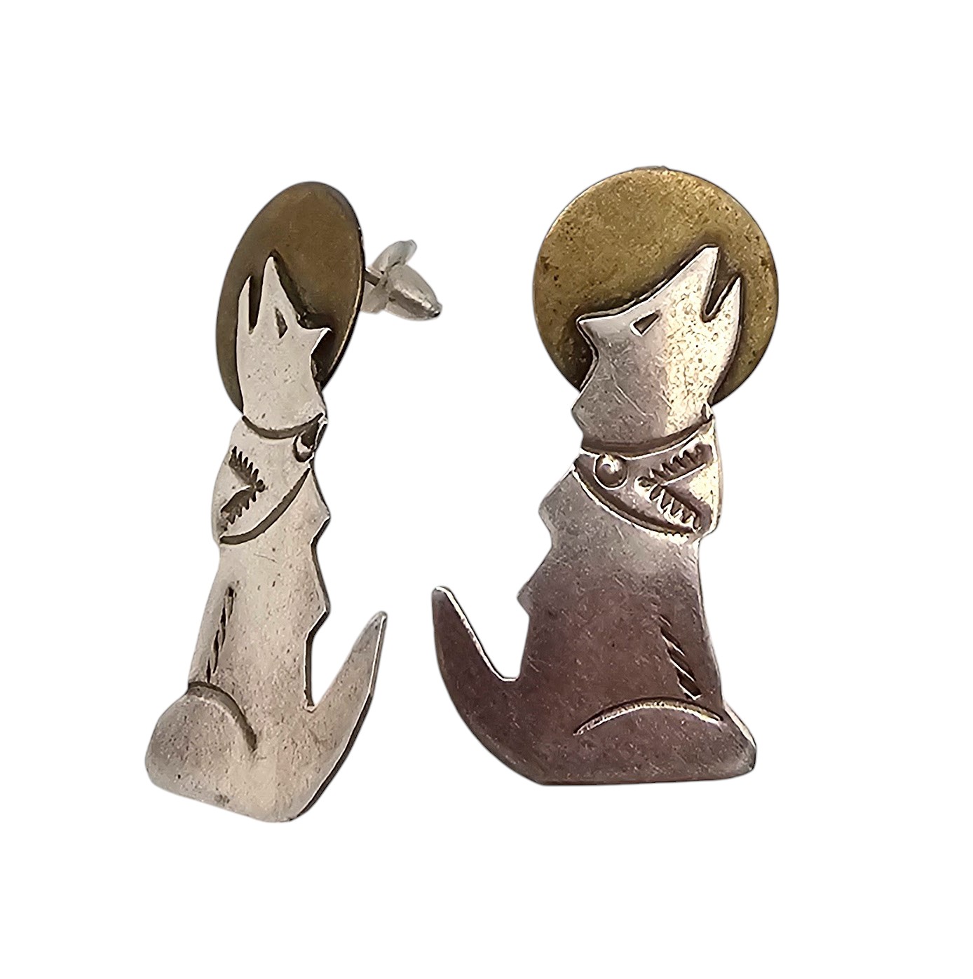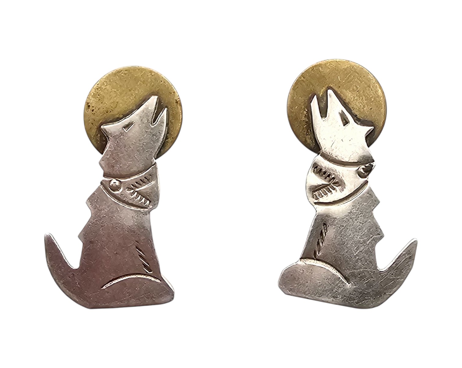 Southwestern Sterling Silver Copper Coyote Howling at the Moon Earrings 3.2 G