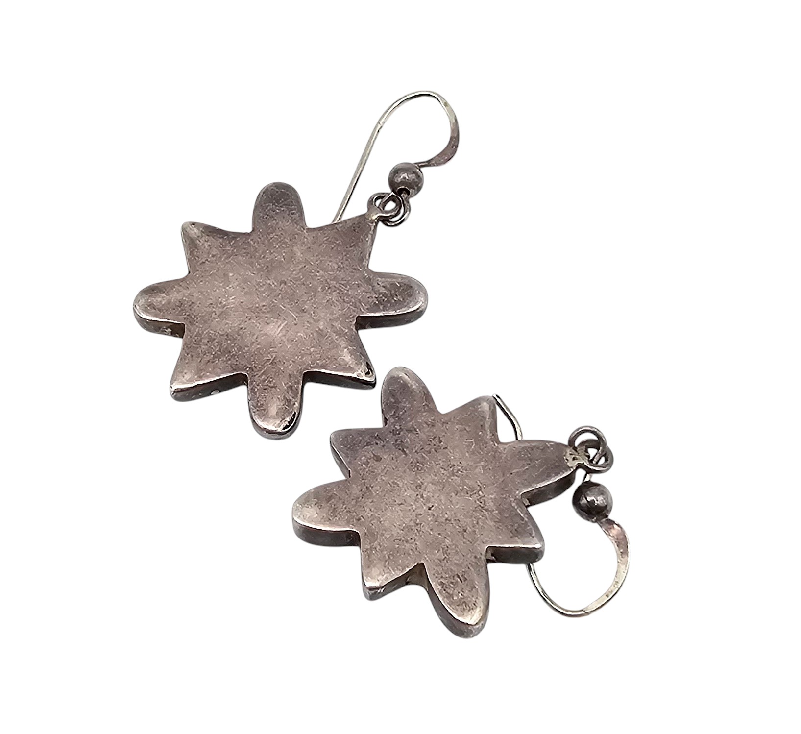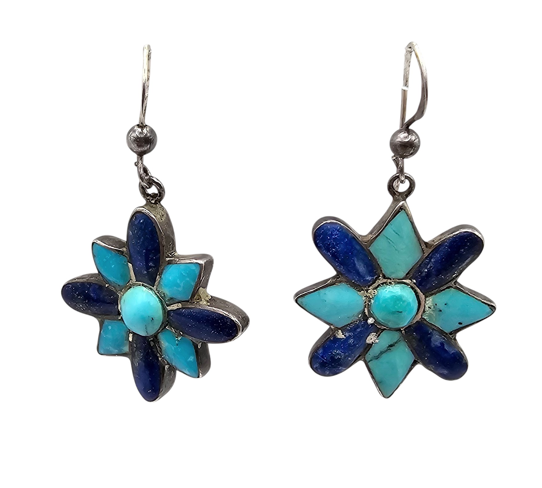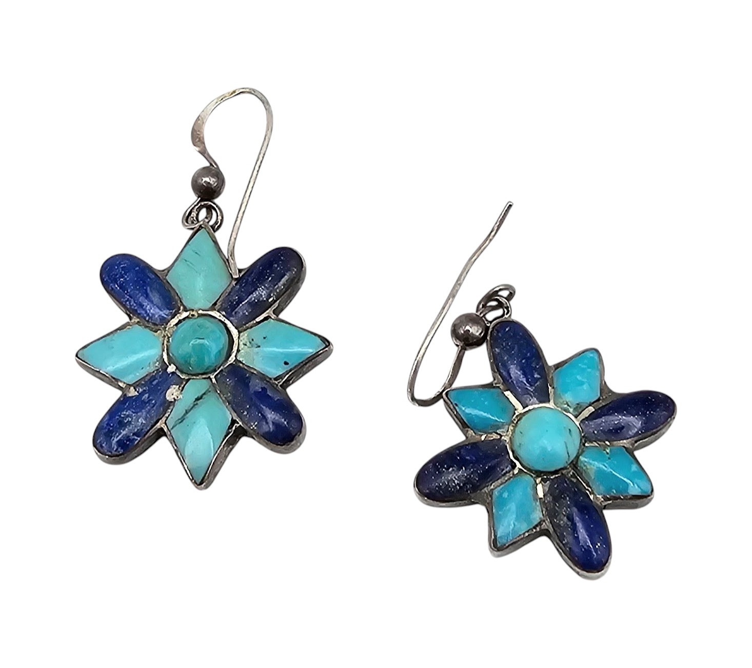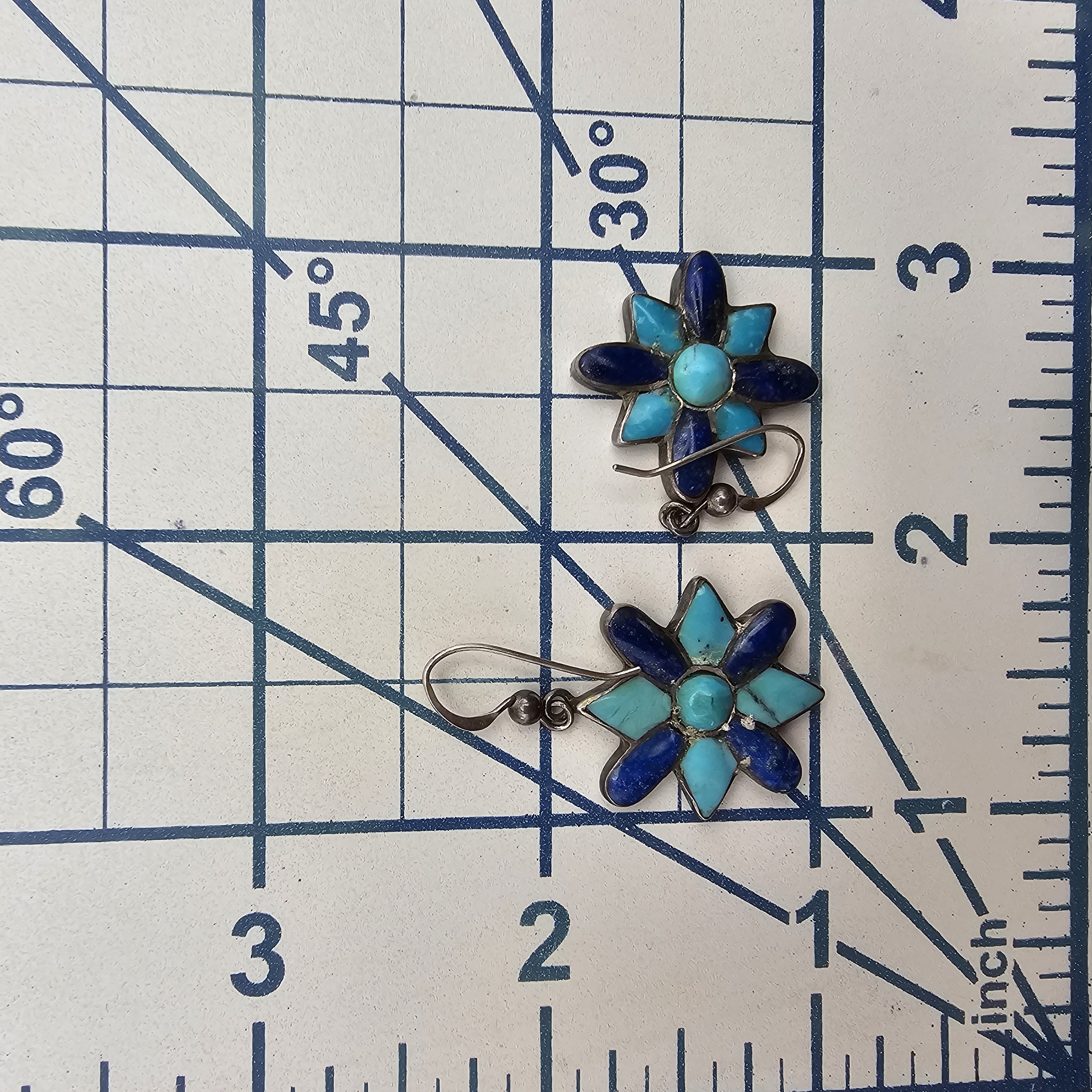 Southwestern Turquoise Lapis Sterling Silver Flower Drop Dangle Earrings 6.5 G
