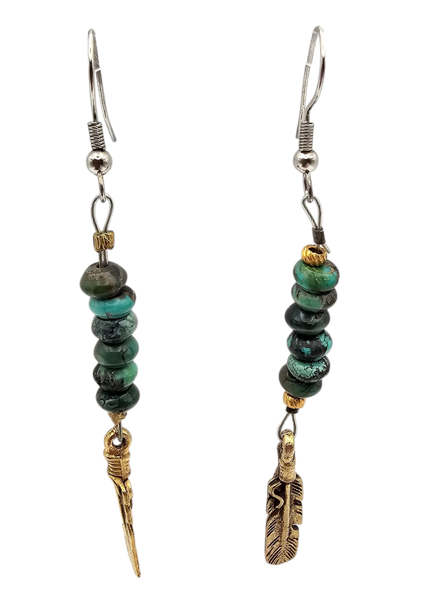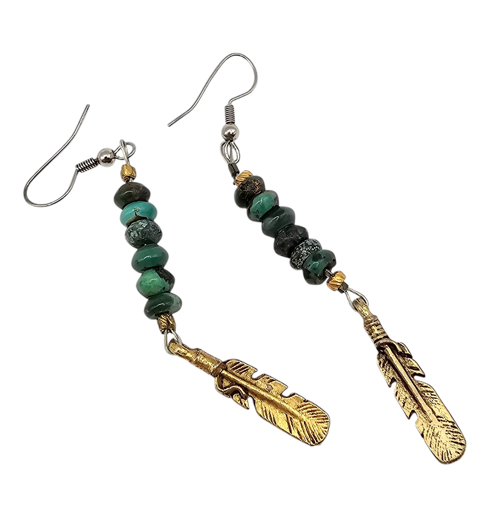 Southwestern Brass Turquoise Feather Drop Dangle Earrings 5.7 G