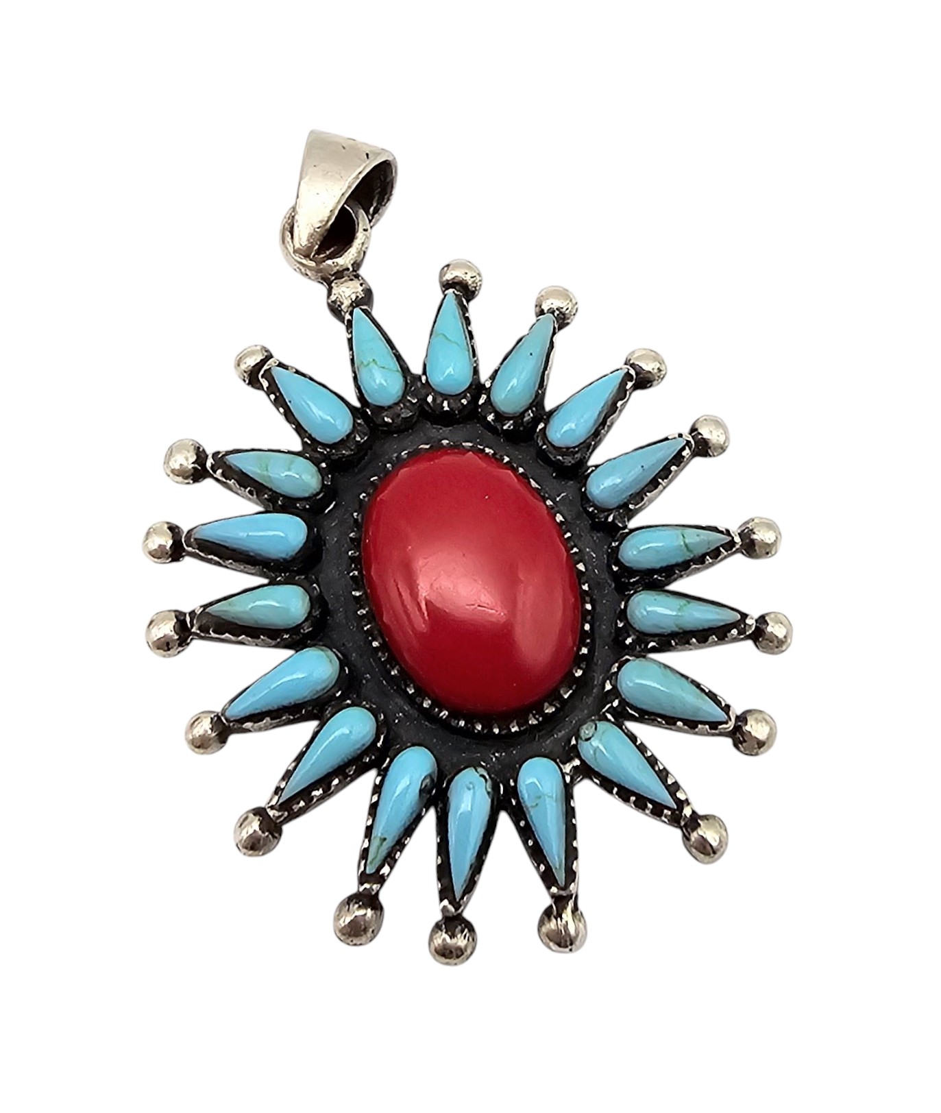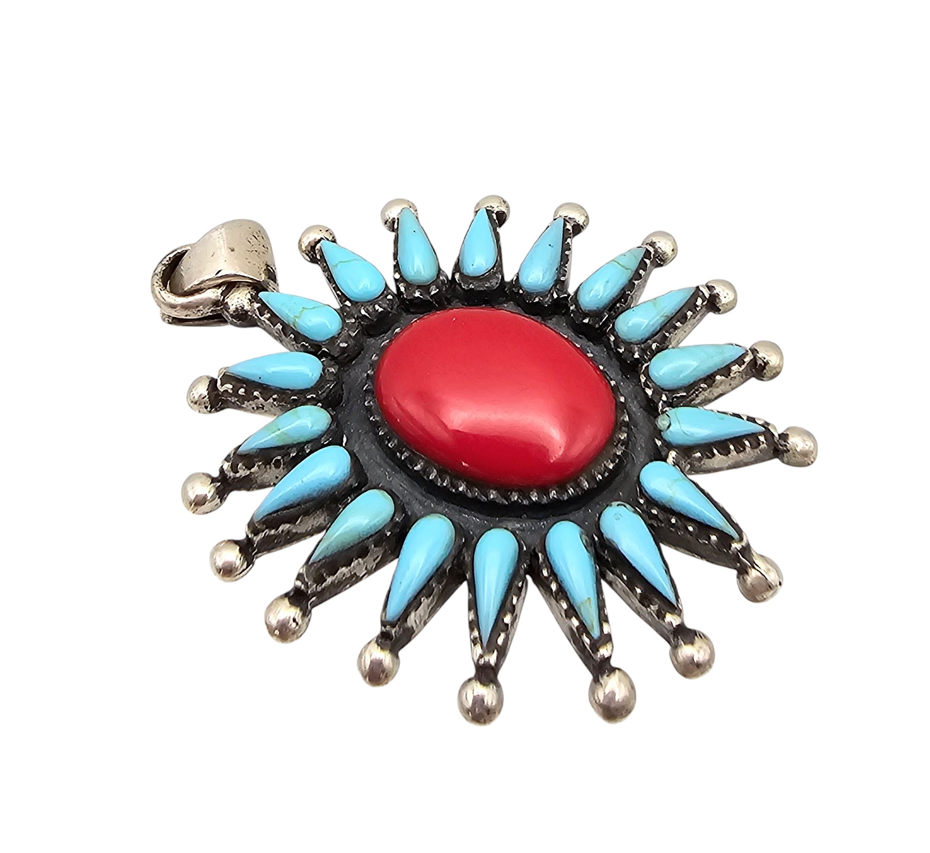 Southwestern Turquoise Coral Sterling Silver Sun or Flower Pendant