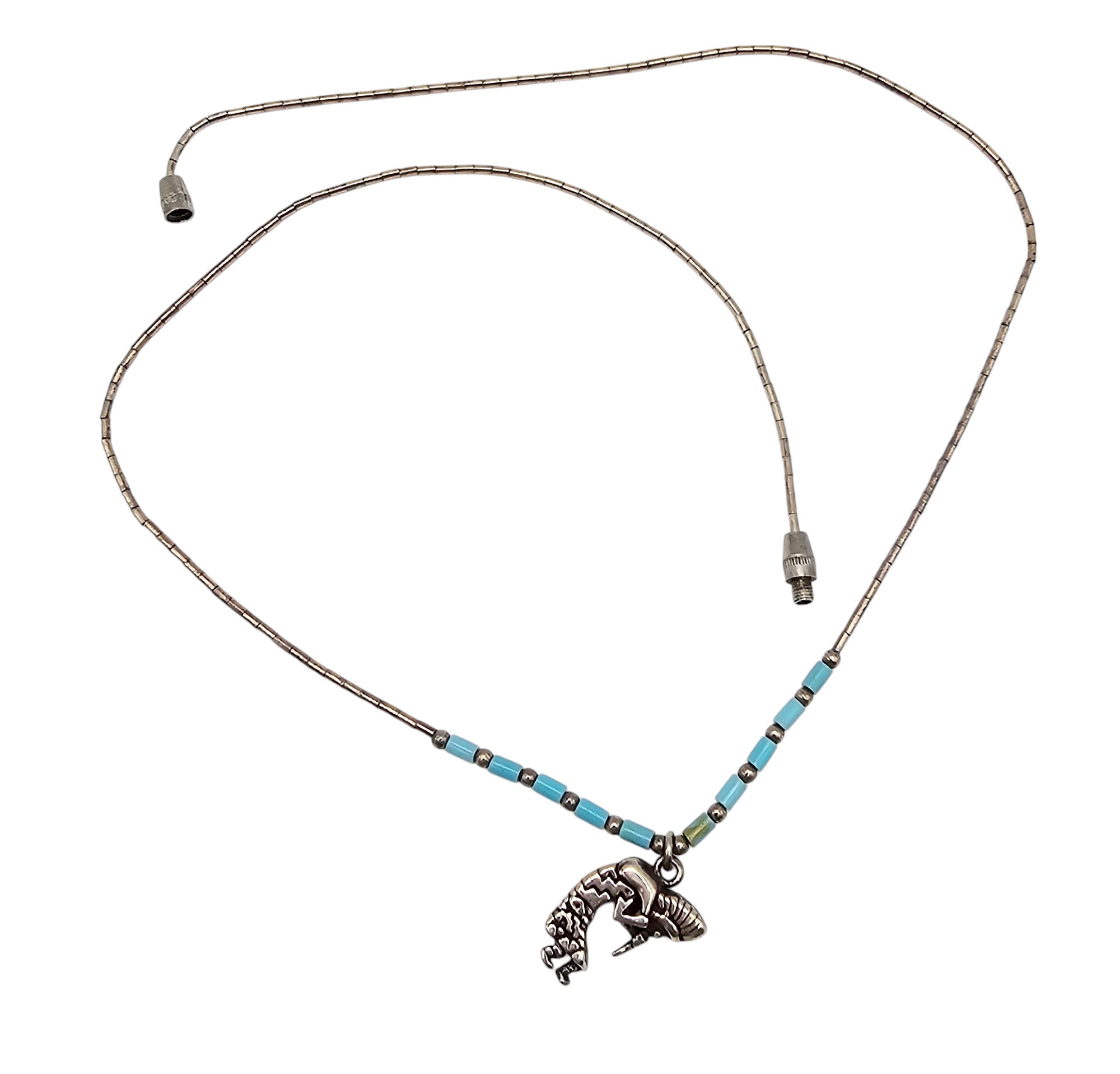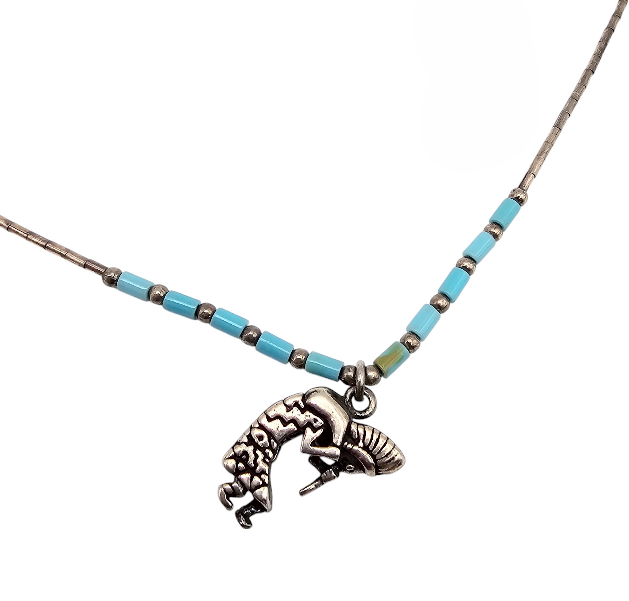 Native Turquoise Liquid Silver Sterling Silver Kokopelli Dancer Necklace 4.1 G