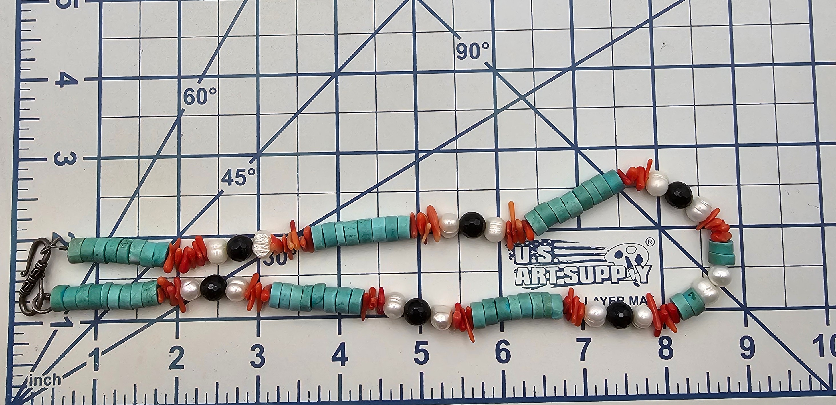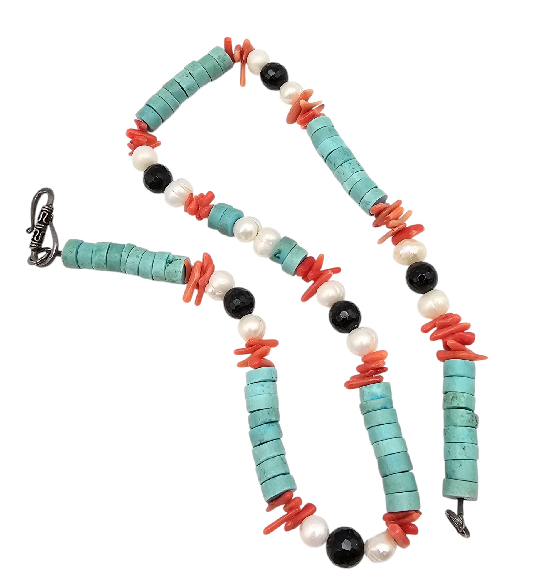 Southwestern Turquoise Pearl Coral Sterling silver Necklace 43.3 G