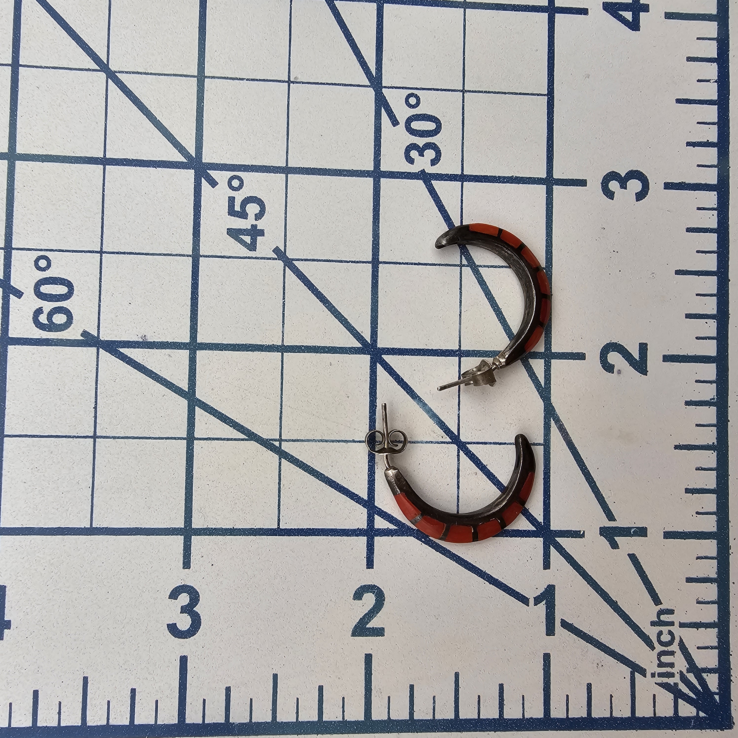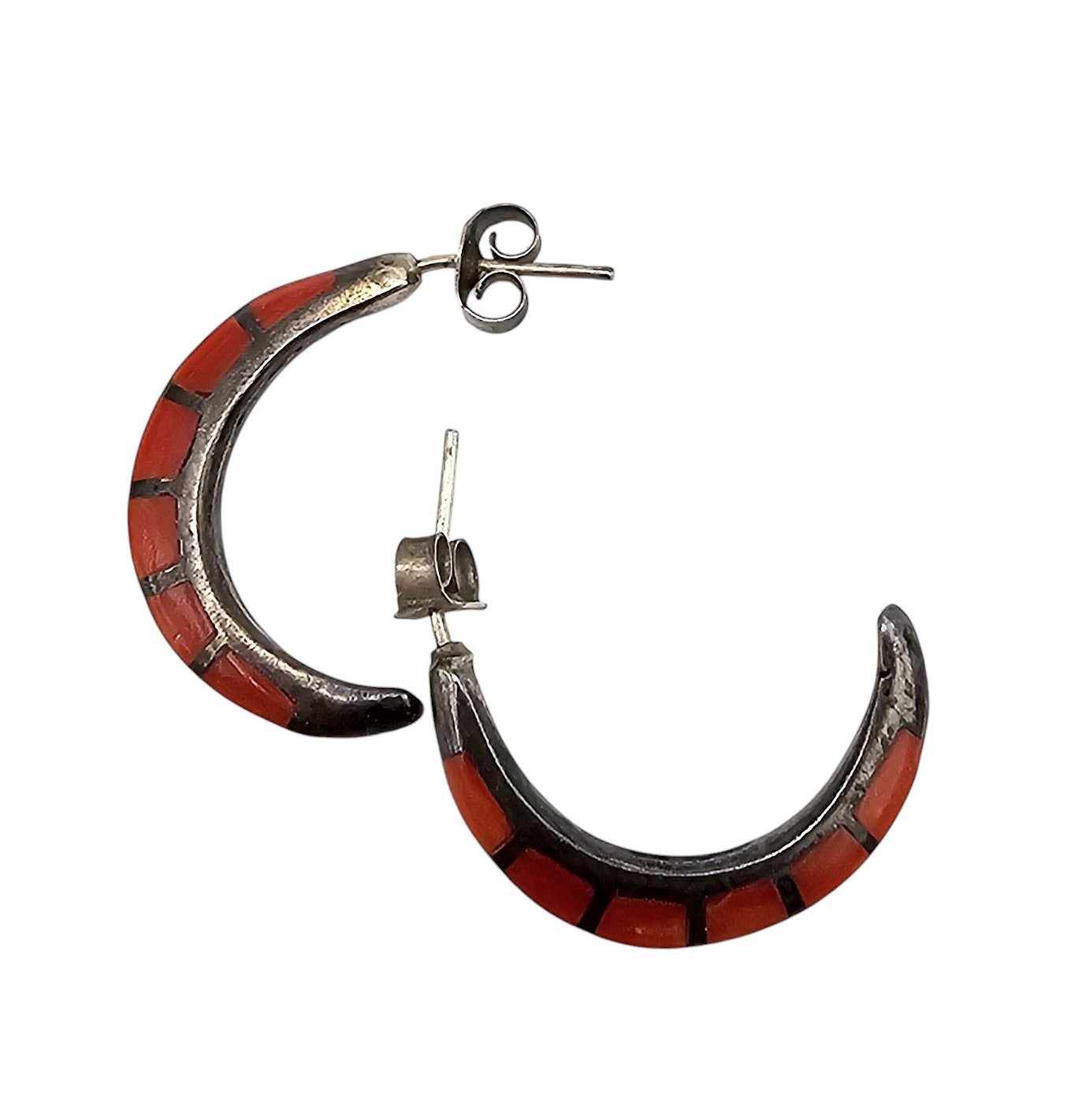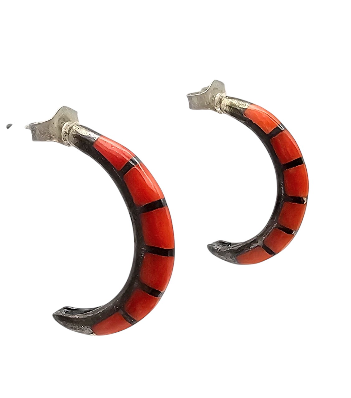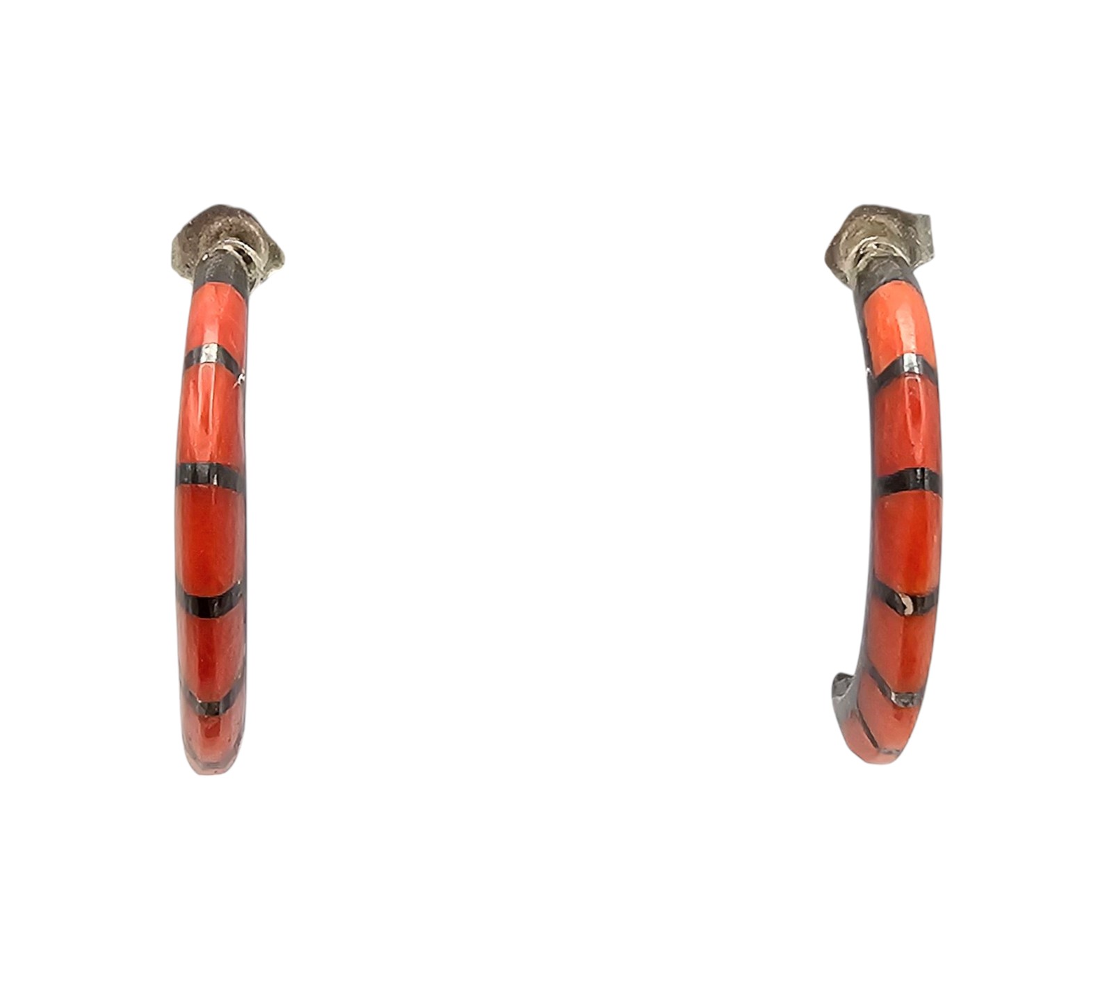 Navajo Coral Sterling Silver Inlay Hoop Earrings 3.1 G