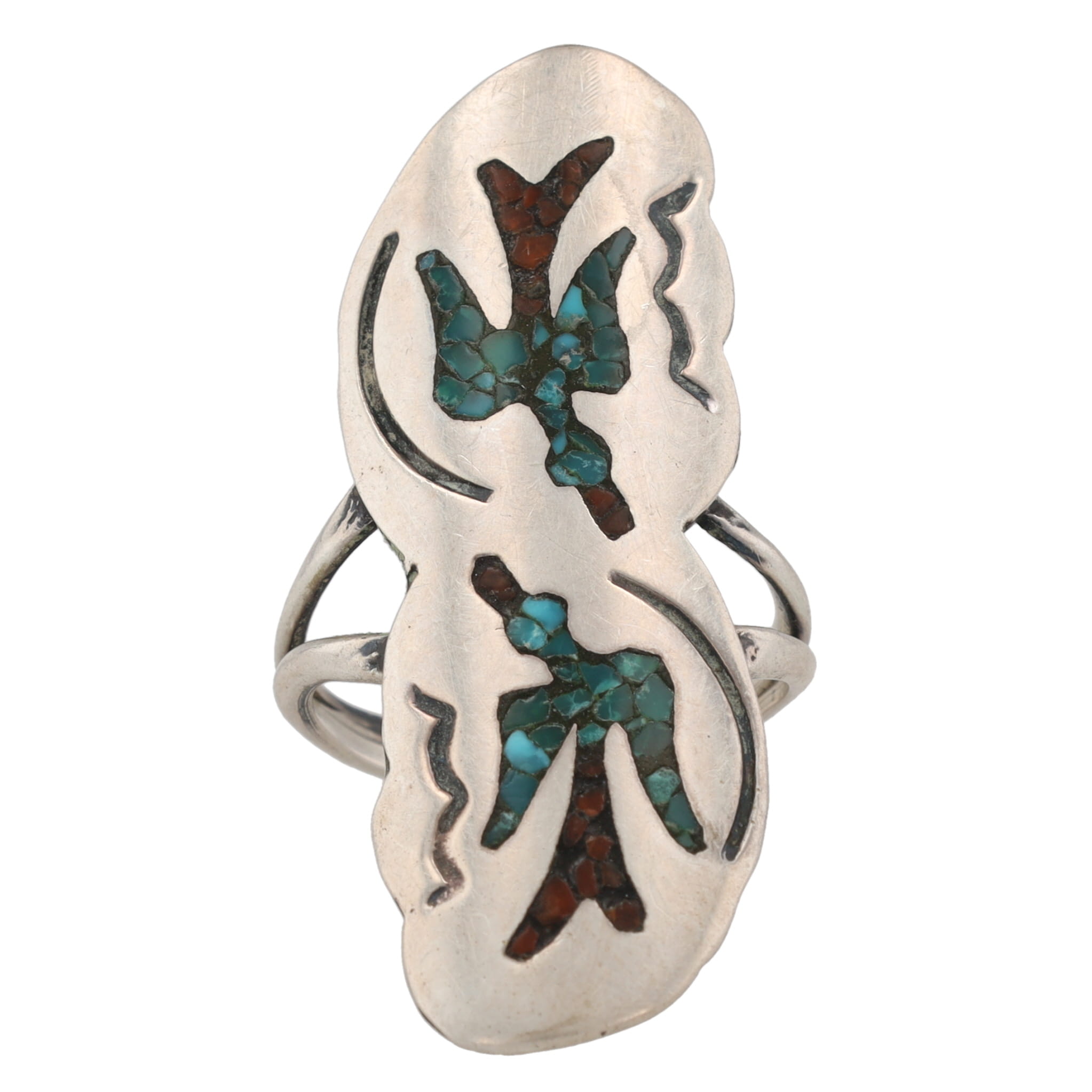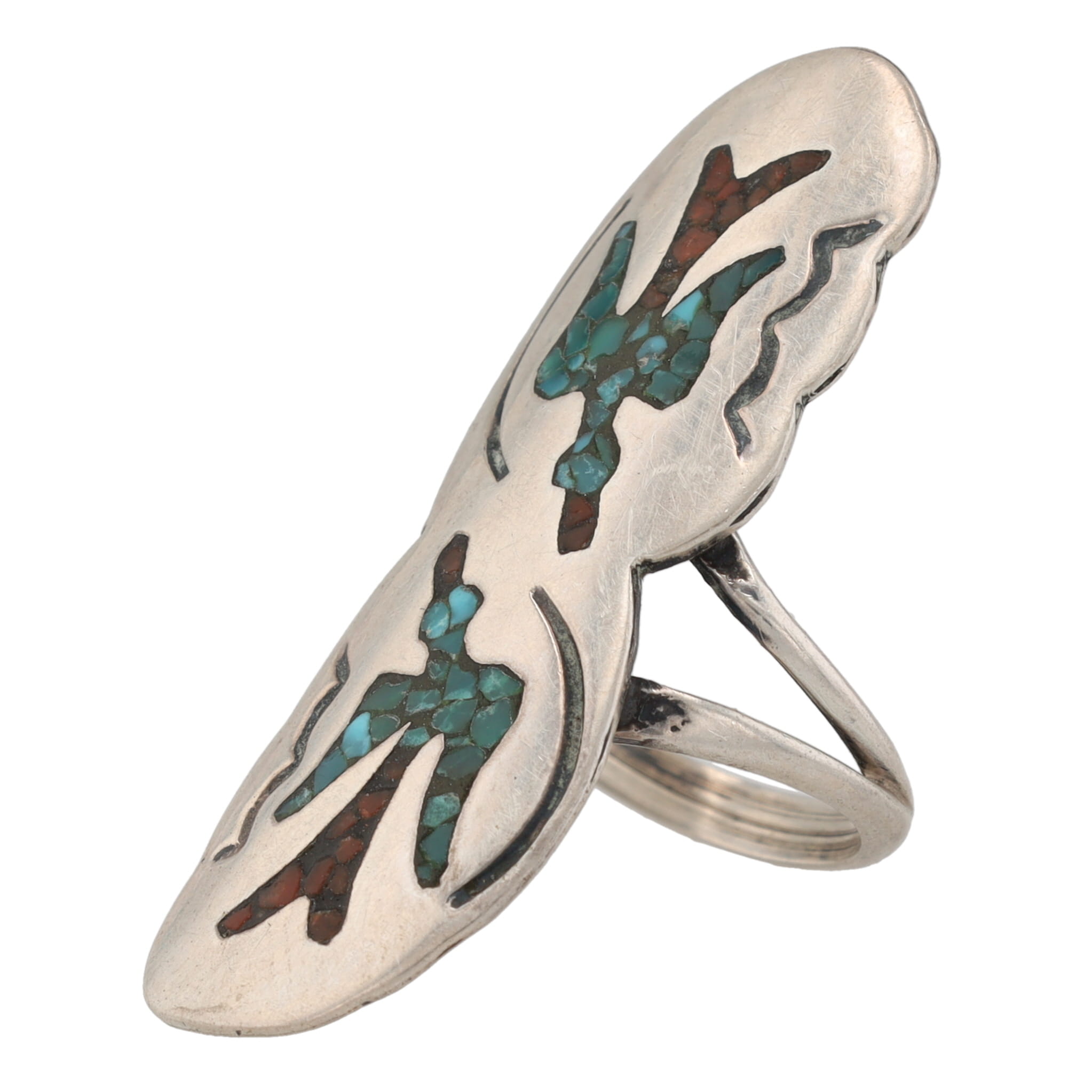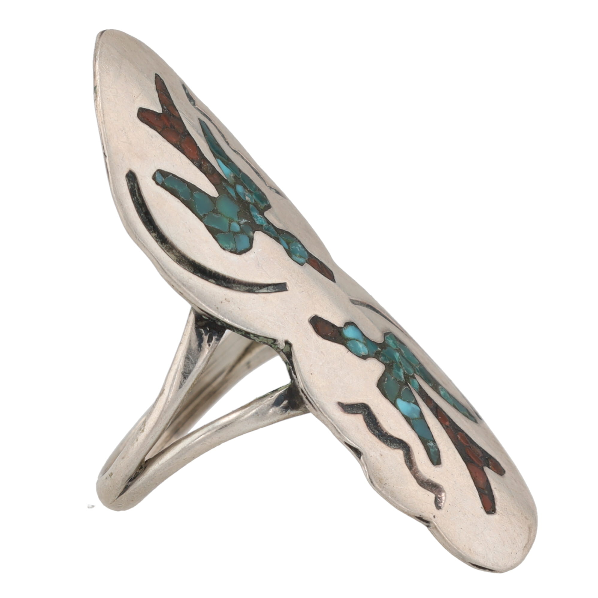 Vintage Navajo Crushed Turquoise Coral Sterling Inlay Thunderbird Inlay Ring Sz. 6.25, 6g